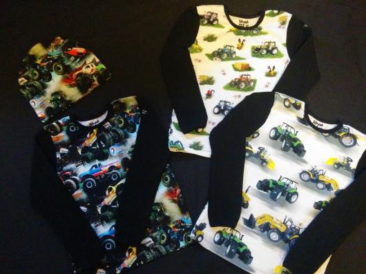 Det har blivit några barntröjor senaste veckorna och här kommer några till :) Först ut var tröjorna med svart mudd. Största i storlek 128/134 och minsta i 92. Lite trixigt är det att lyckas kombinera tygerna så att de lite större barnen vill använda kläderna. Men monstertrucks har varit populärt här hemma så jag hoppas även andra tycker om dem.