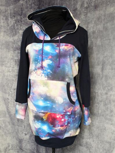 En tröja med rymdmotiv. Mysig ficka på magen och stor huva. Storlek XS