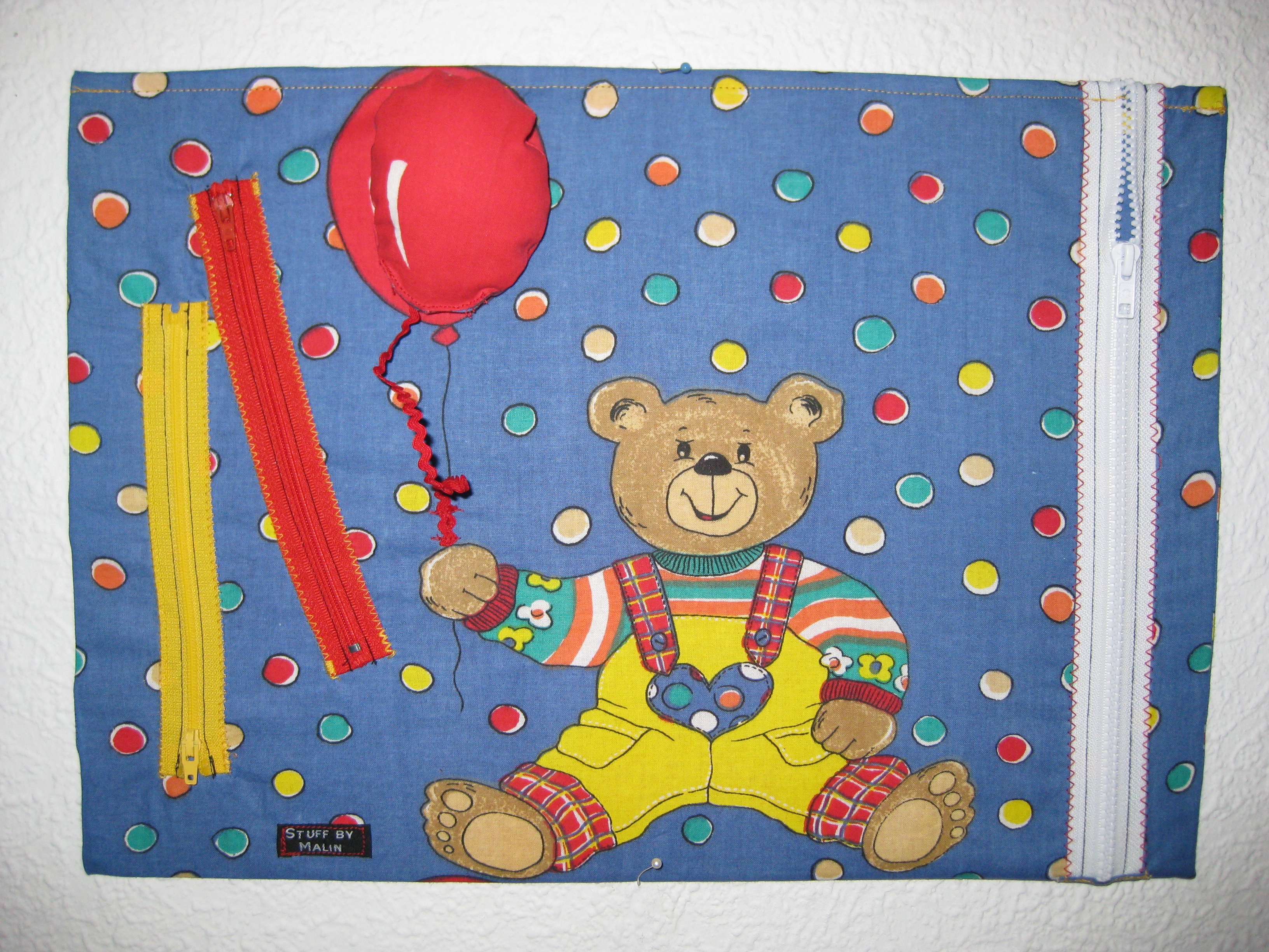 En aktivitetstavla sydd till dagis. En av de små killarna där kommer alltid fram till min jacka när jag lämnar Oliver och vill dra dragkedjan upp och ner...Så nu hopas jag att han och de andra barnen får glädje av denna. Ballongen sitter fast med kardborre. Innuti är det en kartongskiva för att den ska bli lite stadigare.