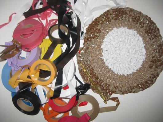 Just nu har jag fått för mig att virka en plastmatta. Morfar kom med en påse gamla plastband och då måste man ju prova. Hittills har det blivit en plätt på ca 25 cm i dameter men förhoppningsvis växer den sig större allt eftersom. (Om jag någonsin kommer komma till mattstorlek tvivlar jag på men jag gör ett försök :))