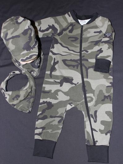 Ett babypaket har fått en ny ägare. Denna gång i en lite tuffare variant i camouflagetyg och med skärmmössa. Storleken på just detta är 74.