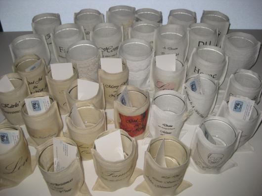Sen har jag sytt ljuspåsar. Helt suveränt om man ska på middag och "måste" ha en liten present. Går att ge bort med en liten blomma i om man vill göra det ännu finare. Även denna går att beställa med valfri text eller symbol. Kostar 100 kr.