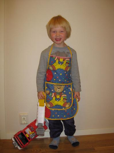 Sist men absolut inte minst så måste jag ju visa mitt lilla troll som ville ha ett förkläde. Vi satt och läste Castor syr och sen var det bara att sy med Oliver i knät :) Tyget och färgen på banden och tråden har han valt själv. (Det var dock jag som bad honom skratta på kortet :))