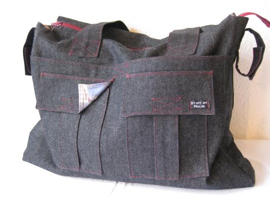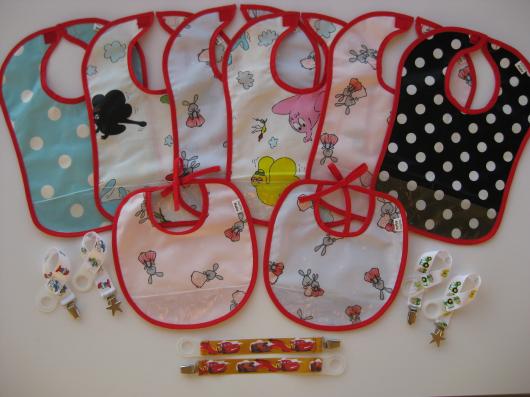 ...den röda tråden har fått dominera maskinen ett tag och en bråkdel av alla haklappar är färdiga. Alla har transparenta fickor fram för matrester.