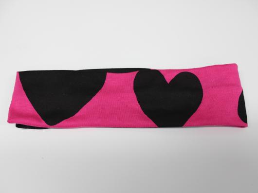 Först ut att bli sydd i "nya" rummet blev detta lilla söta pannband. Tyget är ceriserosa med svarta hjärtan. Tog lite tid innan jag fått alla maskiner precis som jag vill ha dem. Men nu tror jag det ska funka. Och tösen som pannbandet var ämnat för var oxå nöjd och det är ju huvudsaken :)