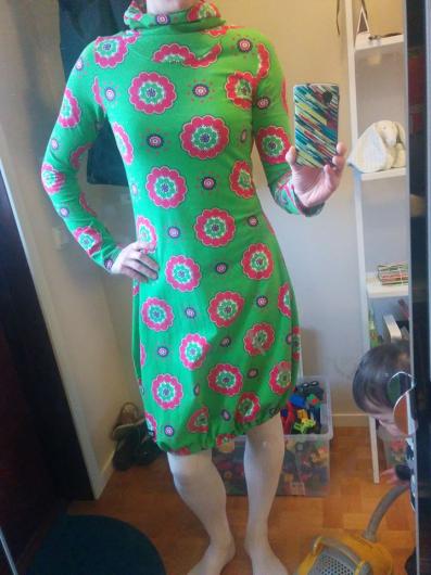 Börjar med en klänning jag sydde redan i vintras. Mycket skön med stor krage och långa ärmar. Den har även fickor så telefonen kan bo någonstans.