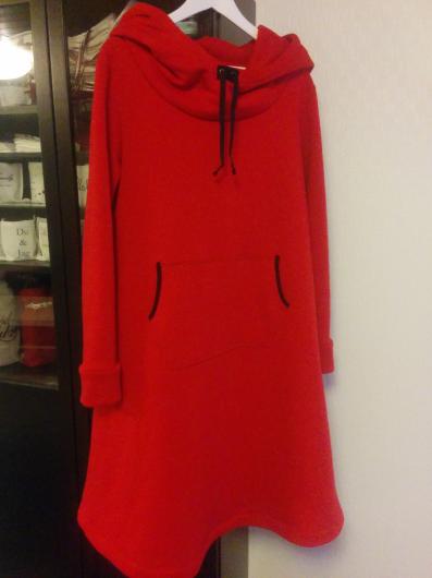 Det var otroligt länge sedan jag sydde "vuxen"kläder. Men en tjej hörde av sig och ville beställa en myskänning. Så sagt och gjort, här kommer en bild på mysklänningen som den blev. Härligt röd college med flossad insida och svarta detaljer för att bryta av lite mot allt det röda :)