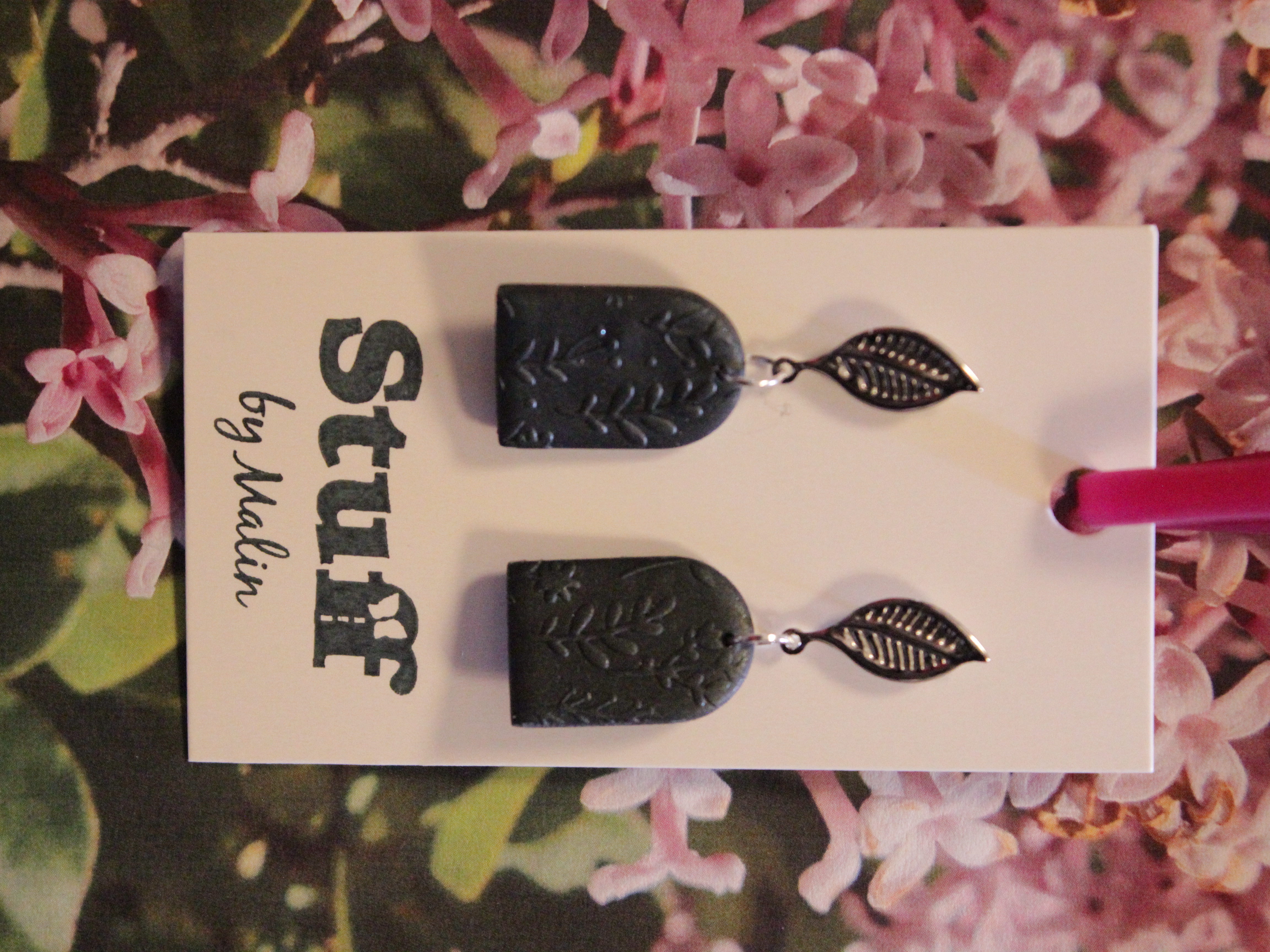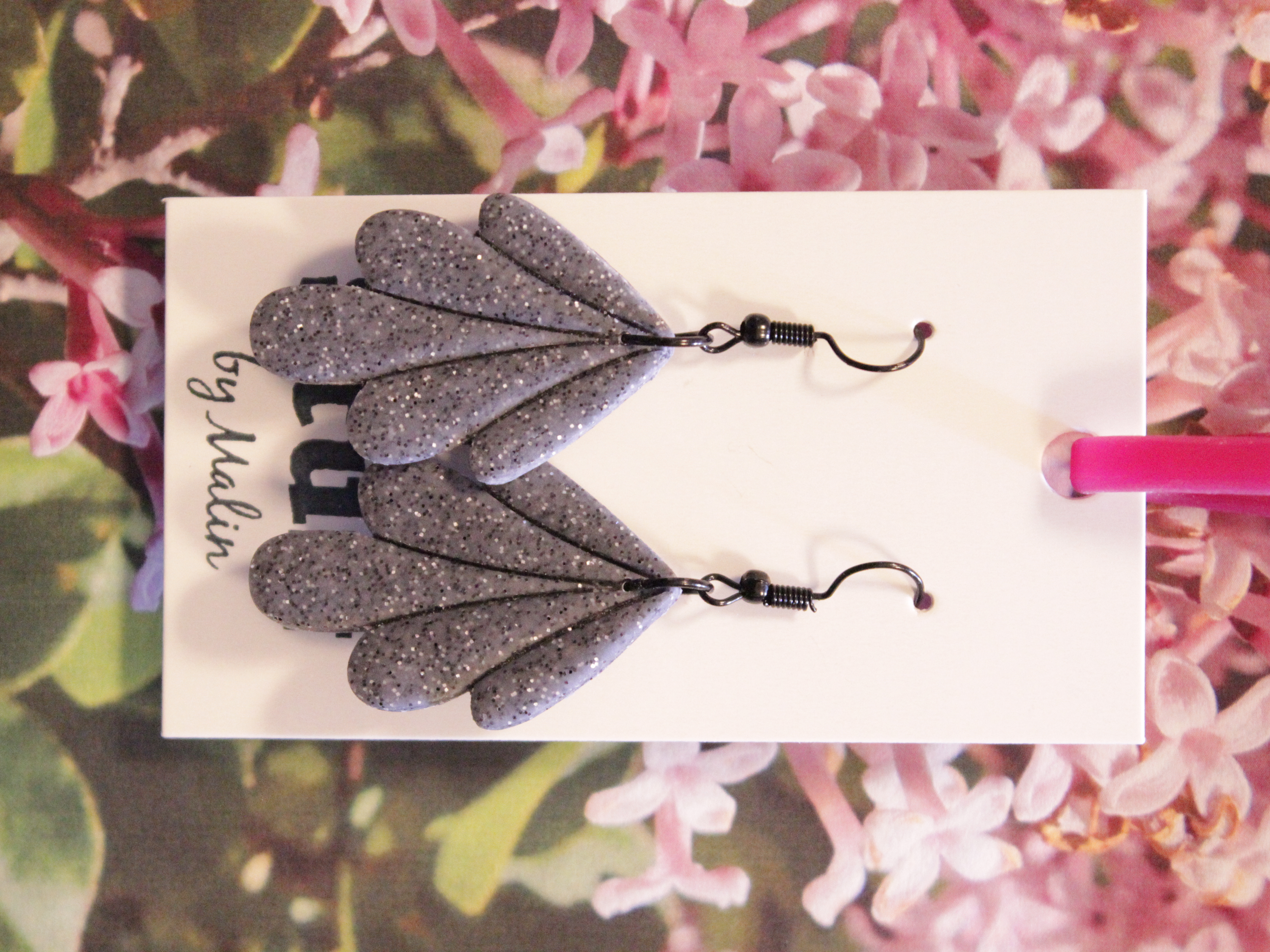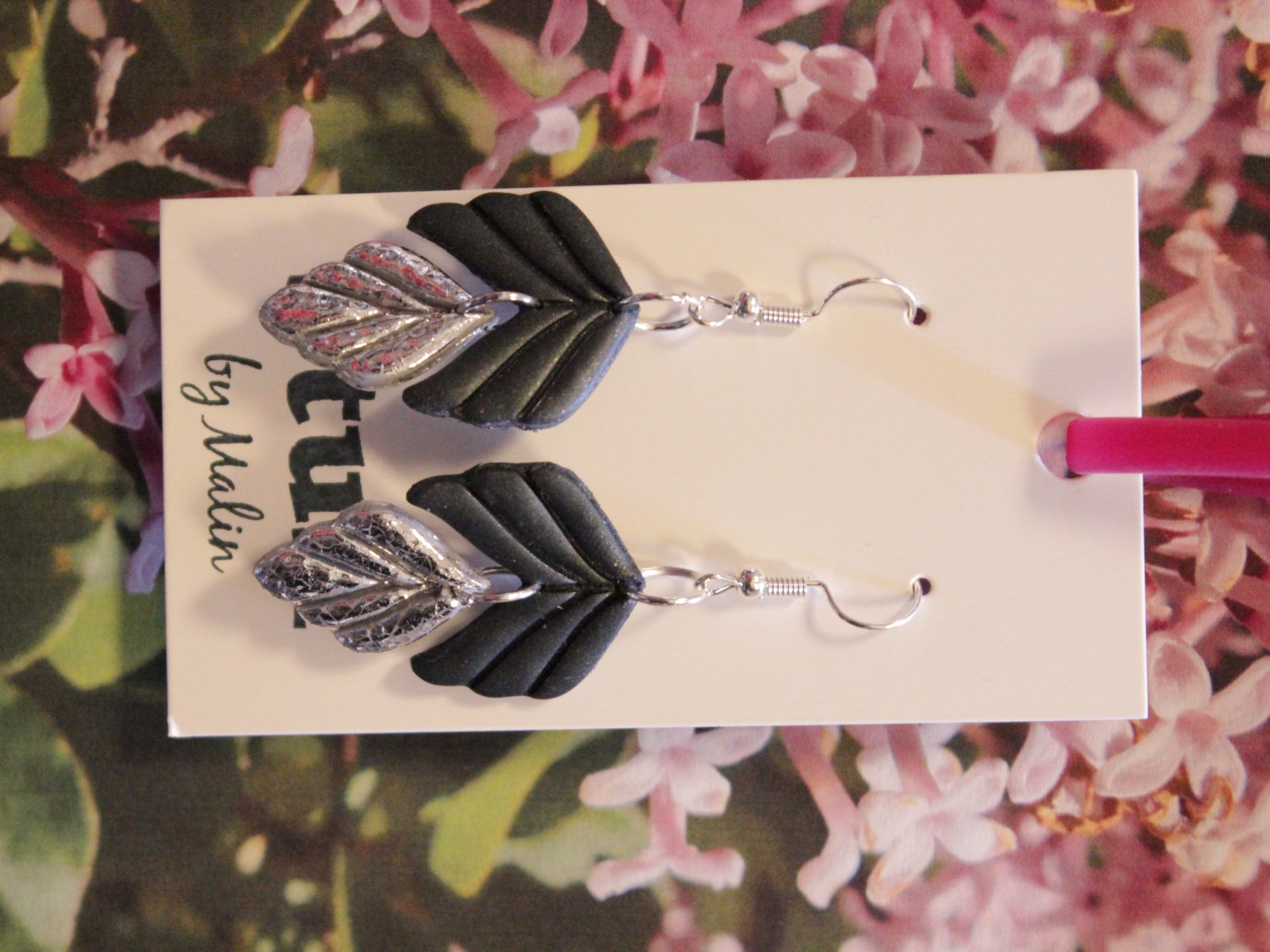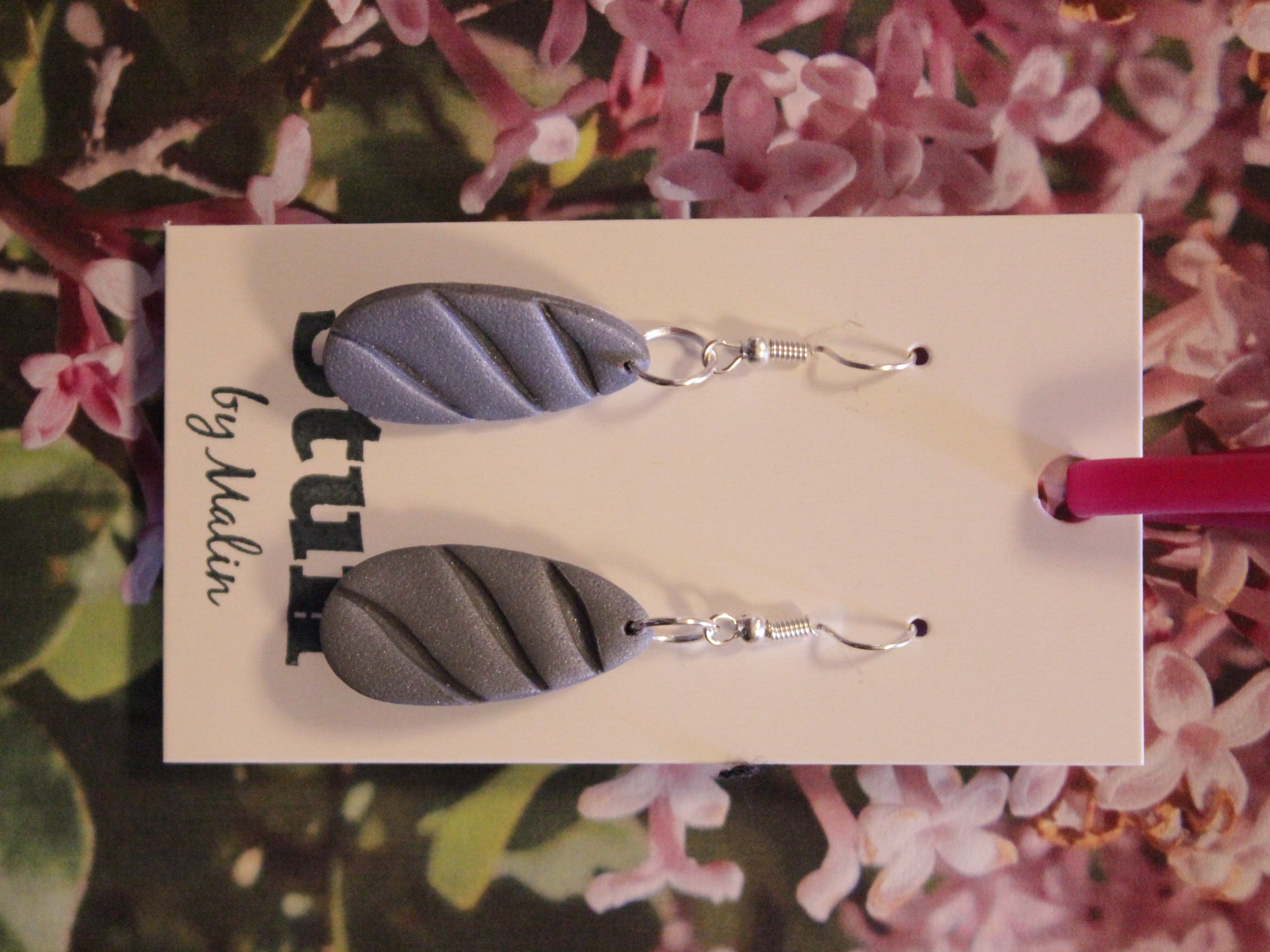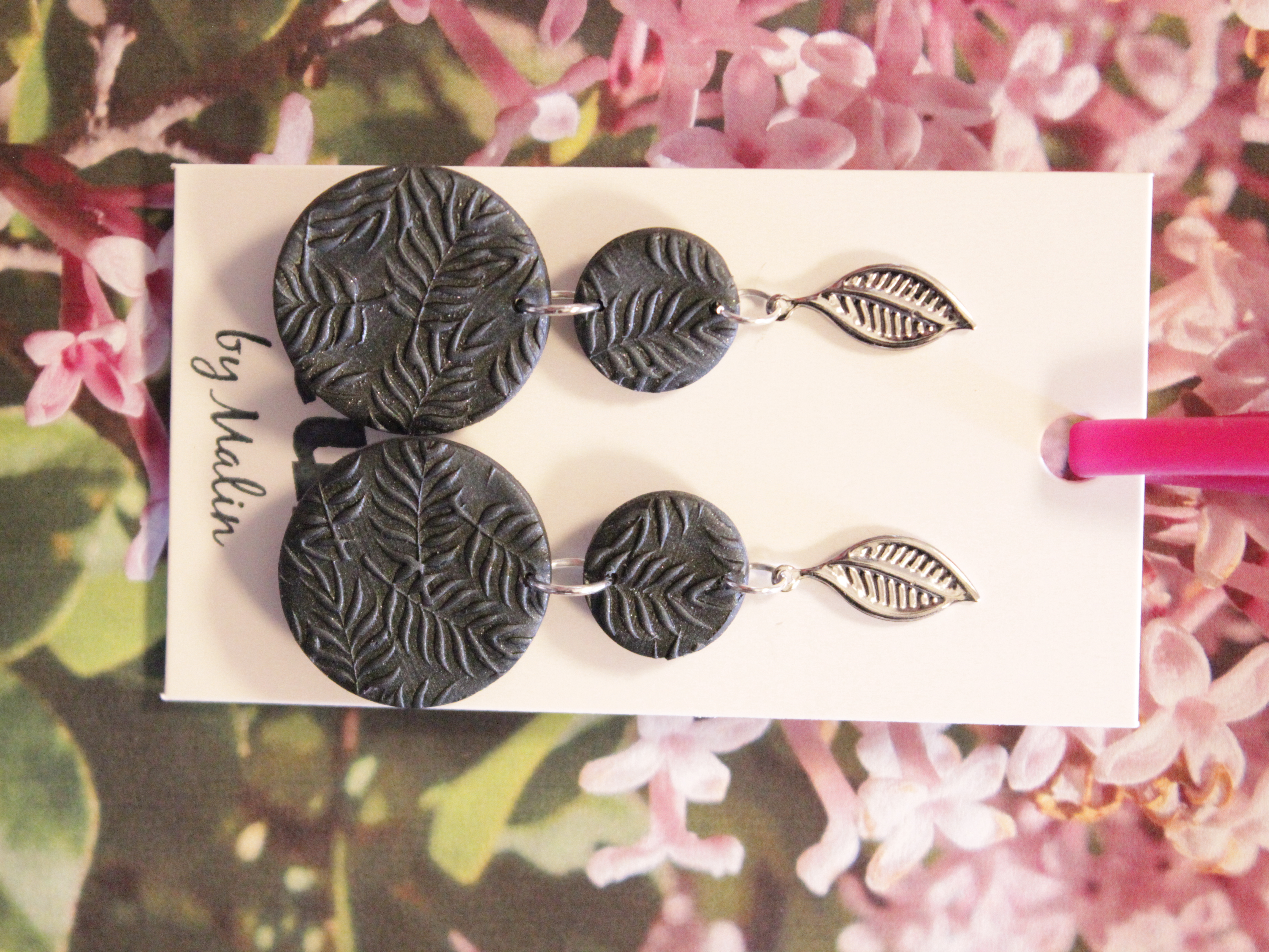Örhängen tillverkade av polymerlera, pärlor och/eller metallberlocker av olika slag. Alla öronkrokar och stift är nickelfria. Smycken tillverkade av polymerlera är efter härdning i ugn mycket lätta och aningen flexibla.