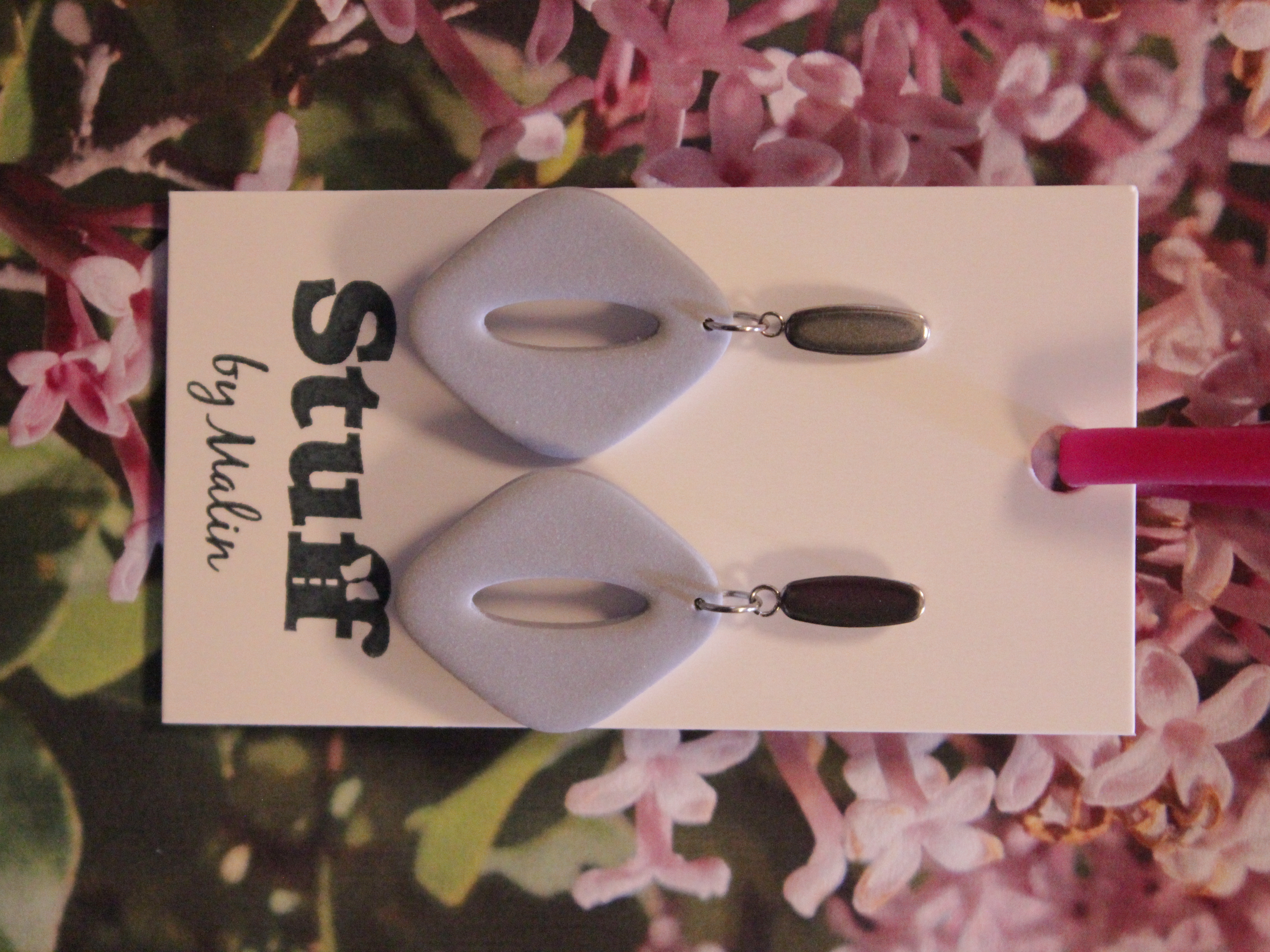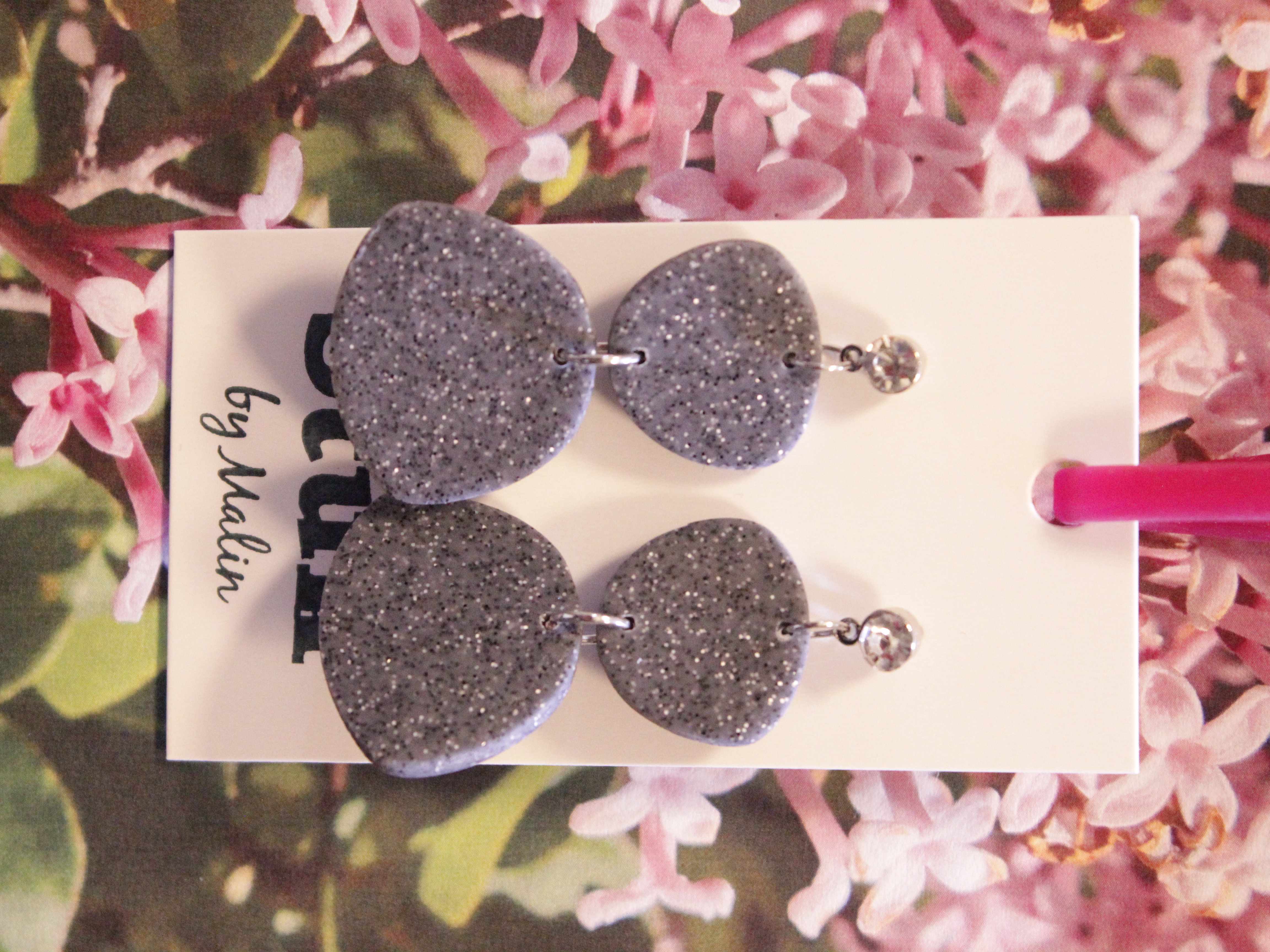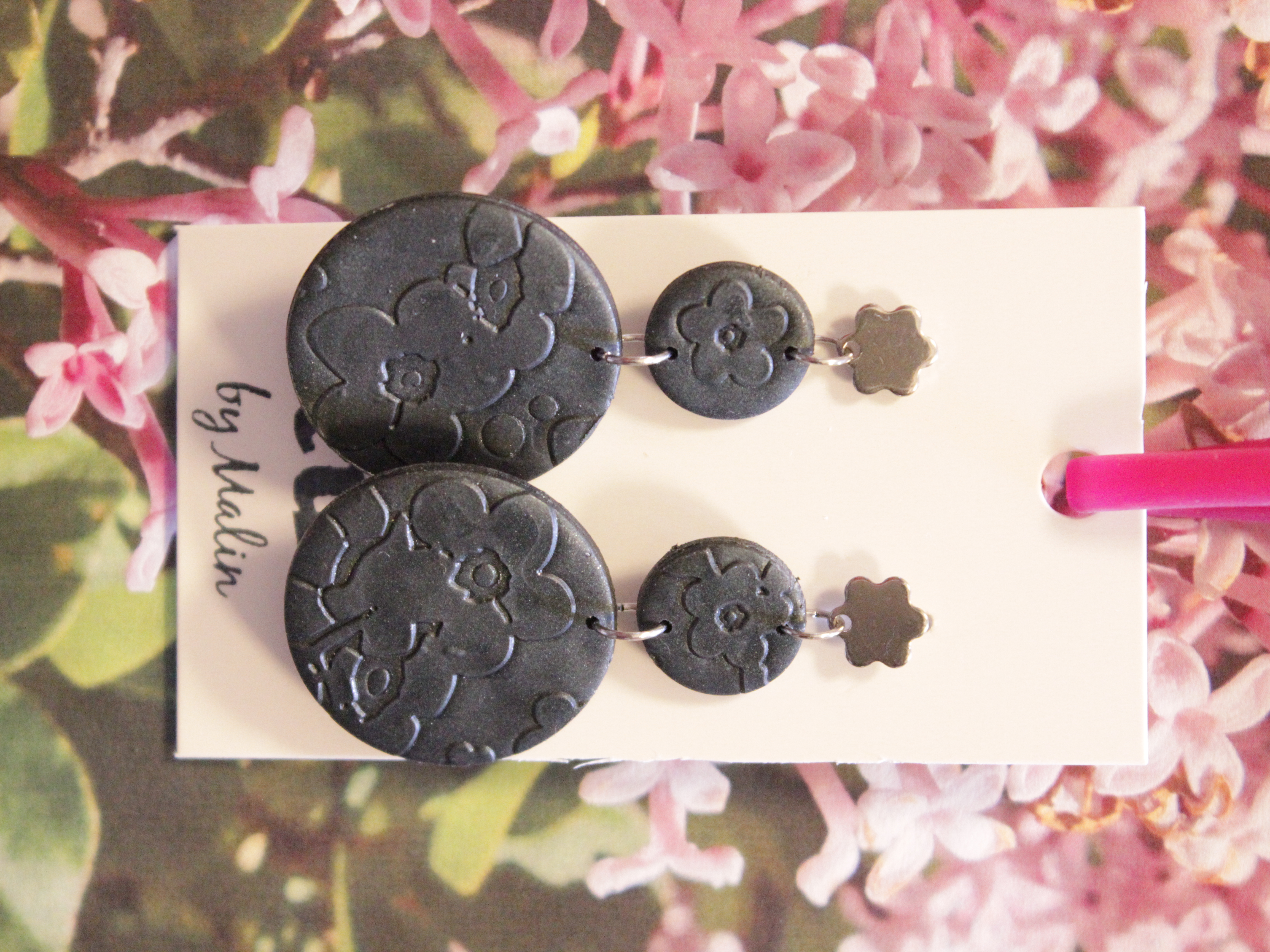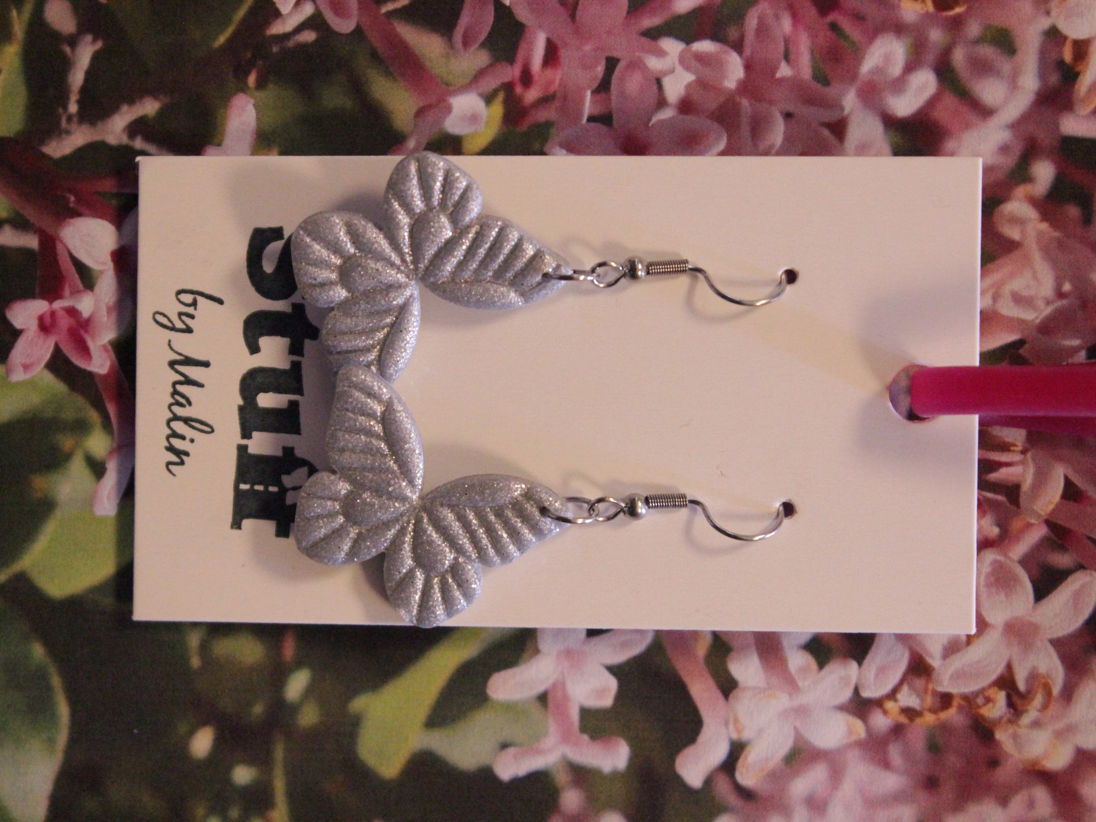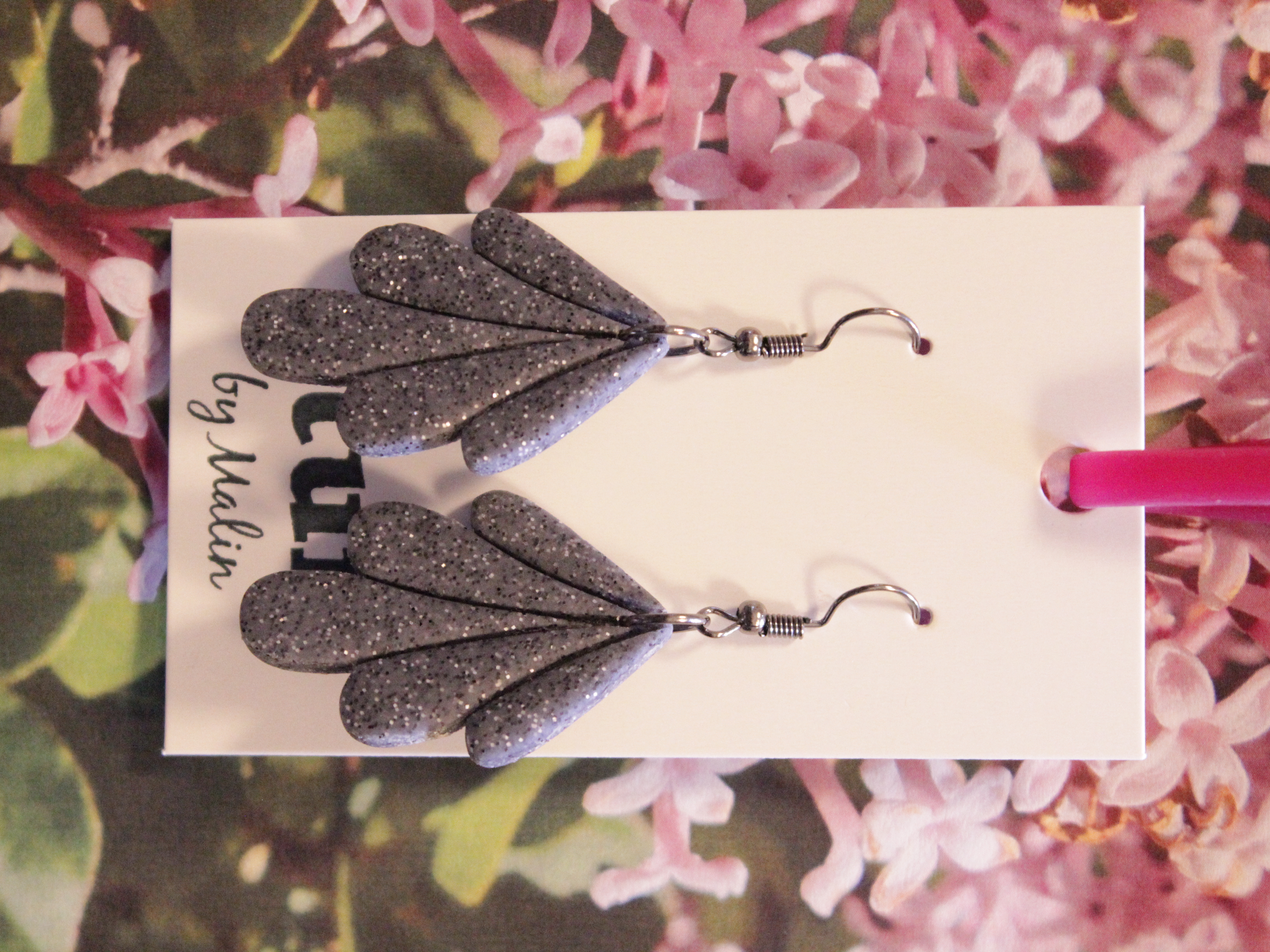 Örhängen tillverkade av polymerlera, pärlor och/eller metallberlocker av olika slag. Alla öronkrokar och stift är nickelfria. Smycken tillverkade av polymerlera är efter härdning i ugn mycket lätta och aningen flexibla.