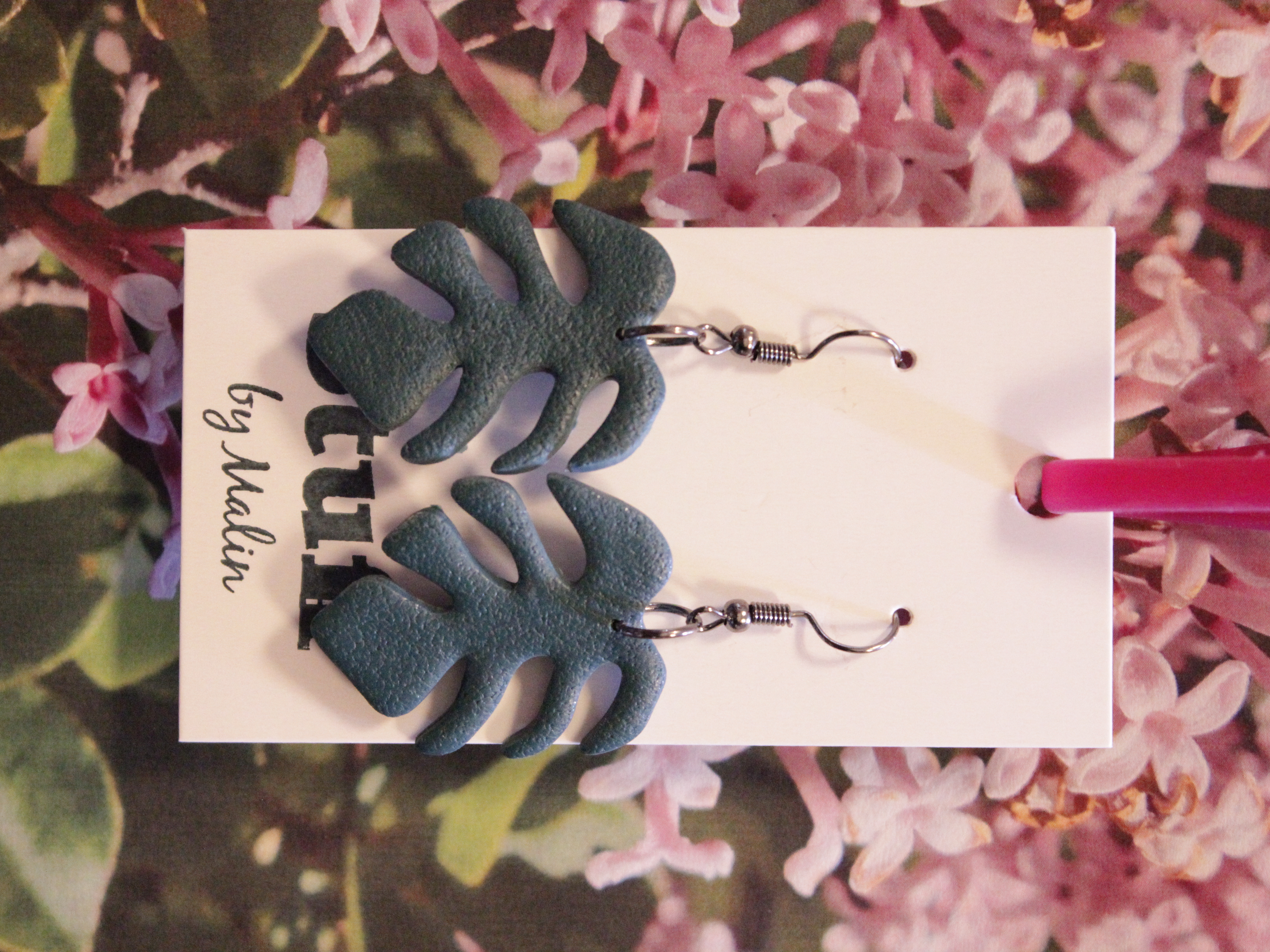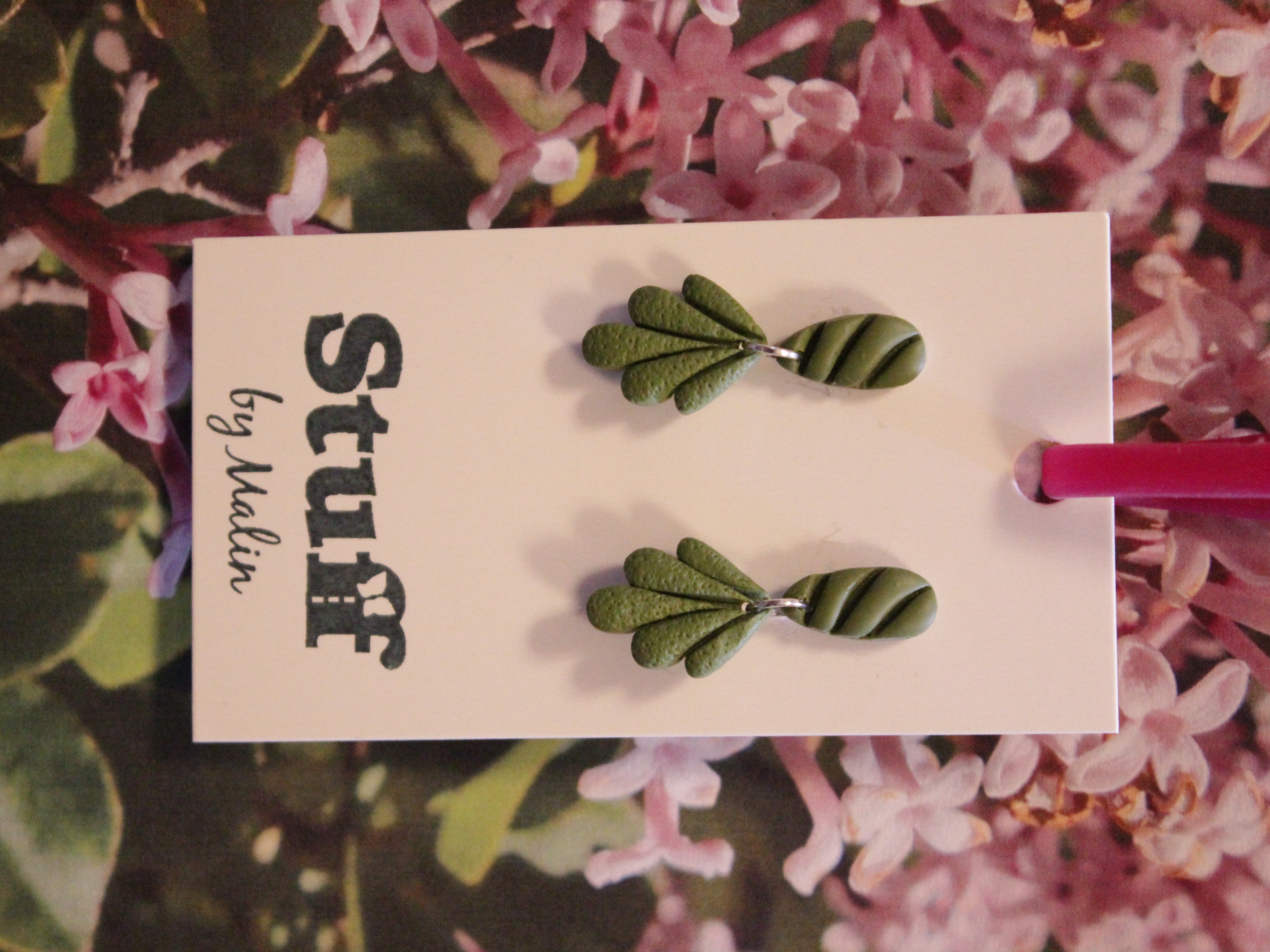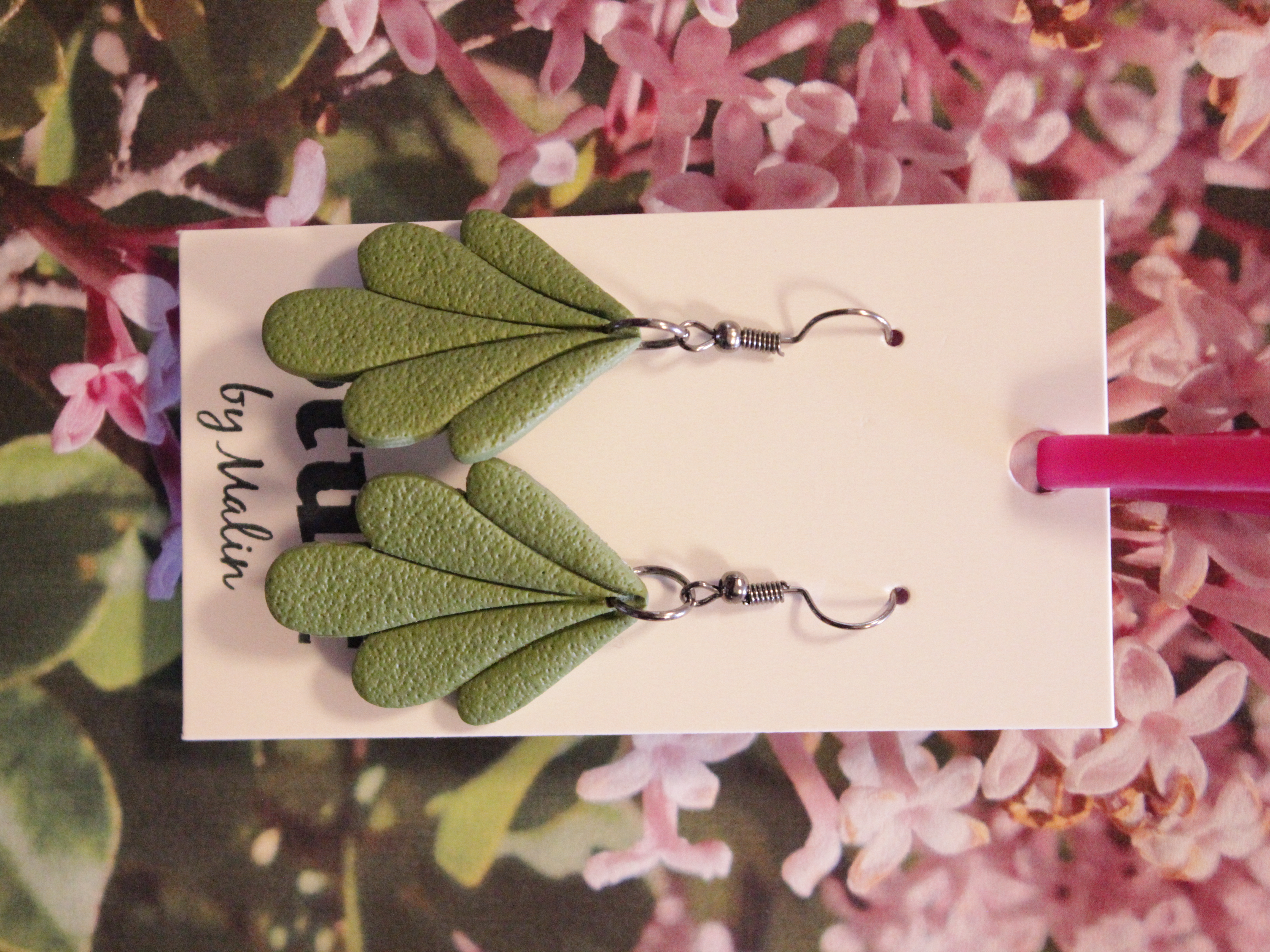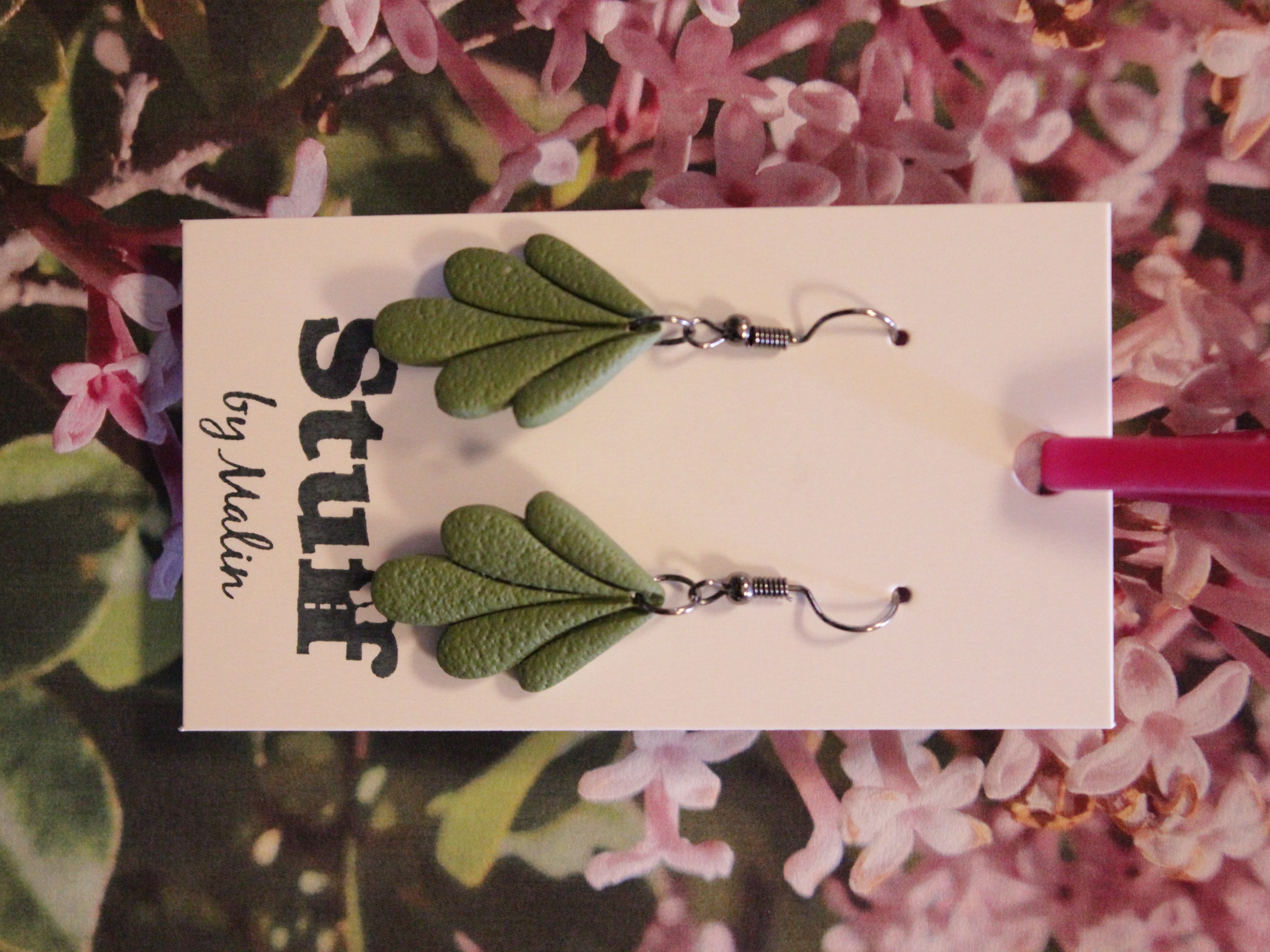 Örhängen tillverkade av polymerlera, pärlor och/eller metallberlocker av olika slag. Alla öronkrokar och stift är nickelfria. Smycken tillverkade av polymerlera är efter härdning i ugn mycket lätta och aningen flexibla.