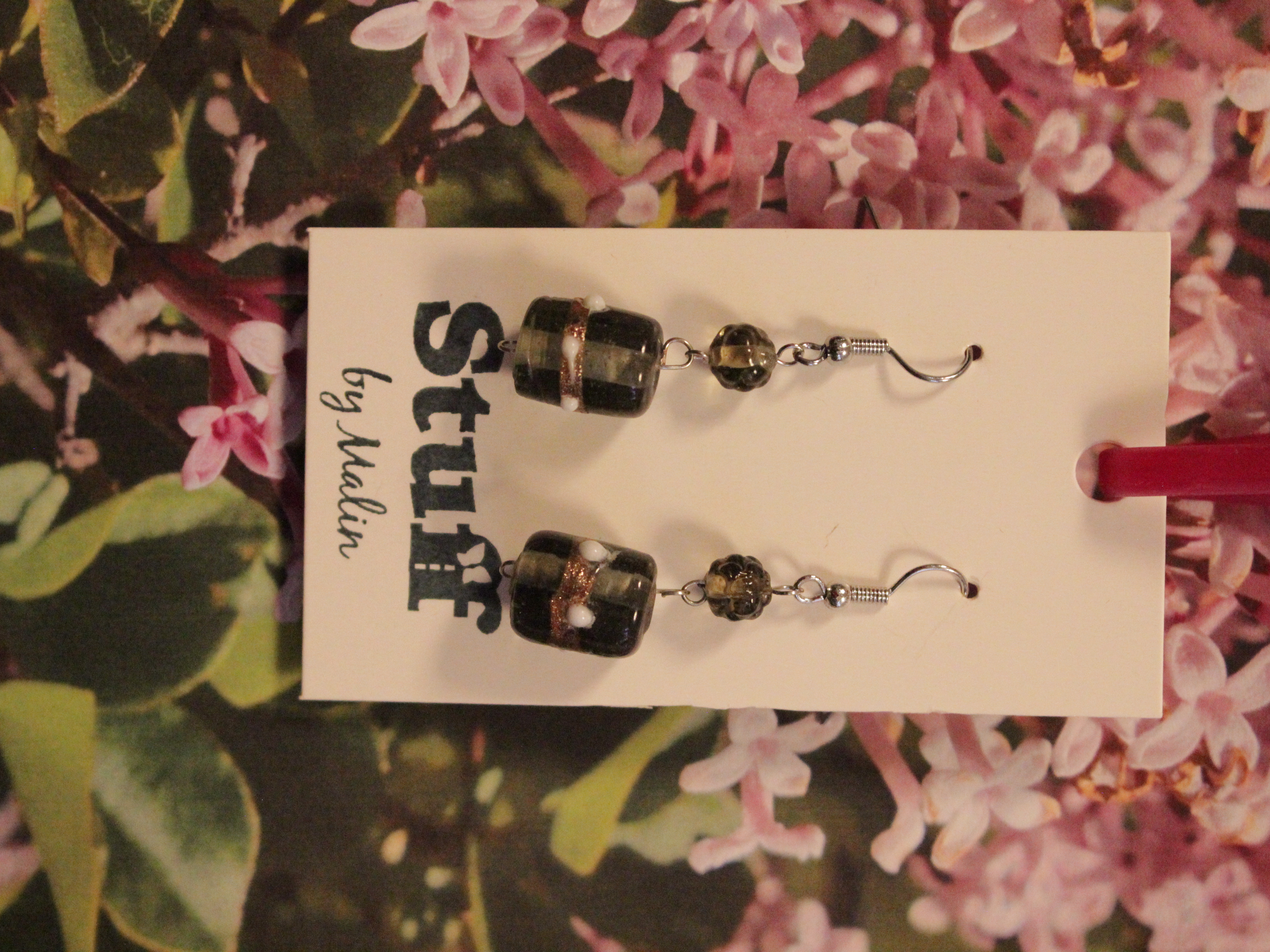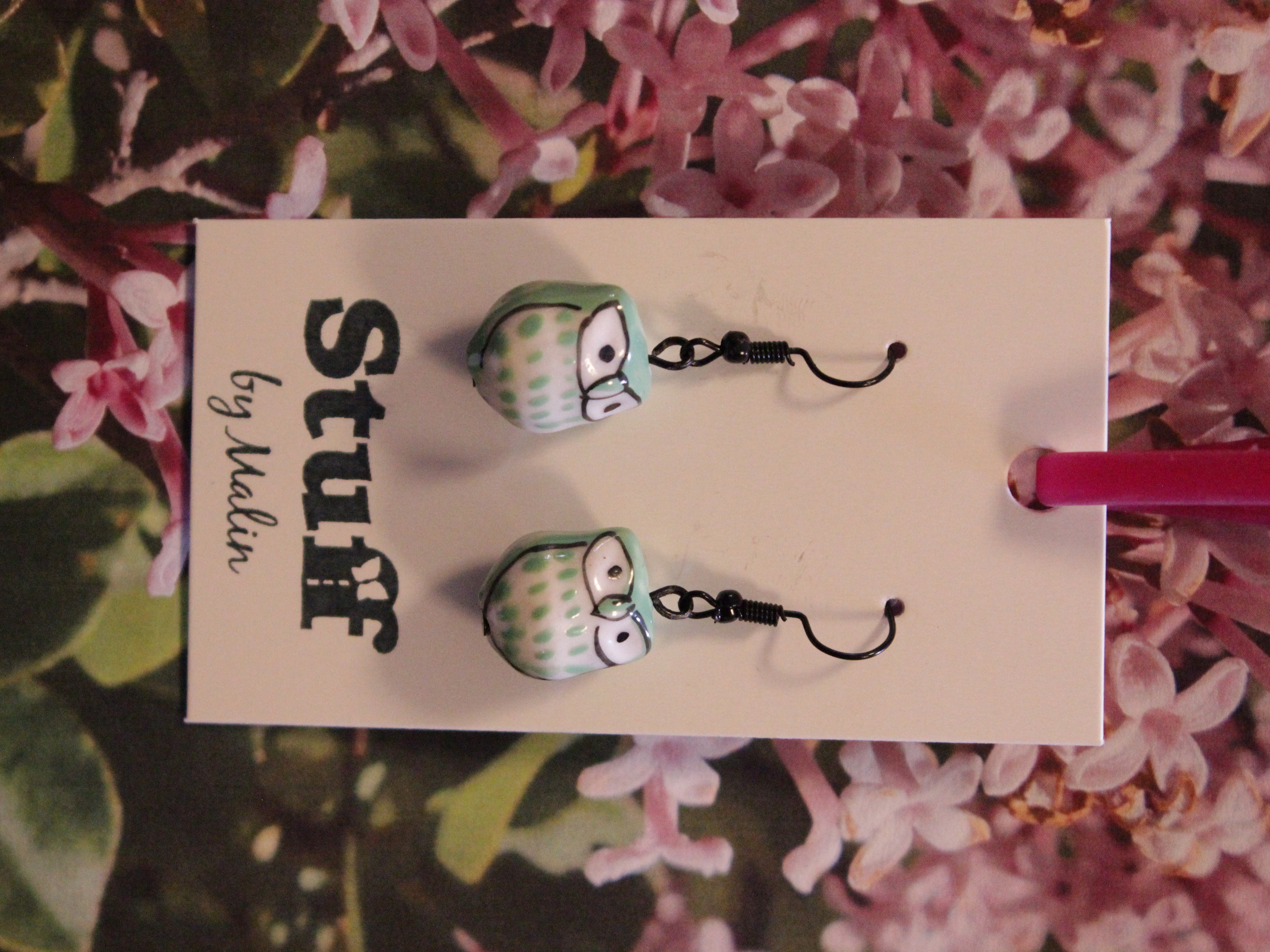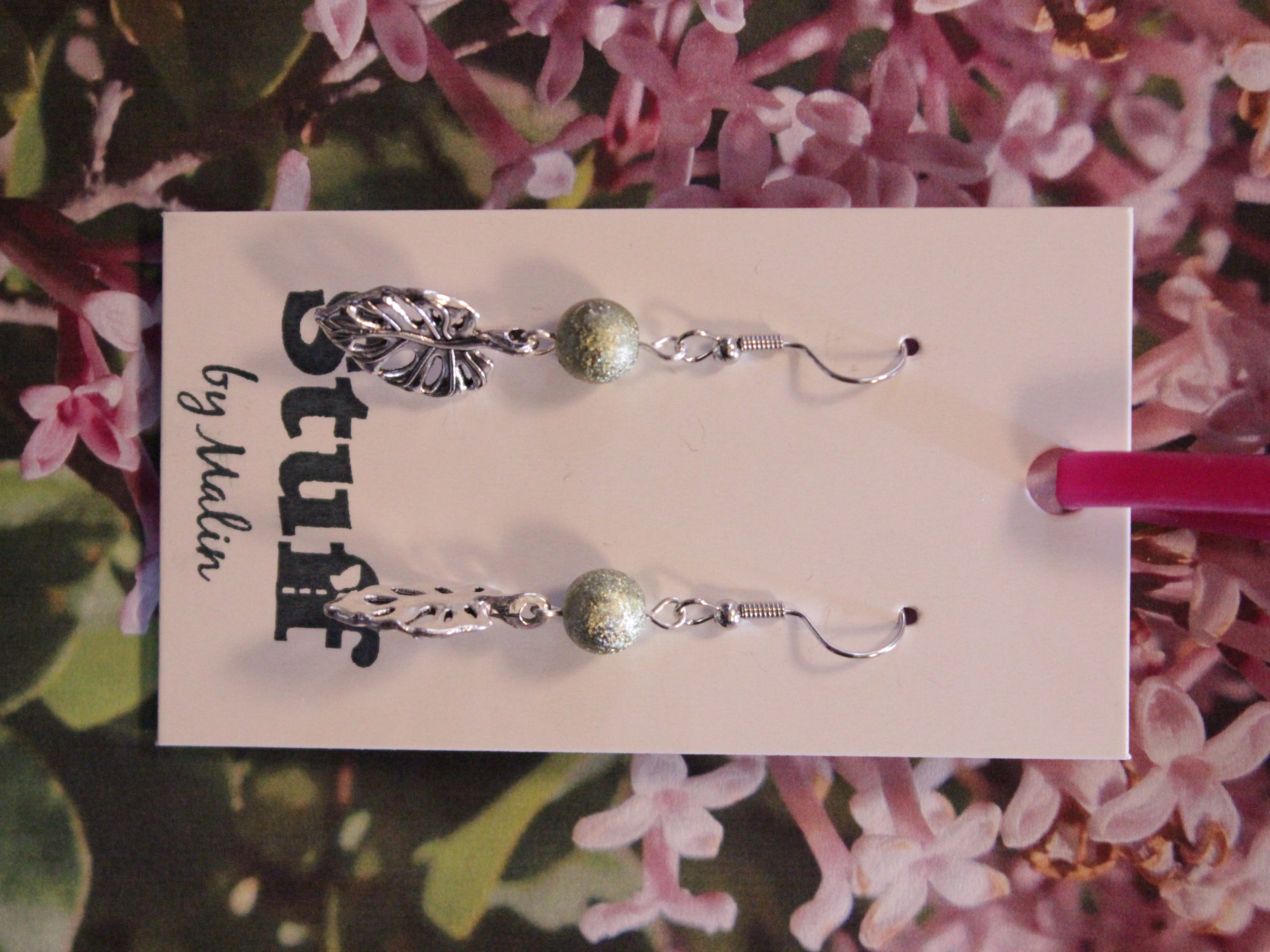 Örhängen tillverkade av polymerlera, pärlor och/eller metallberlocker av olika slag. Alla öronkrokar och stift är nickelfria. Smycken tillverkade av polymerlera är efter härdning i ugn mycket lätta och aningen flexibla.