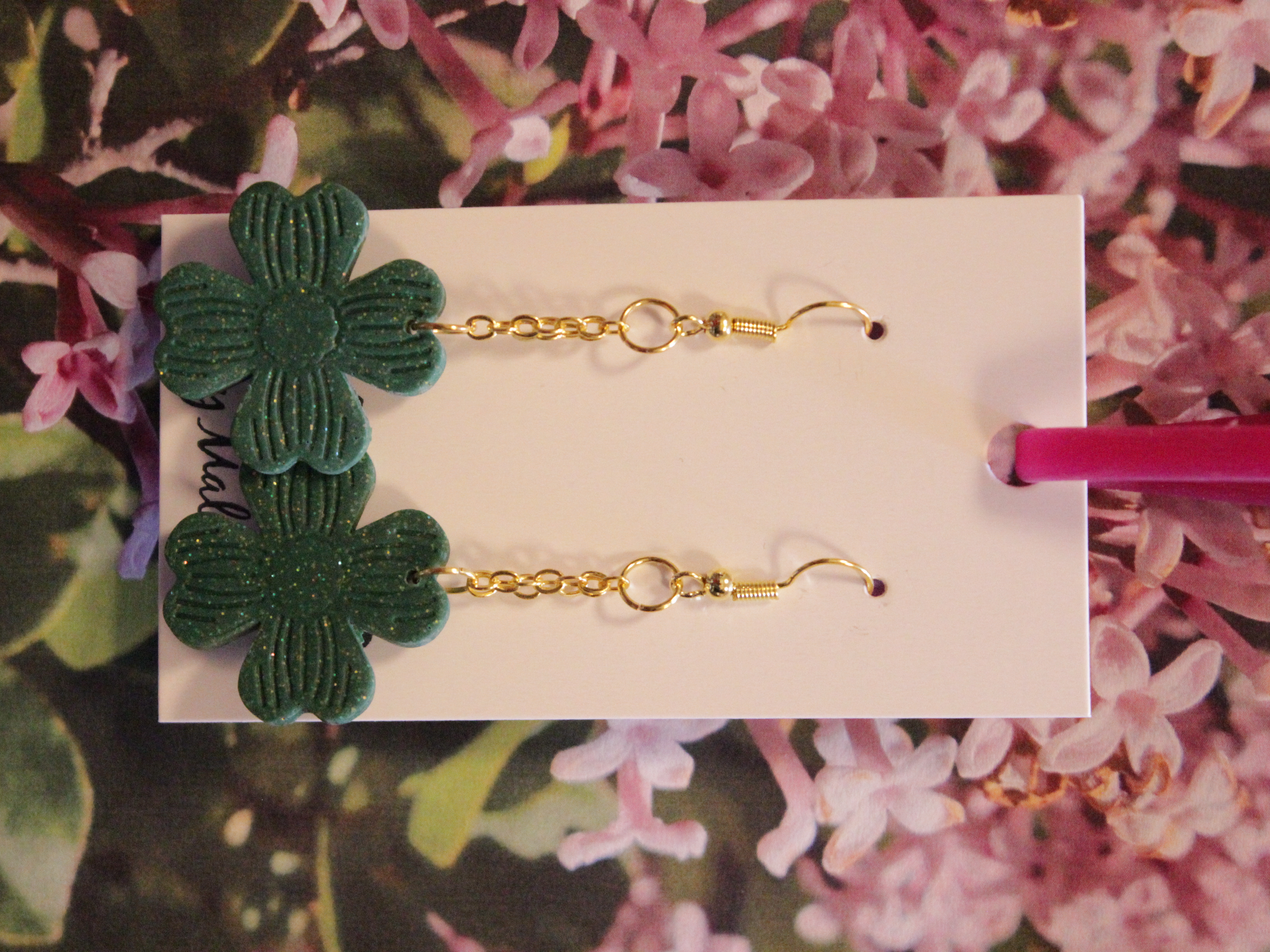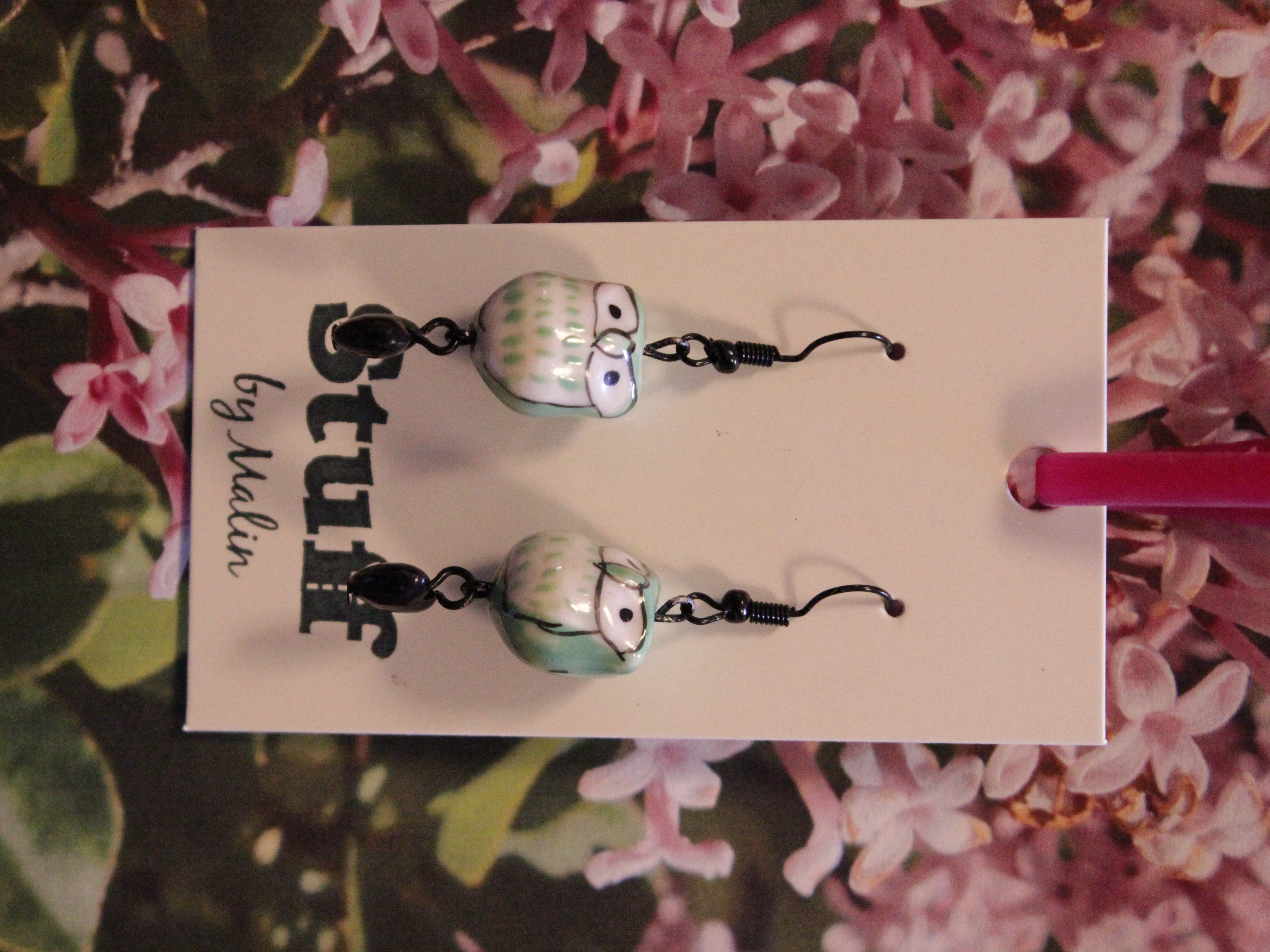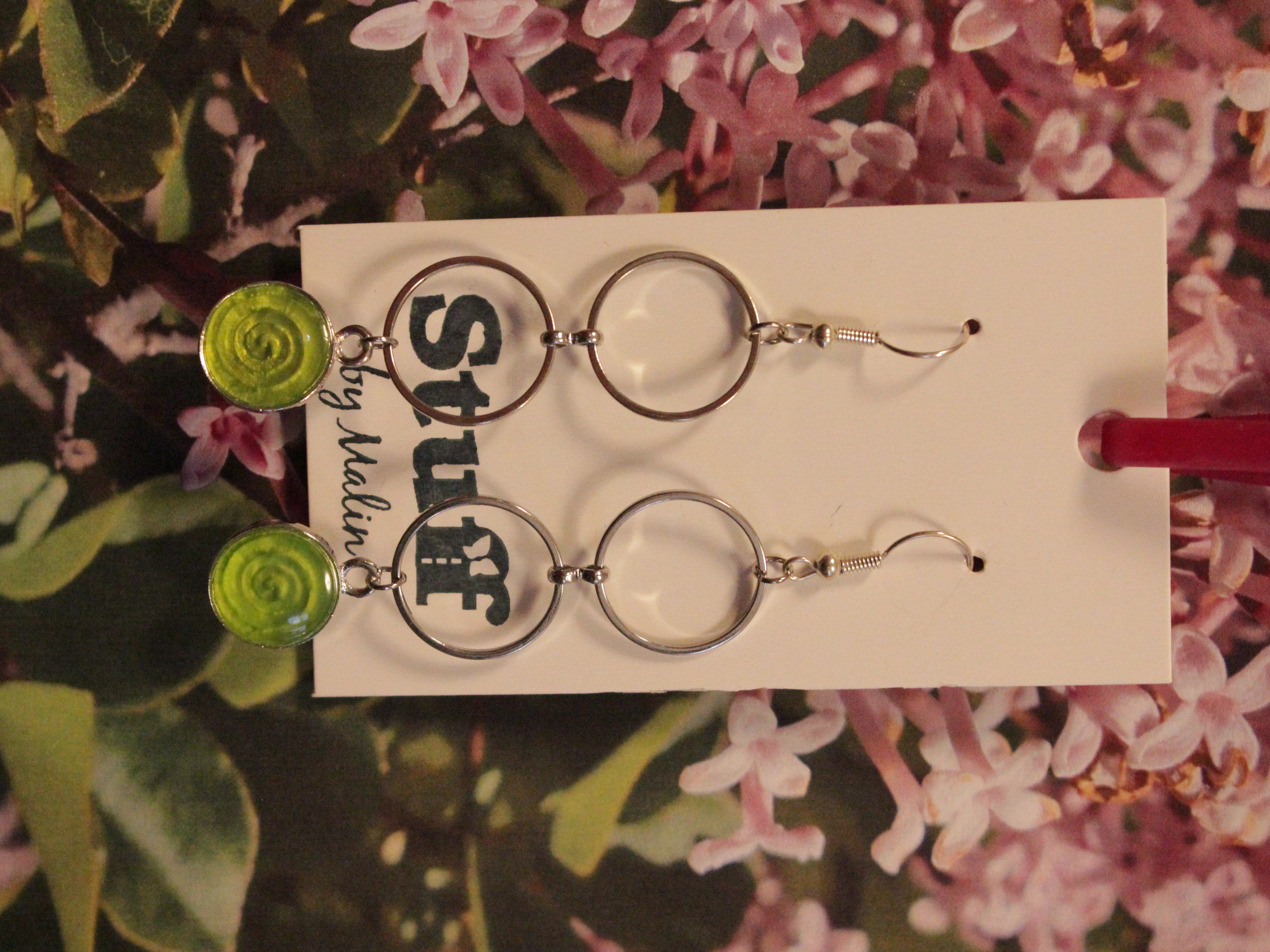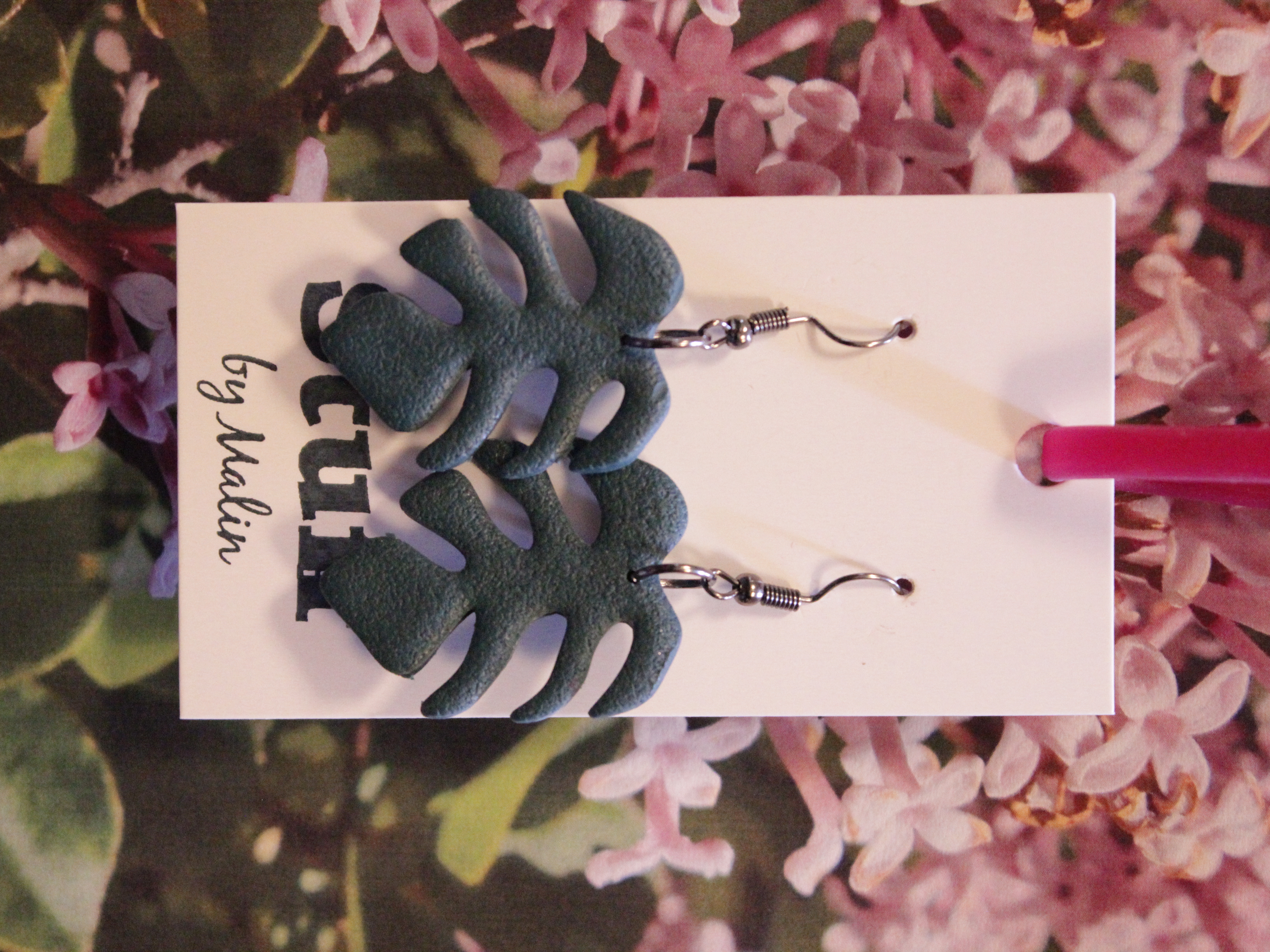 Örhängen tillverkade av polymerlera, pärlor och/eller metallberlocker av olika slag. Alla öronkrokar och stift är nickelfria. Smycken tillverkade av polymerlera är efter härdning i ugn mycket lätta och aningen flexibla.