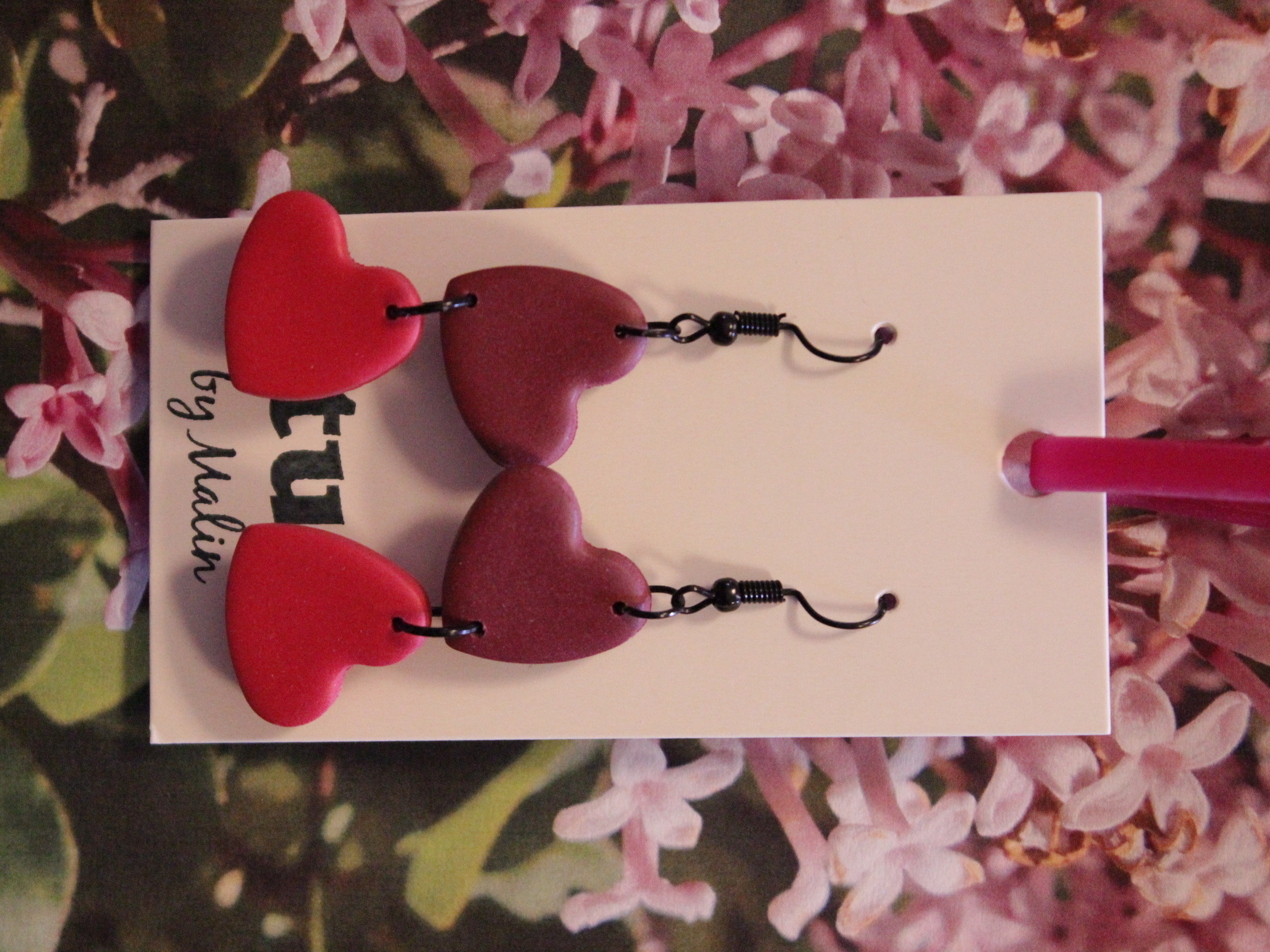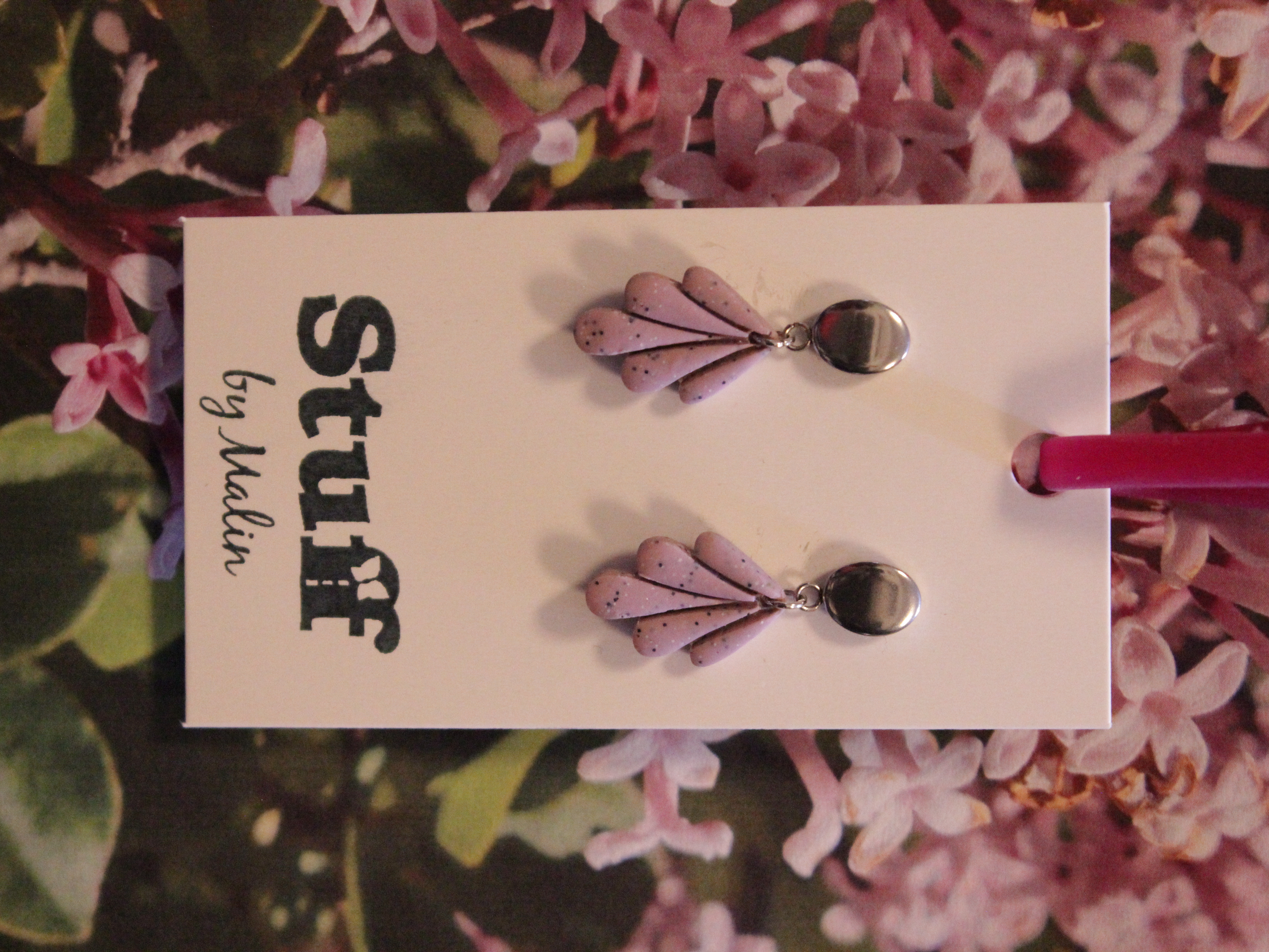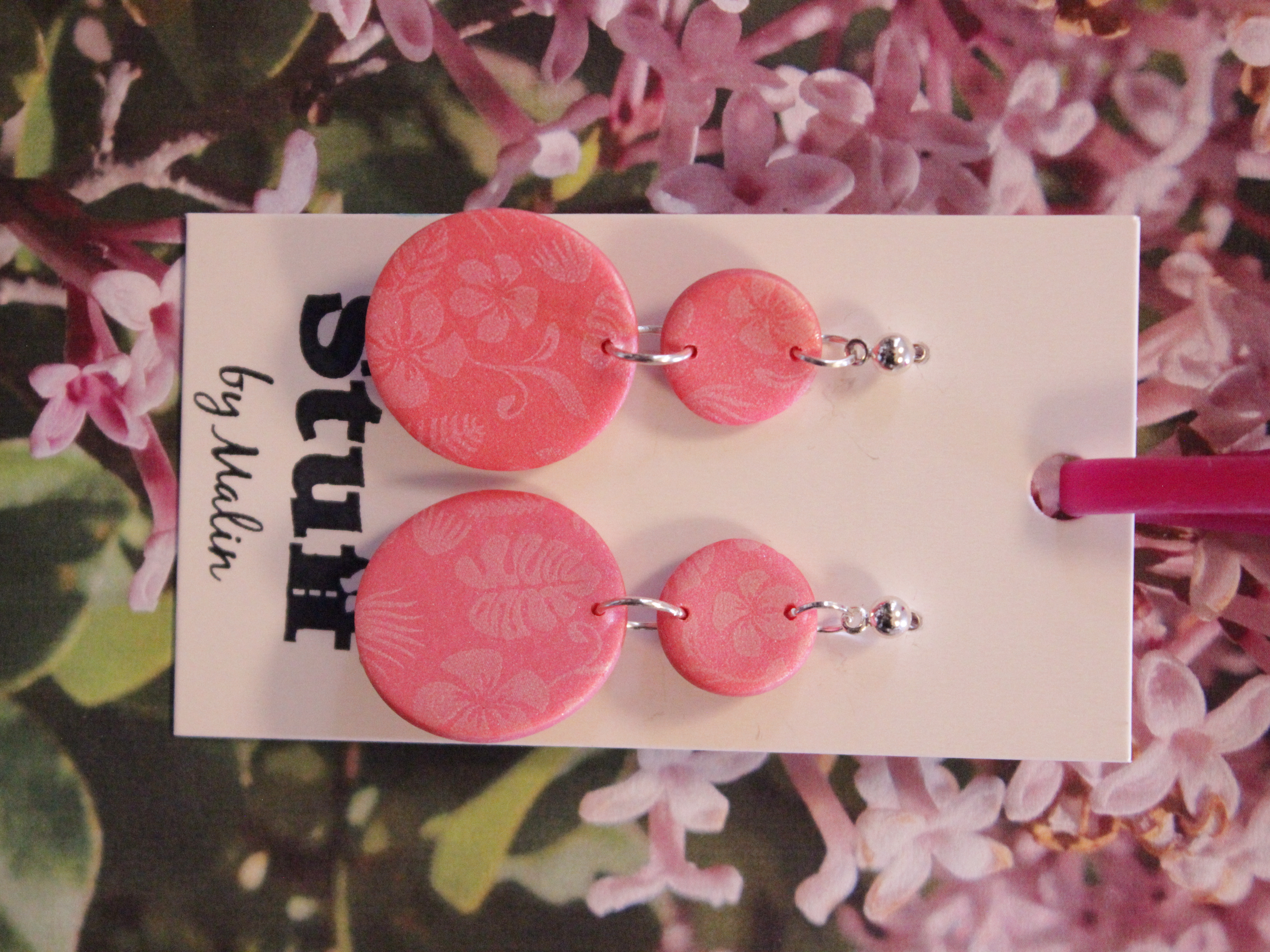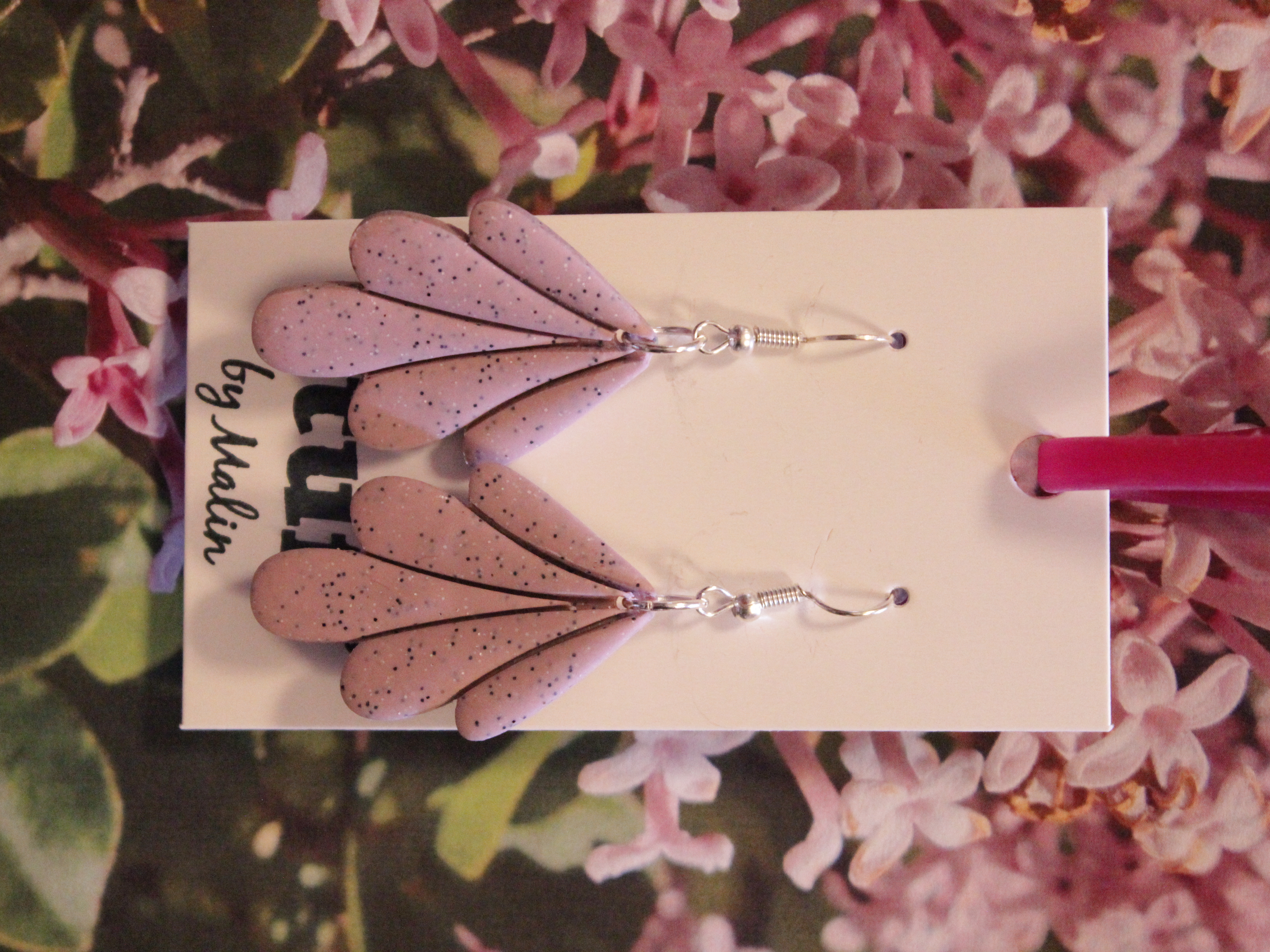 Örhängen tillverkade av polymerlera, pärlor och/eller metallberlocker av olika slag. Alla öronkrokar och stift är nickelfria. Smycken tillverkade av polymerlera är efter härdning i ugn mycket lätta och aningen flexibla.