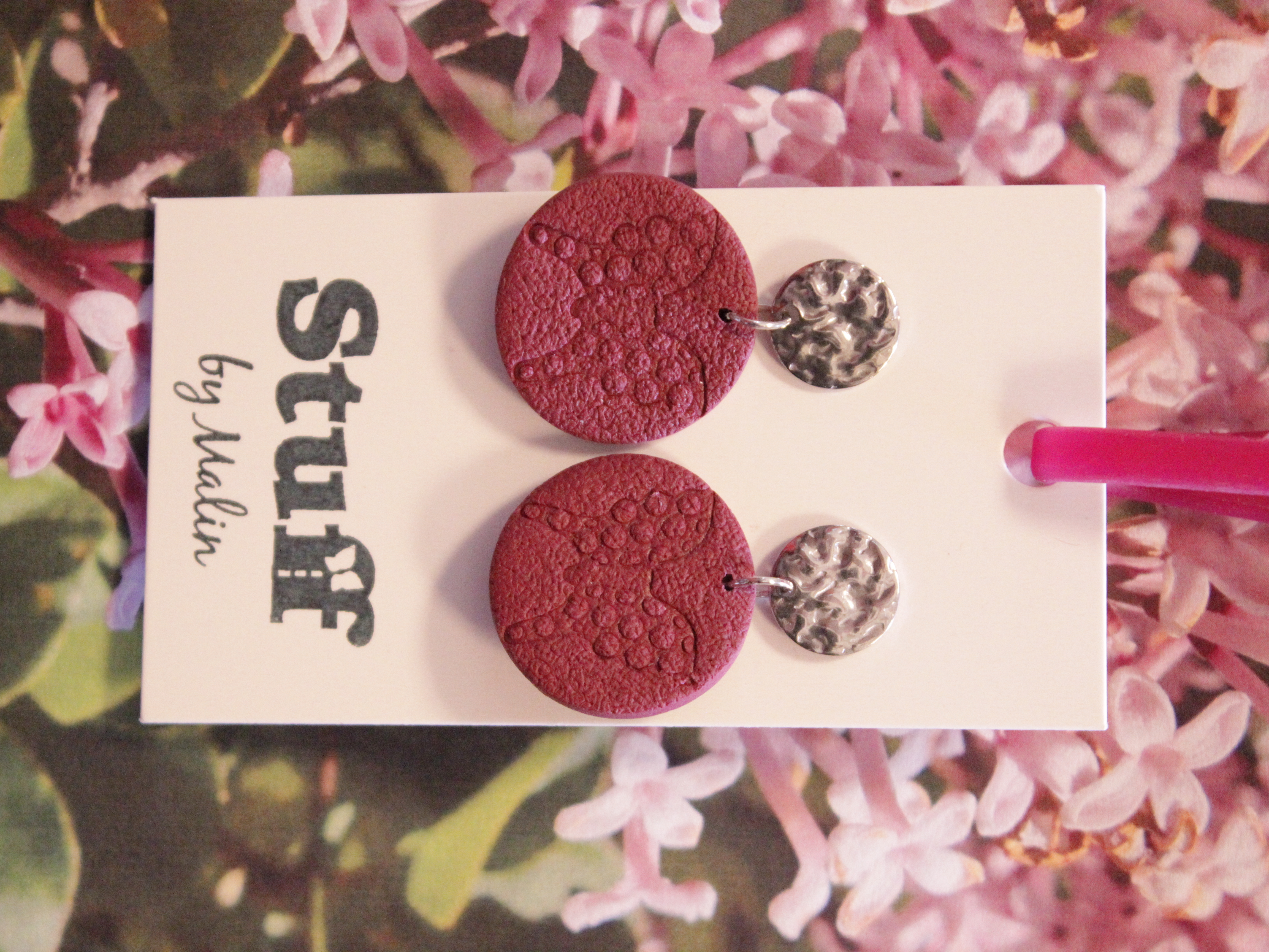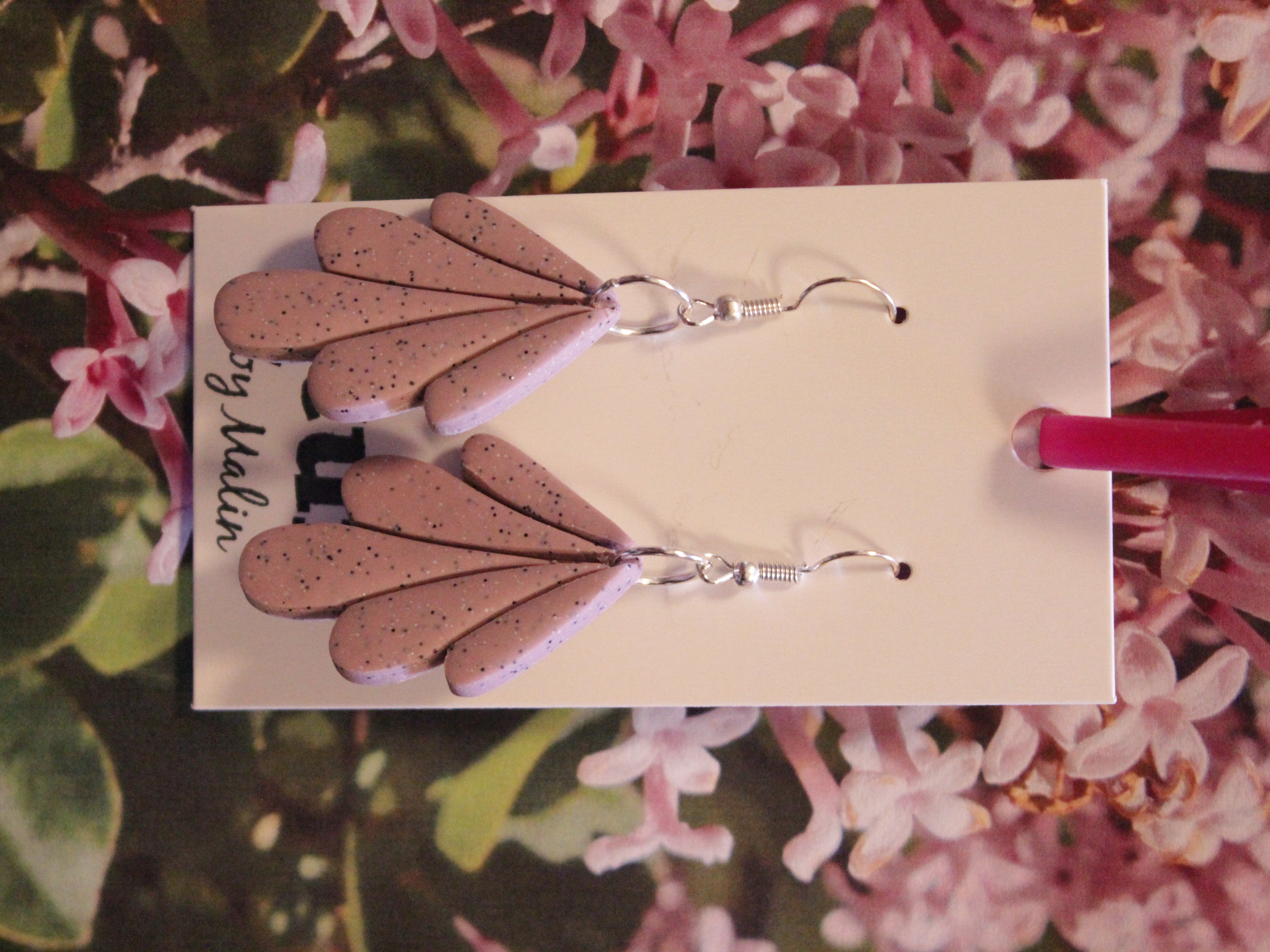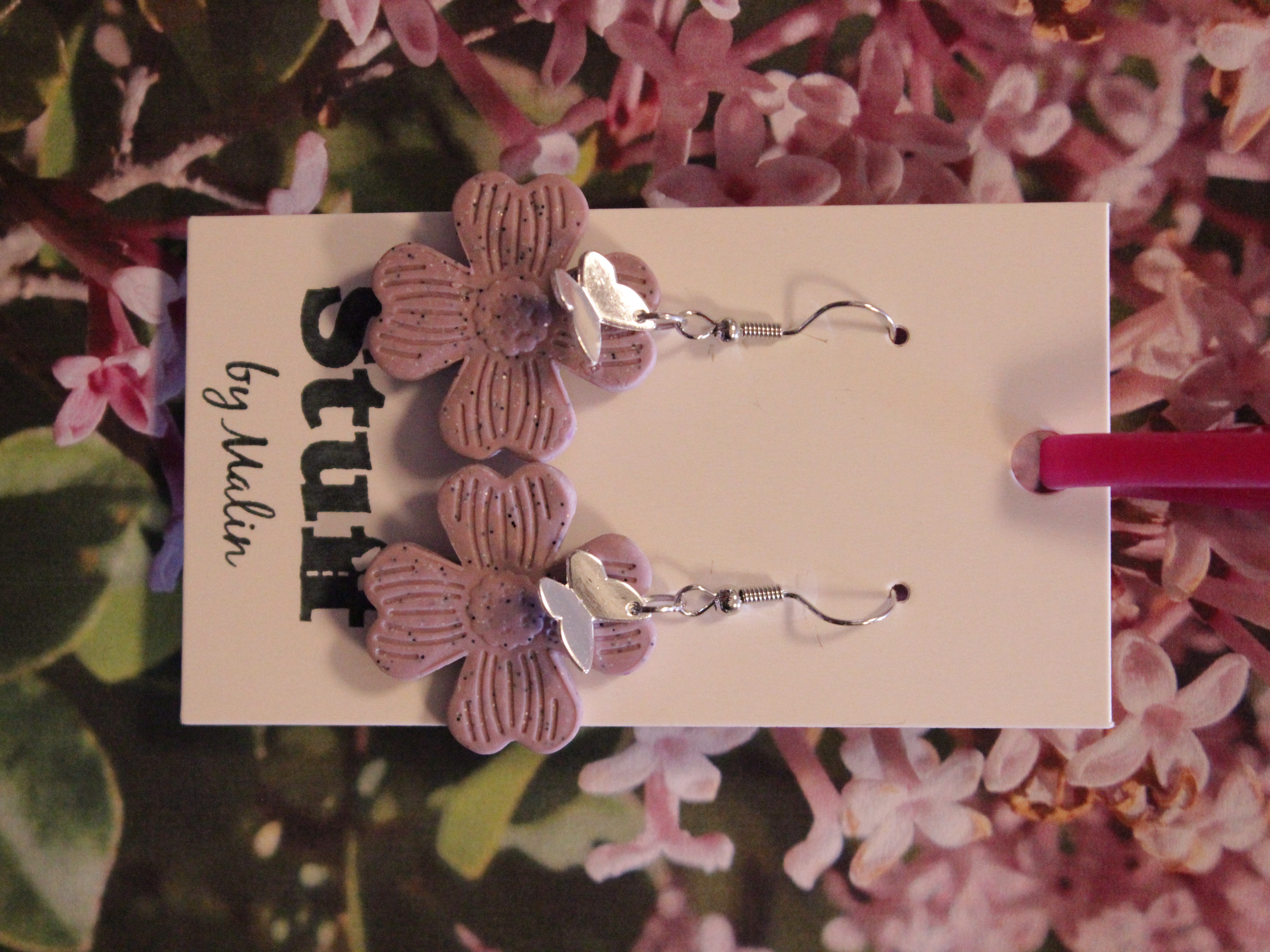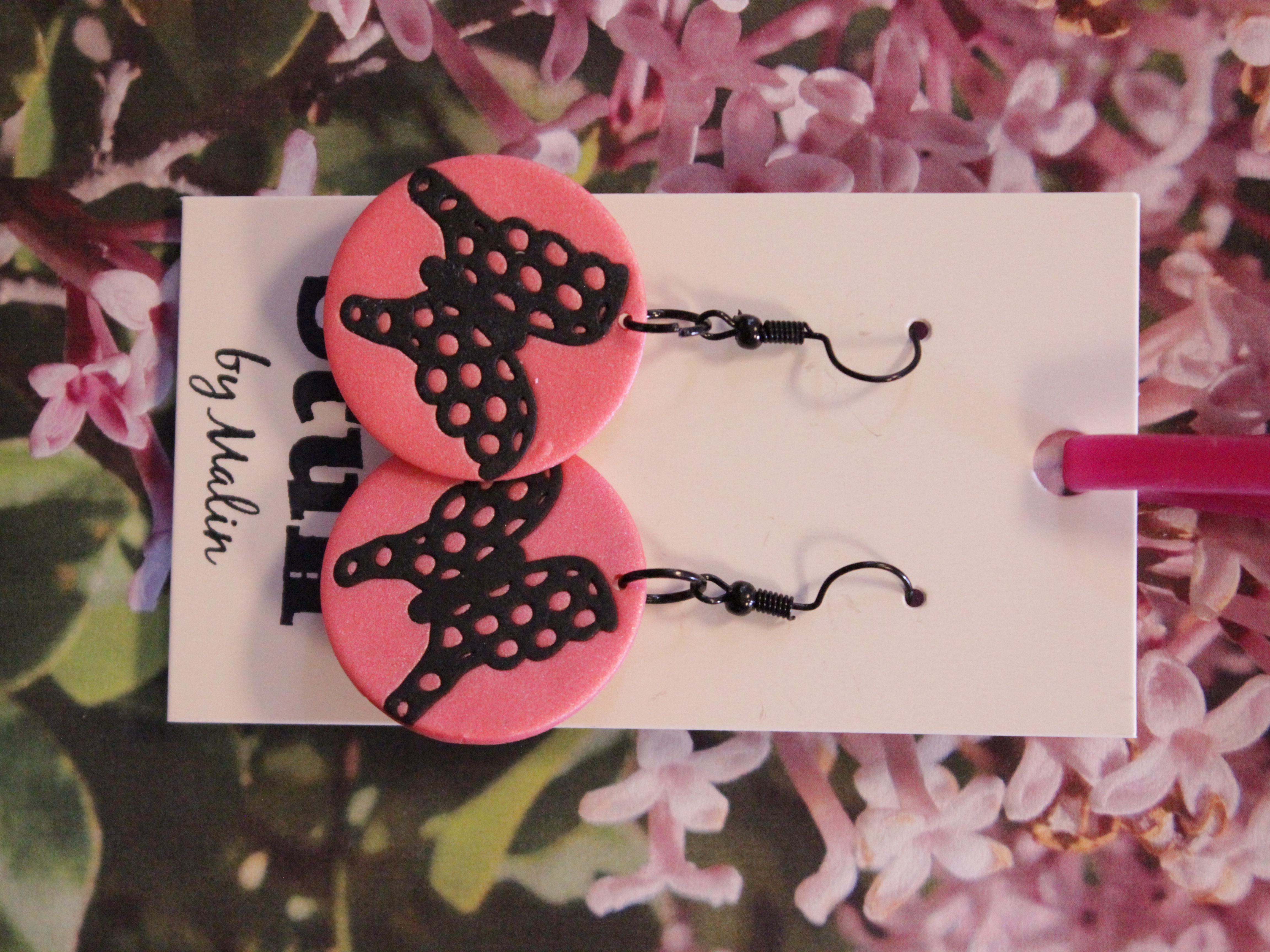 Örhängen tillverkade av polymerlera, pärlor och/eller metallberlocker av olika slag. Alla öronkrokar och stift är nickelfria. Smycken tillverkade av polymerlera är efter härdning i ugn mycket lätta och aningen flexibla.