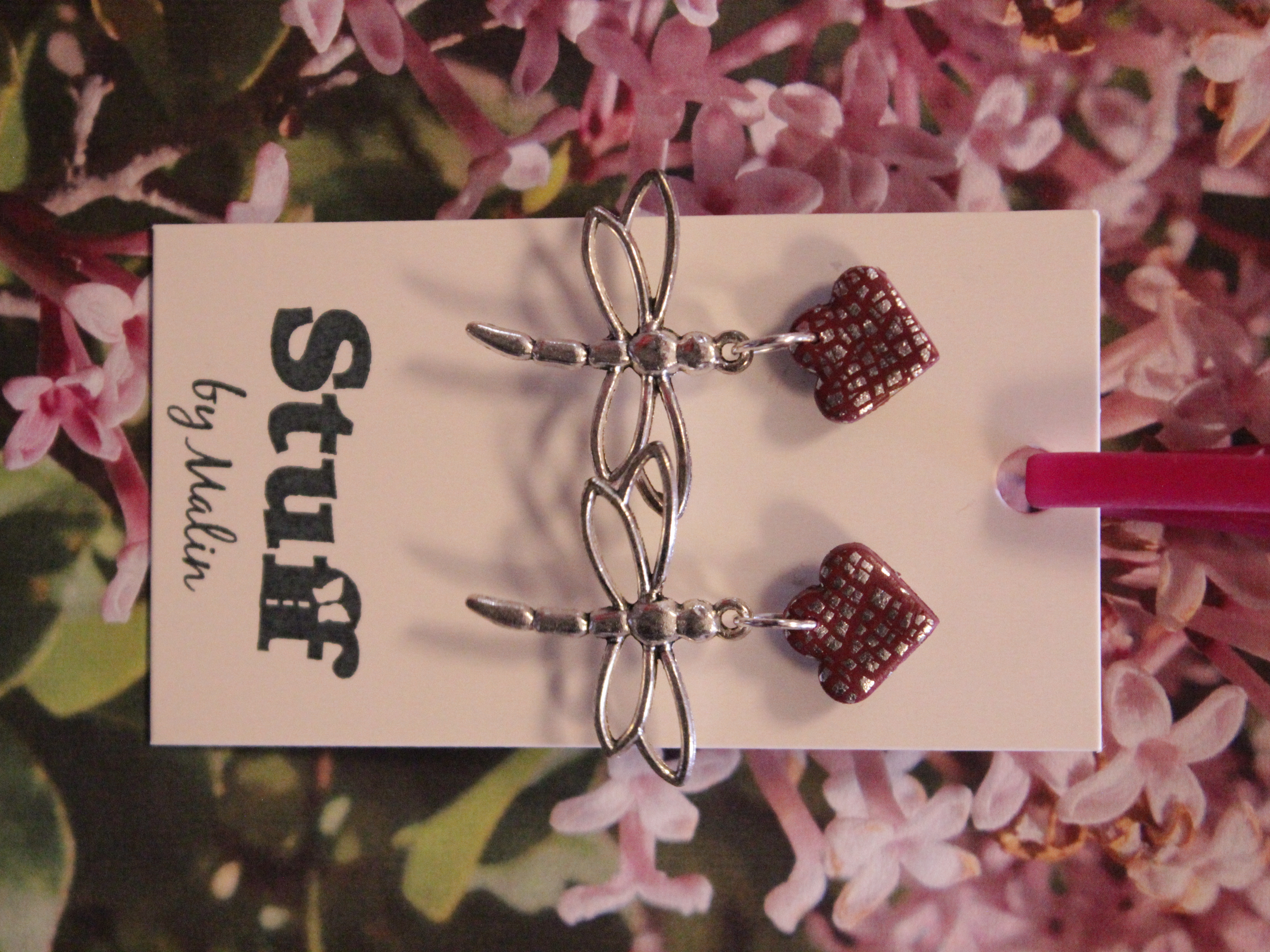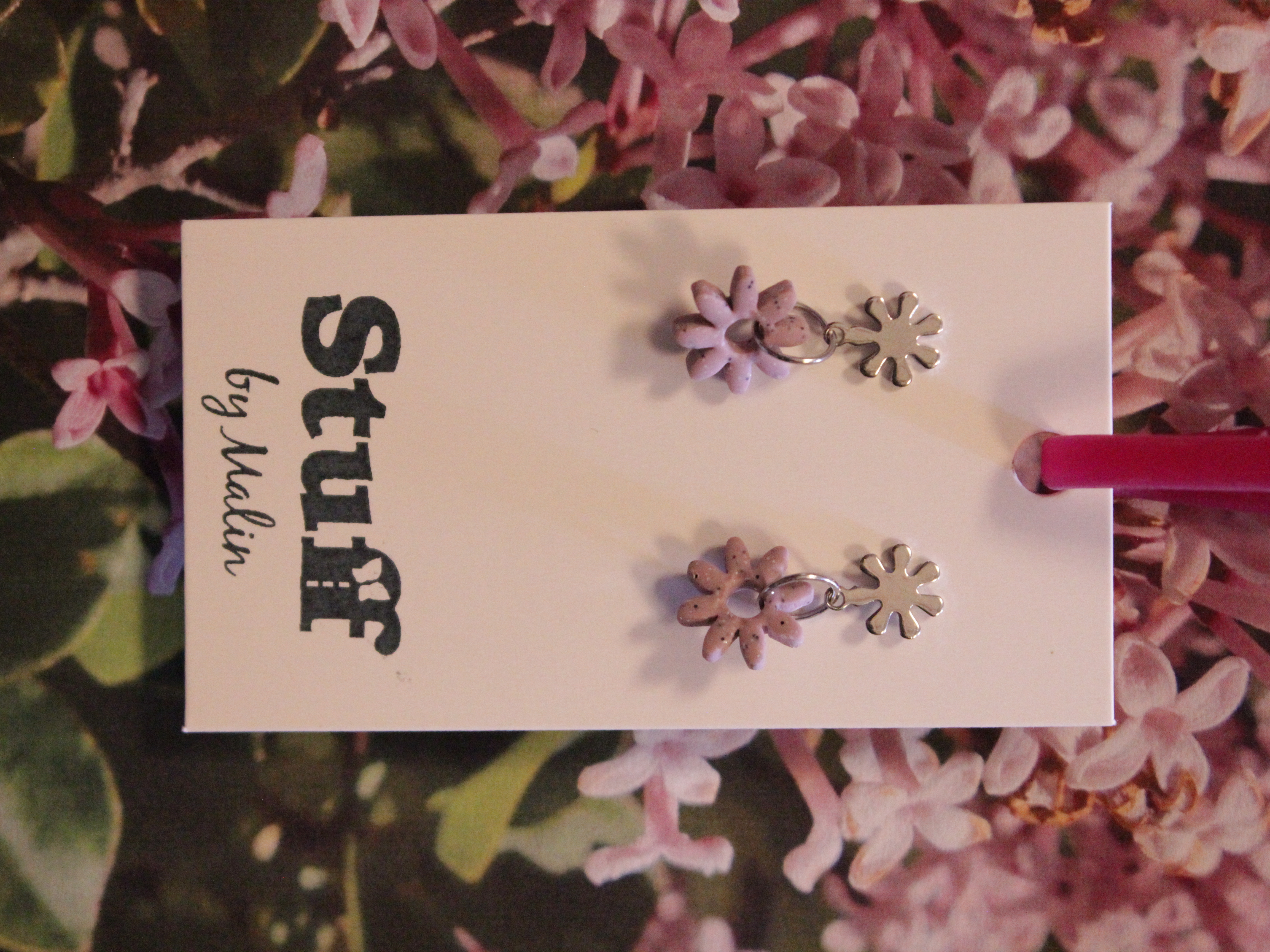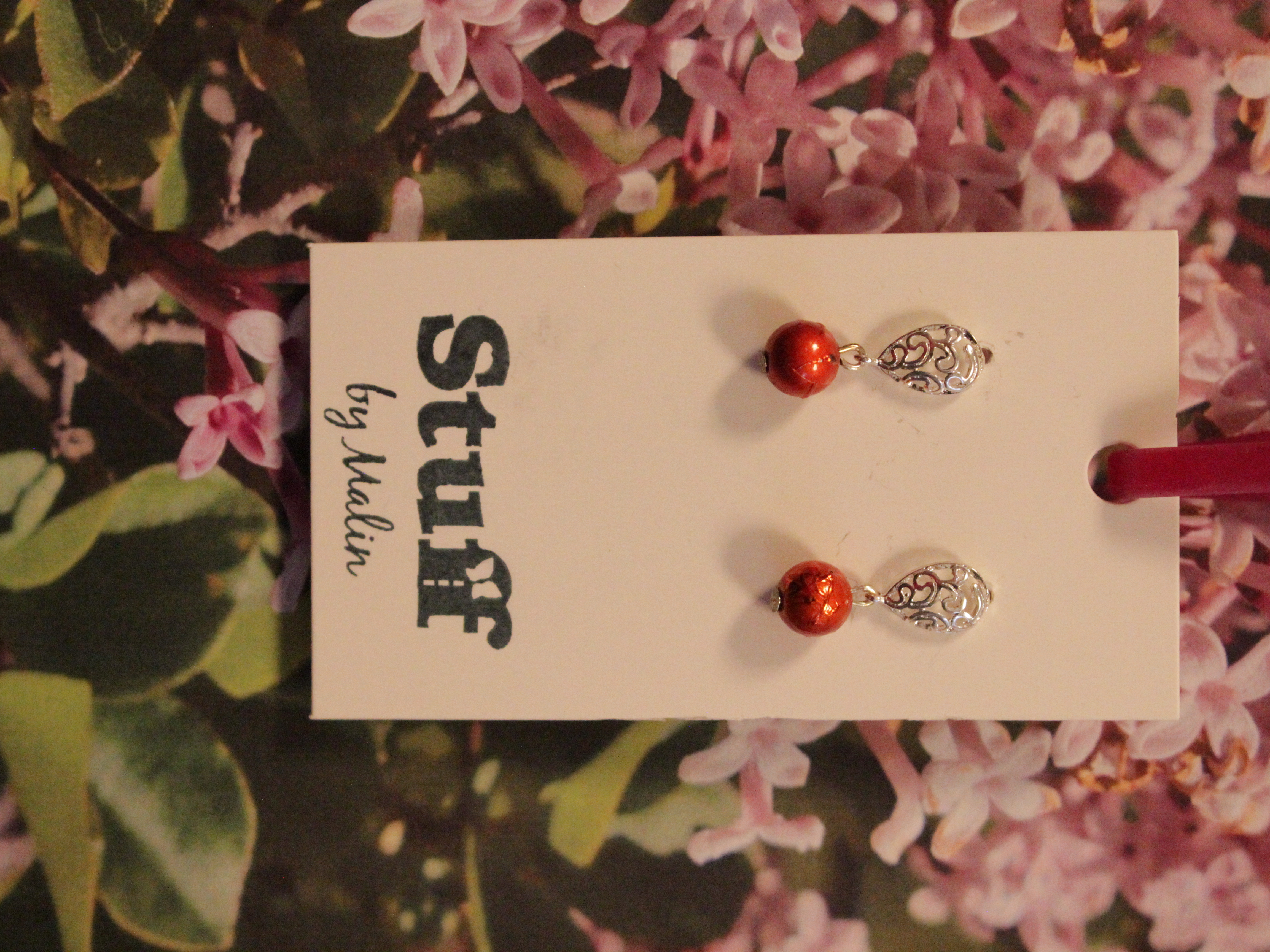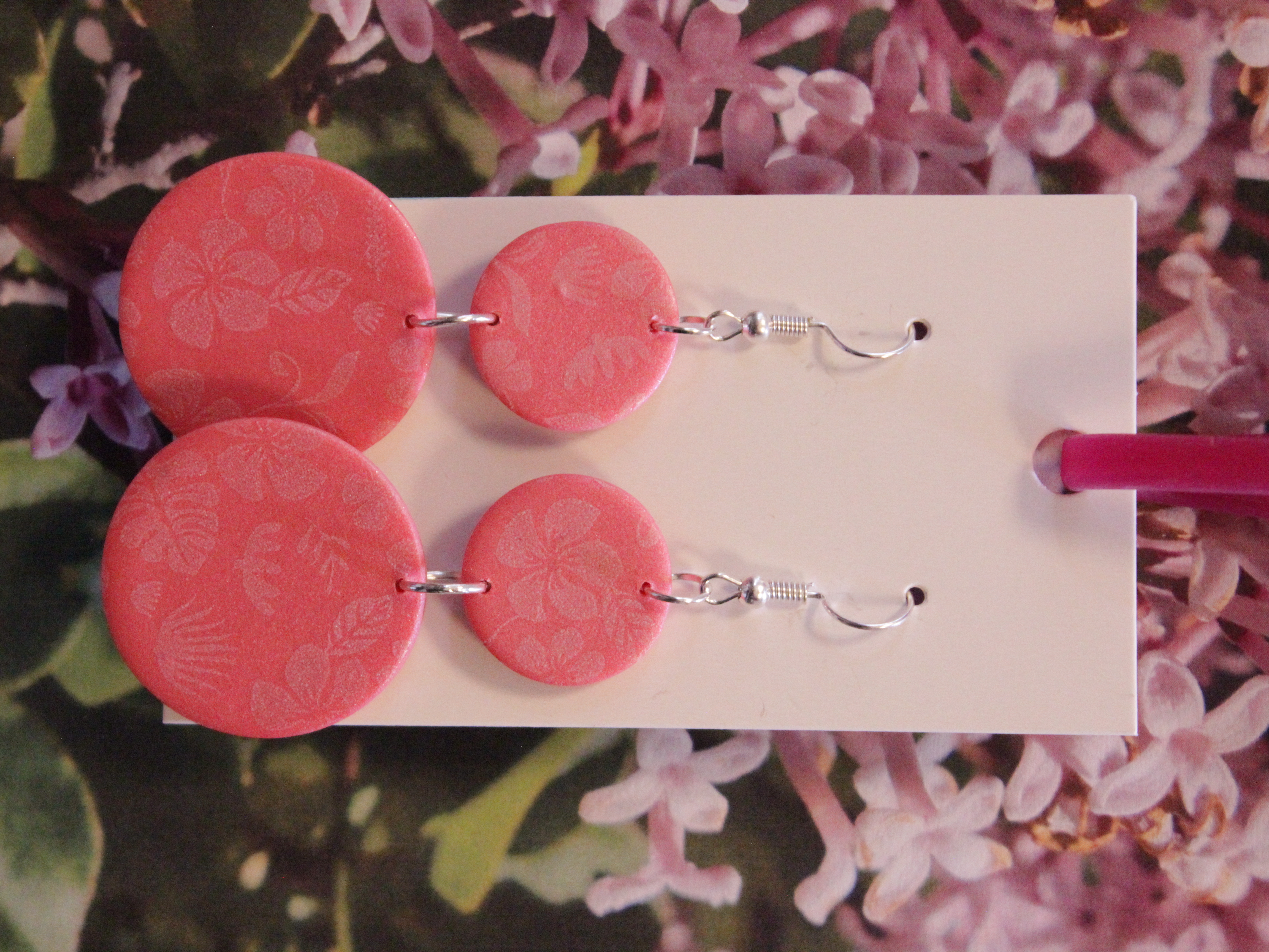 Örhängen tillverkade av polymerlera, pärlor och/eller metallberlocker av olika slag. Alla öronkrokar och stift är nickelfria. Smycken tillverkade av polymerlera är efter härdning i ugn mycket lätta och aningen flexibla.