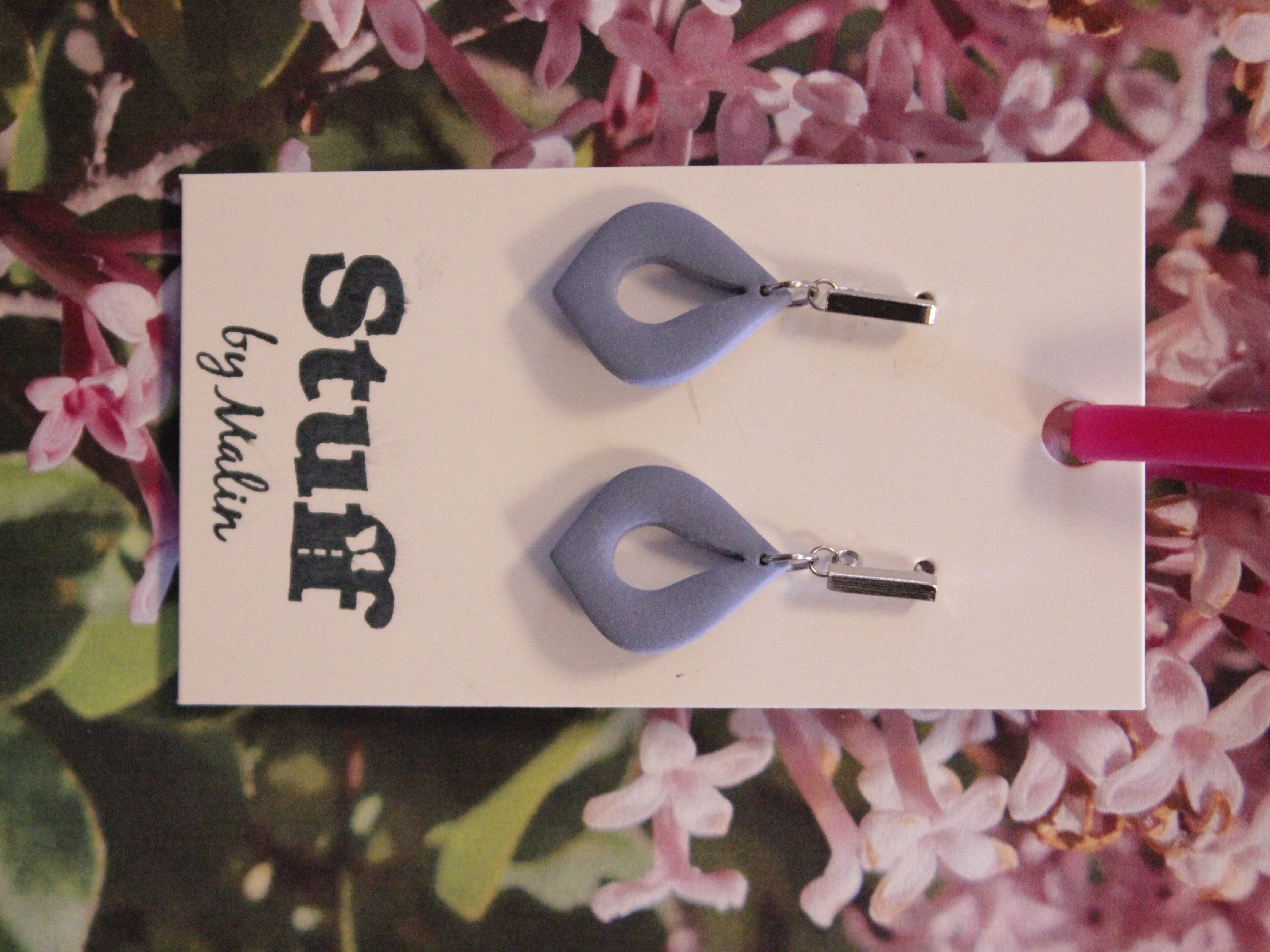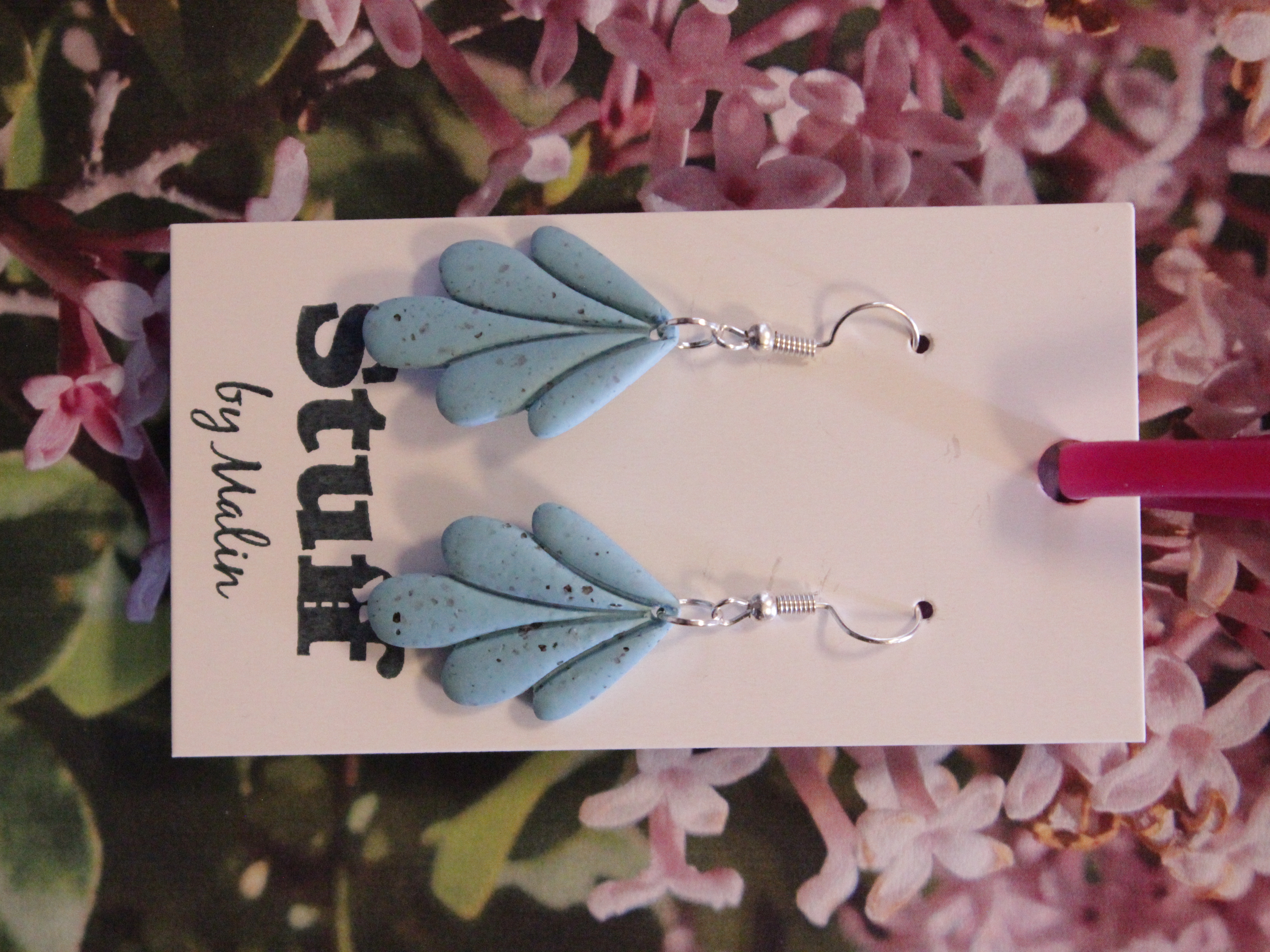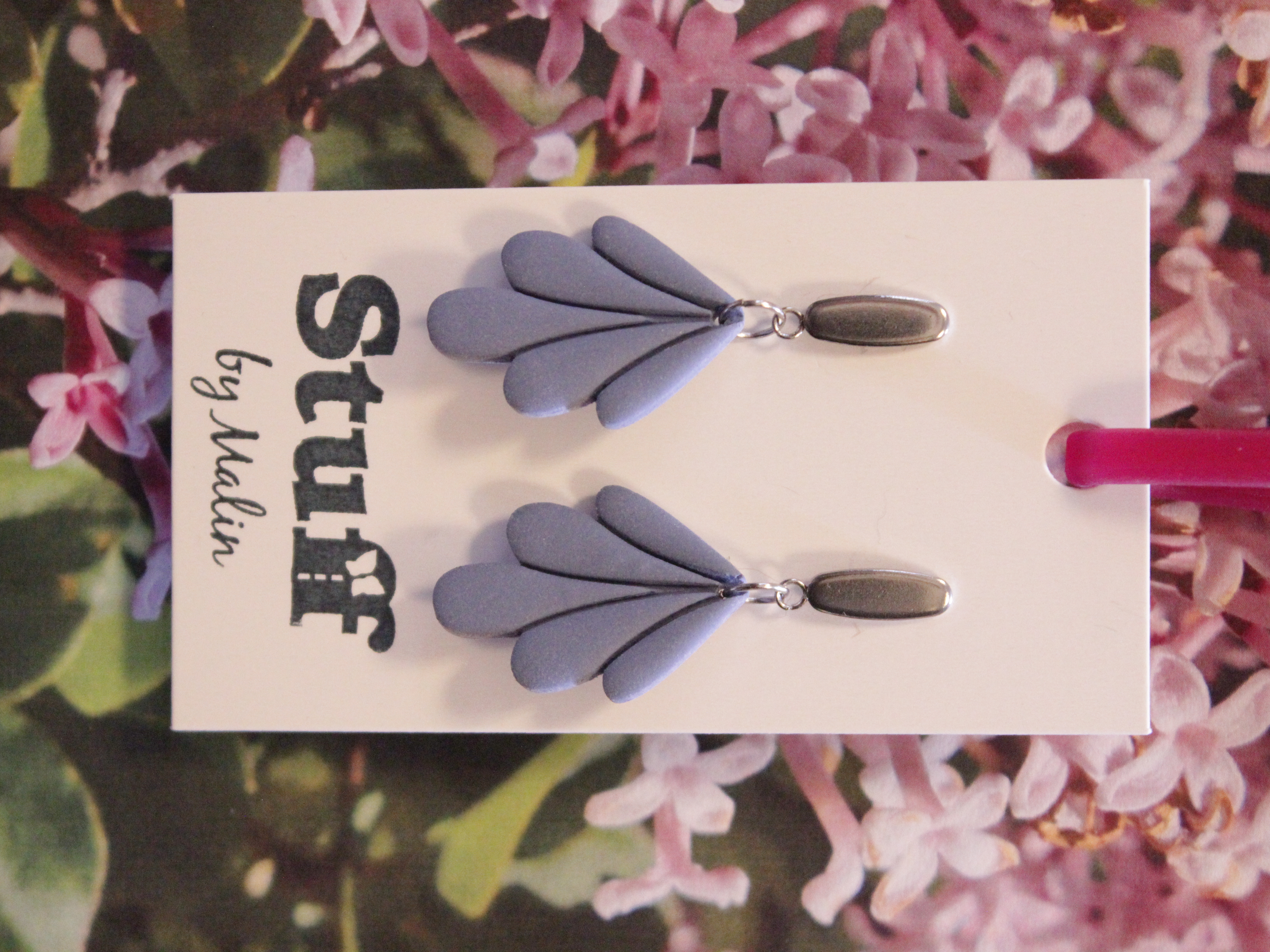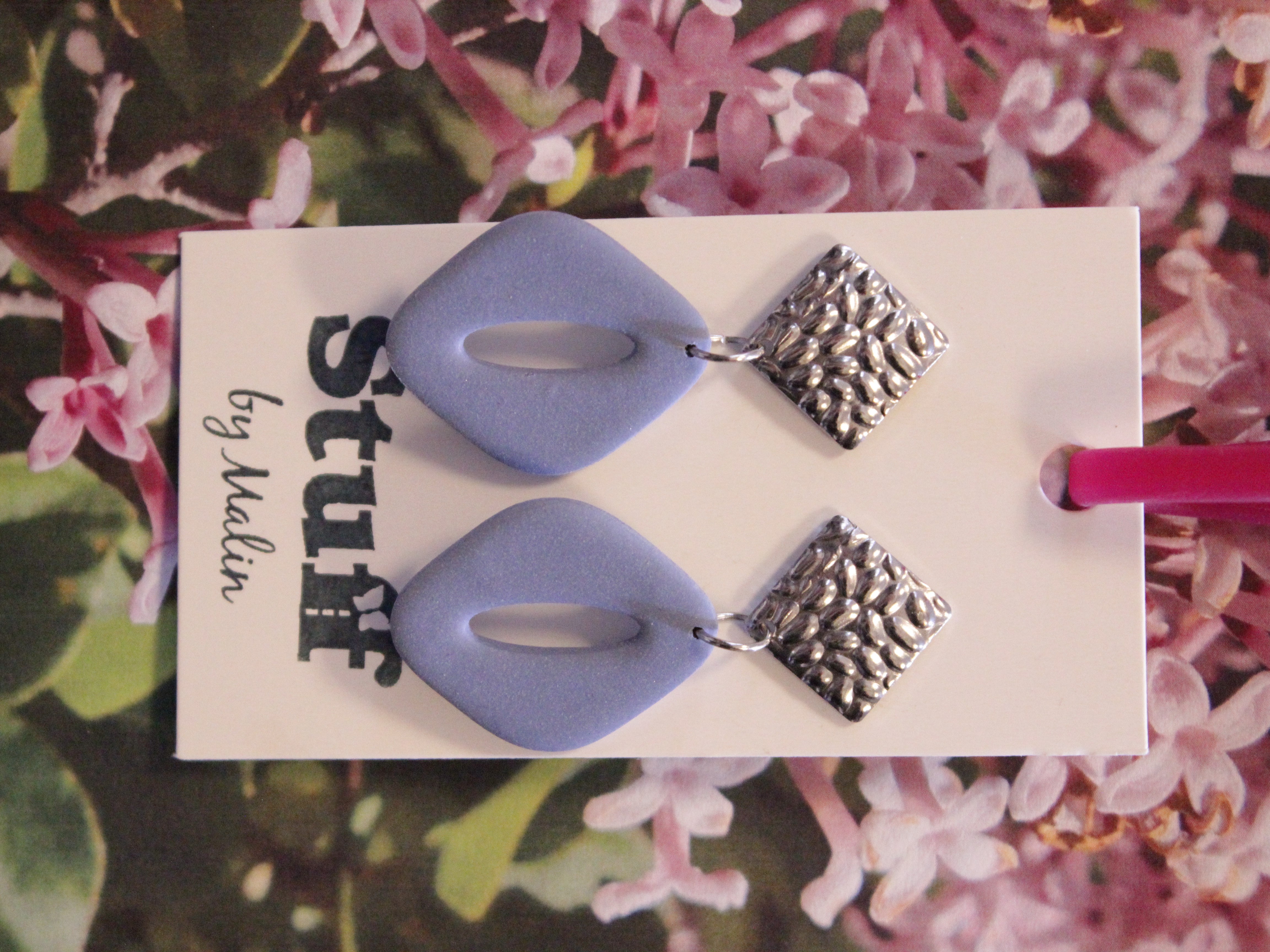 Örhängen tillverkade av polymerlera, pärlor och/eller metallberlocker av olika slag. Alla öronkrokar och stift är nickelfria. Smycken tillverkade av polymerlera är efter härdning i ugn mycket lätta och aningen flexibla.