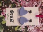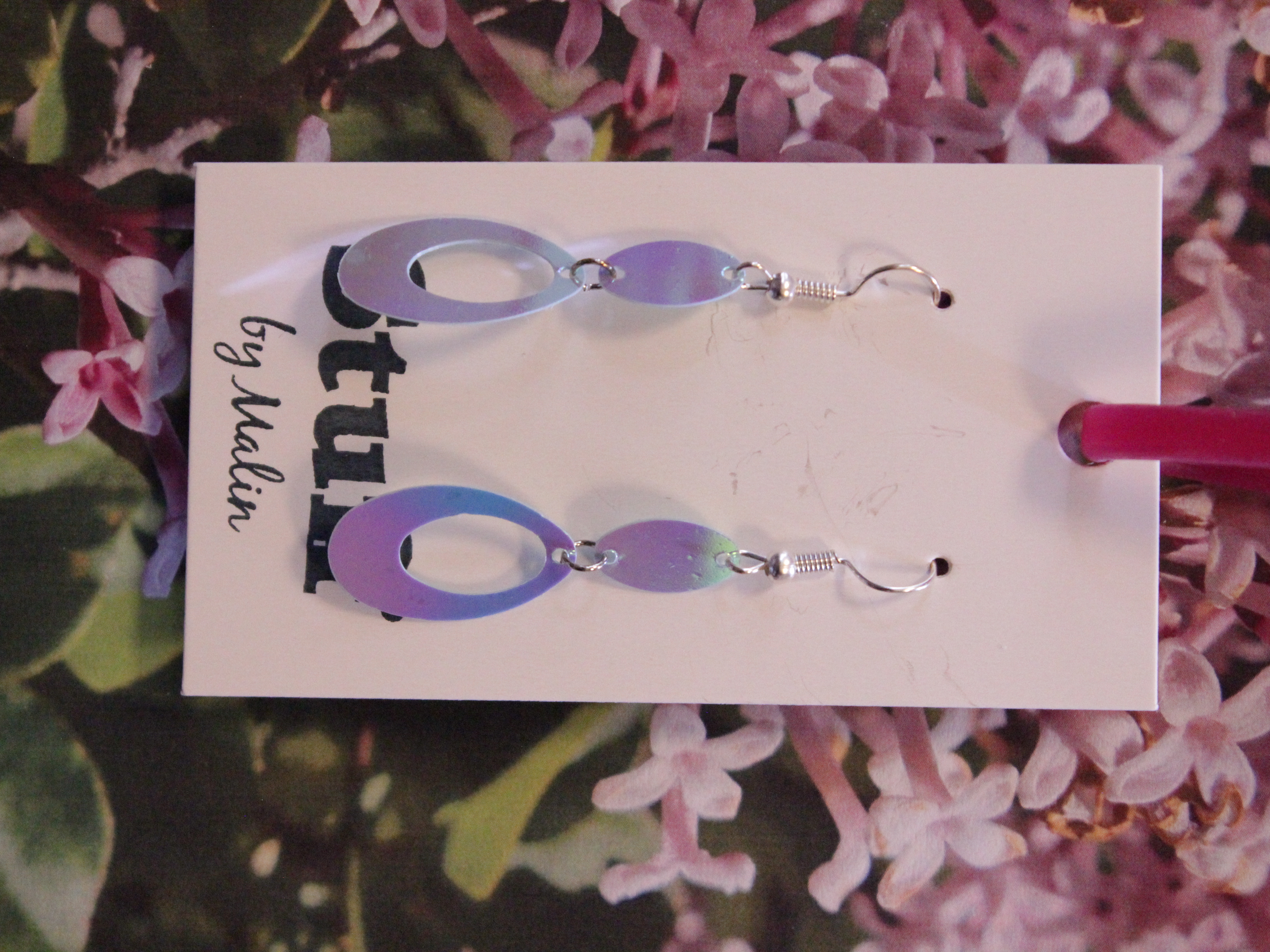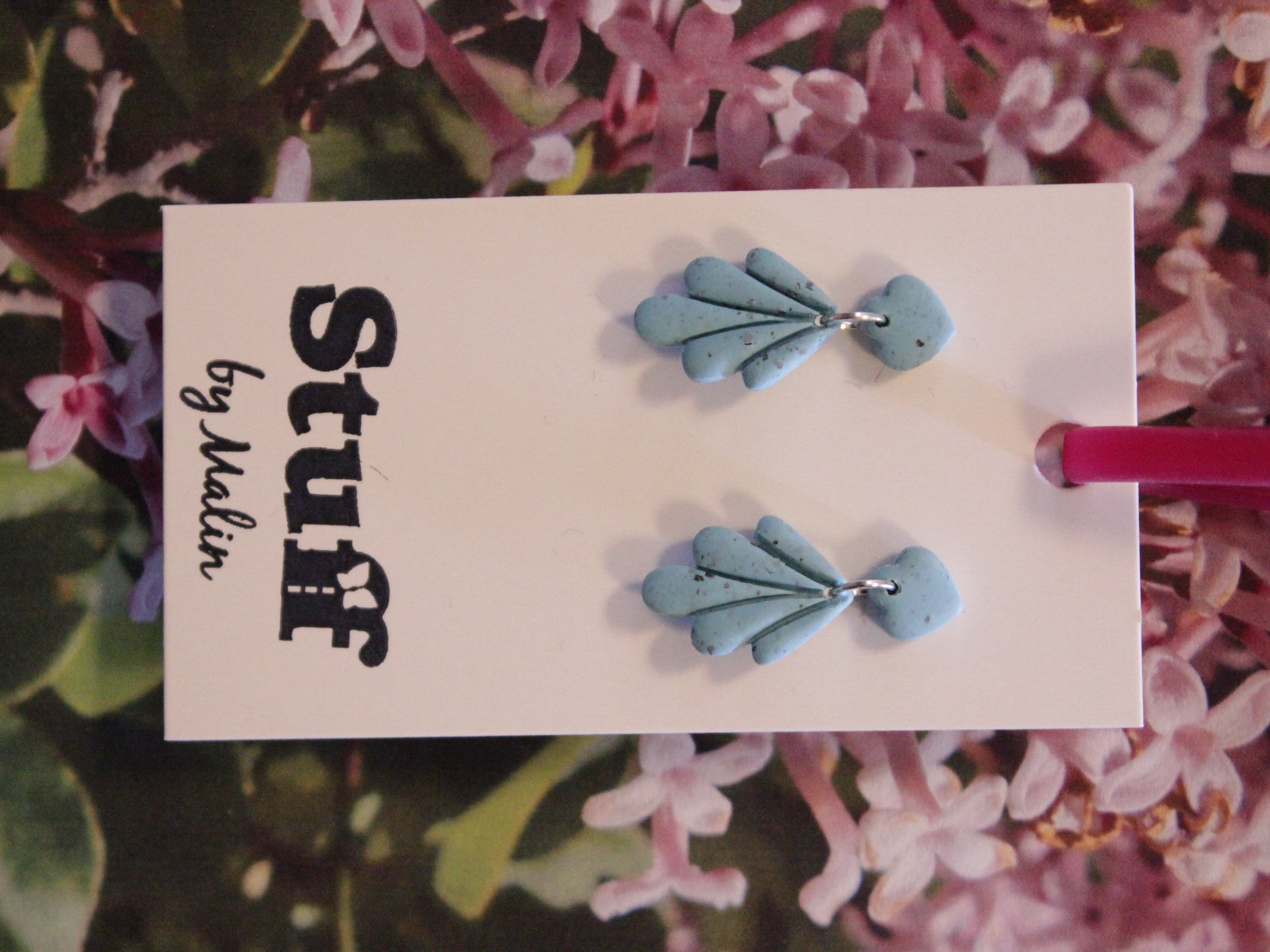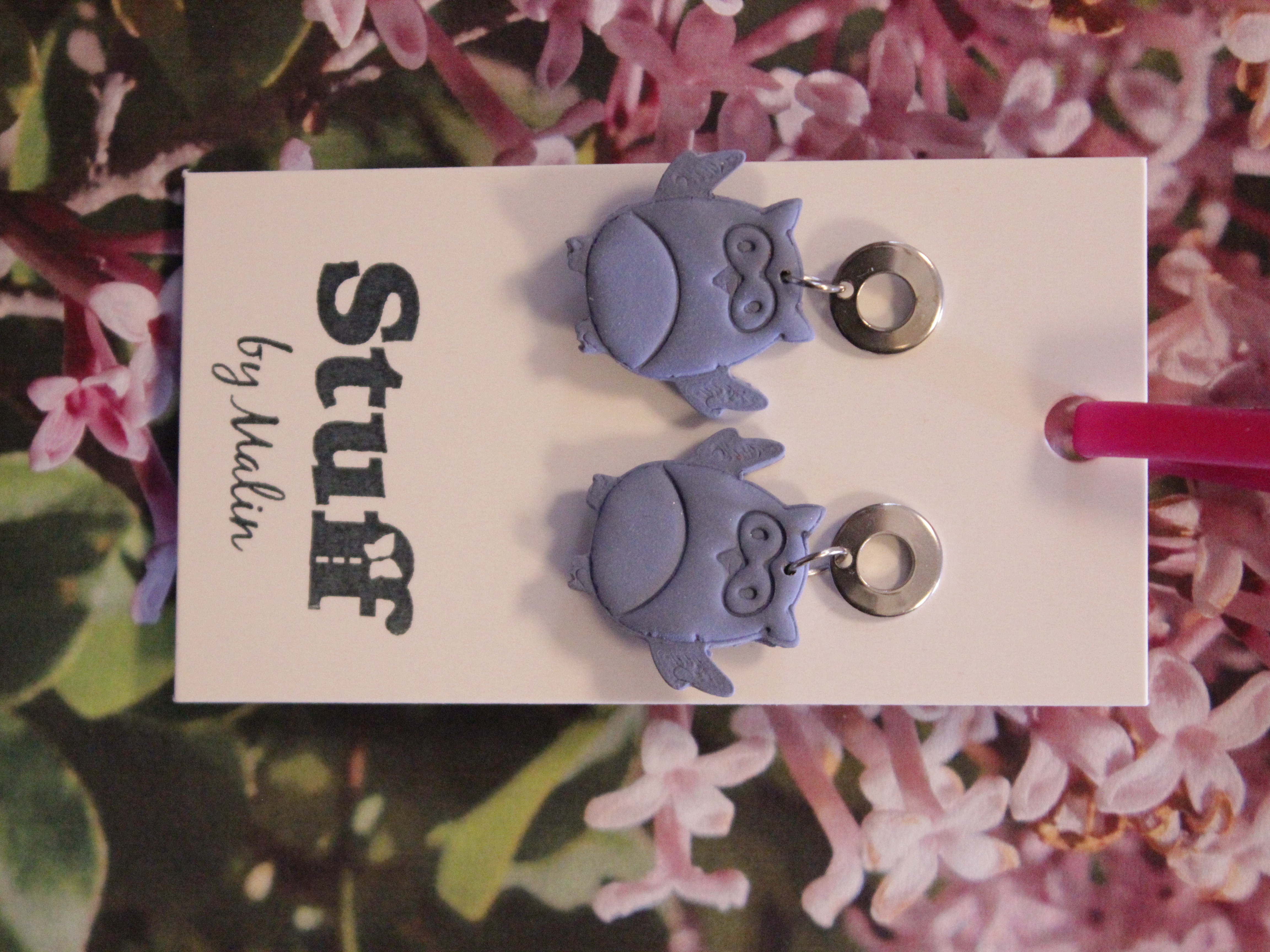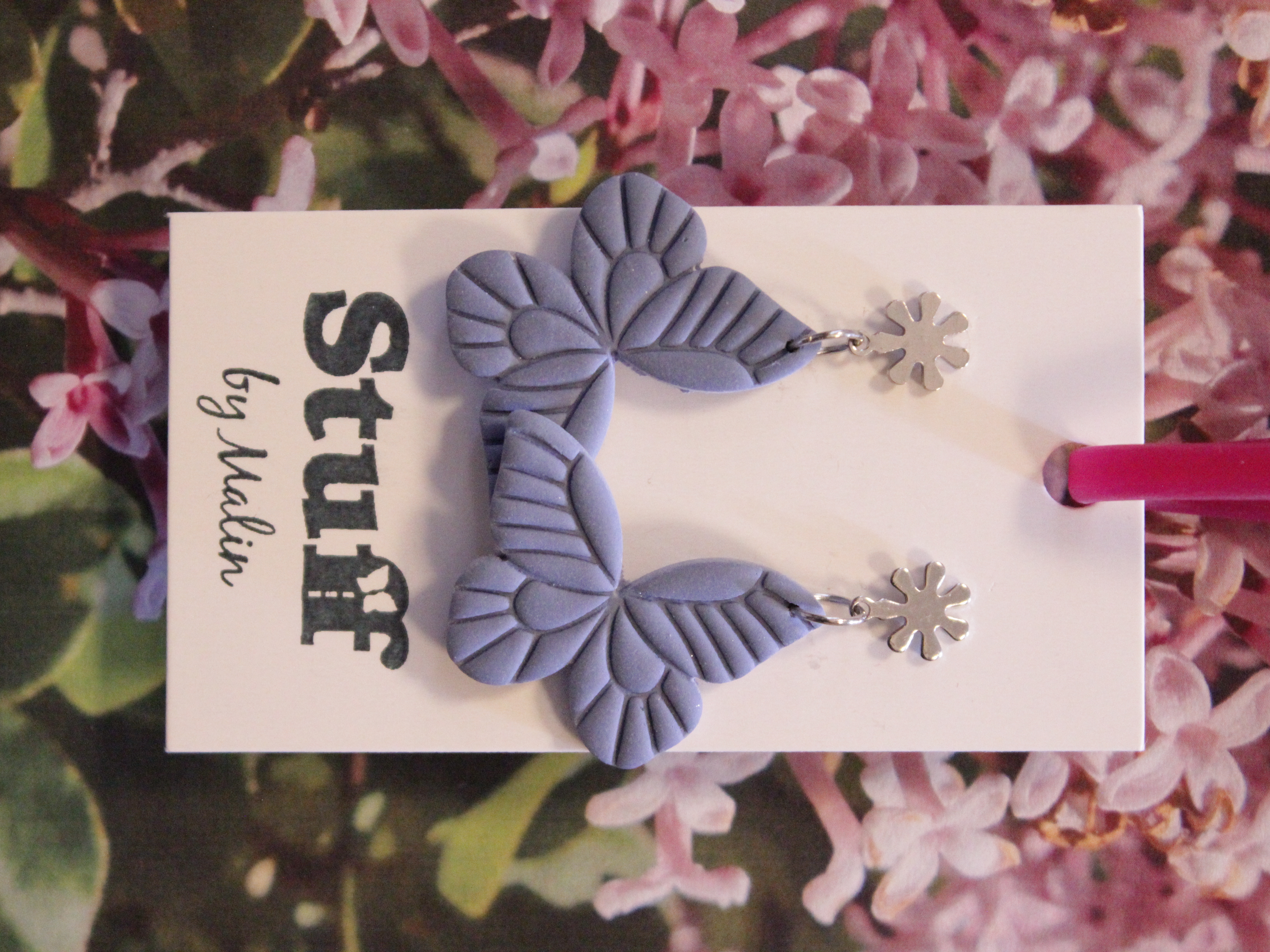 Örhängen tillverkade av polymerlera, pärlor och/eller metallberlocker av olika slag. Alla öronkrokar och stift är nickelfria. Smycken tillverkade av polymerlera är efter härdning i ugn mycket lätta och aningen flexibla.