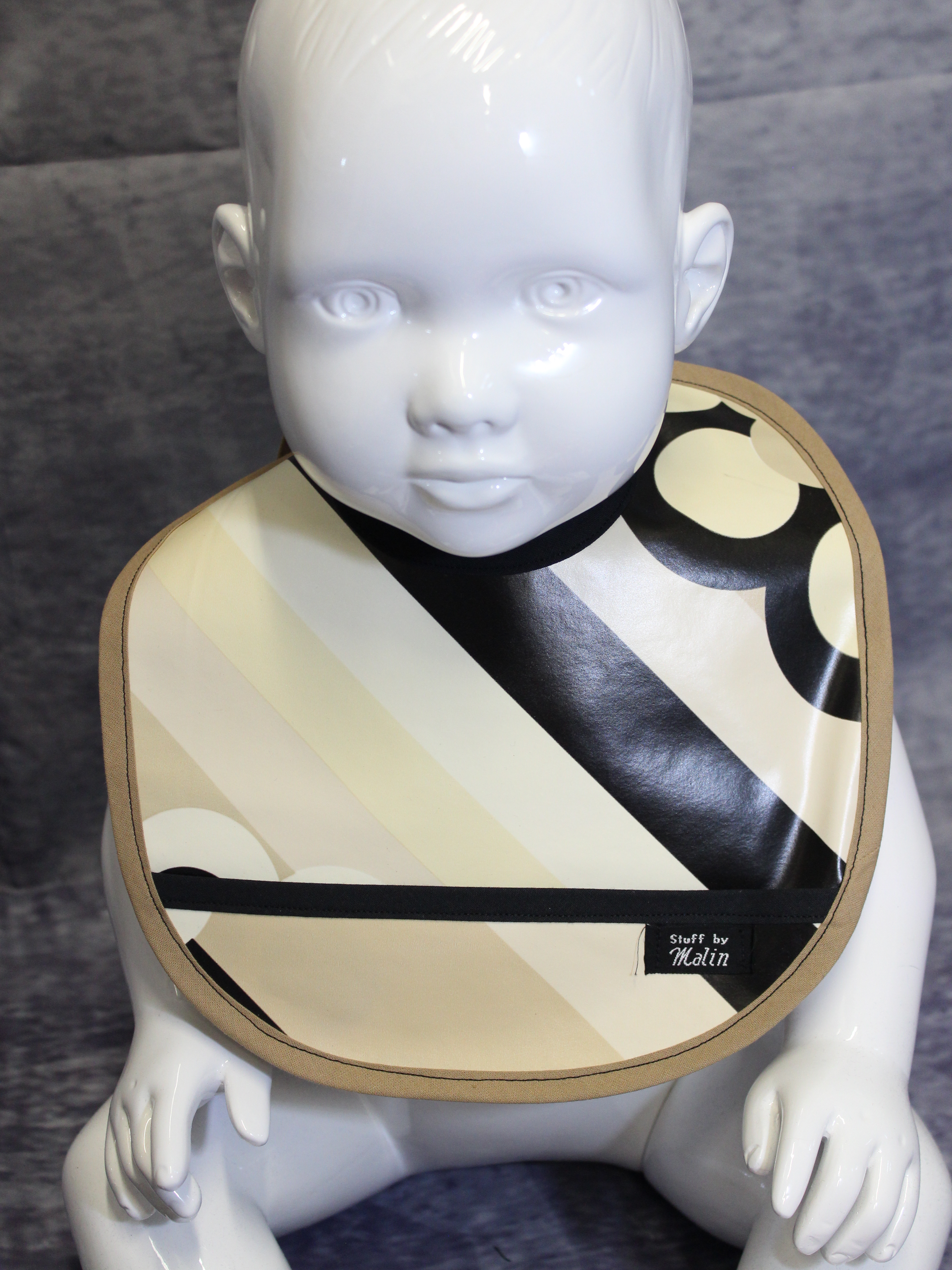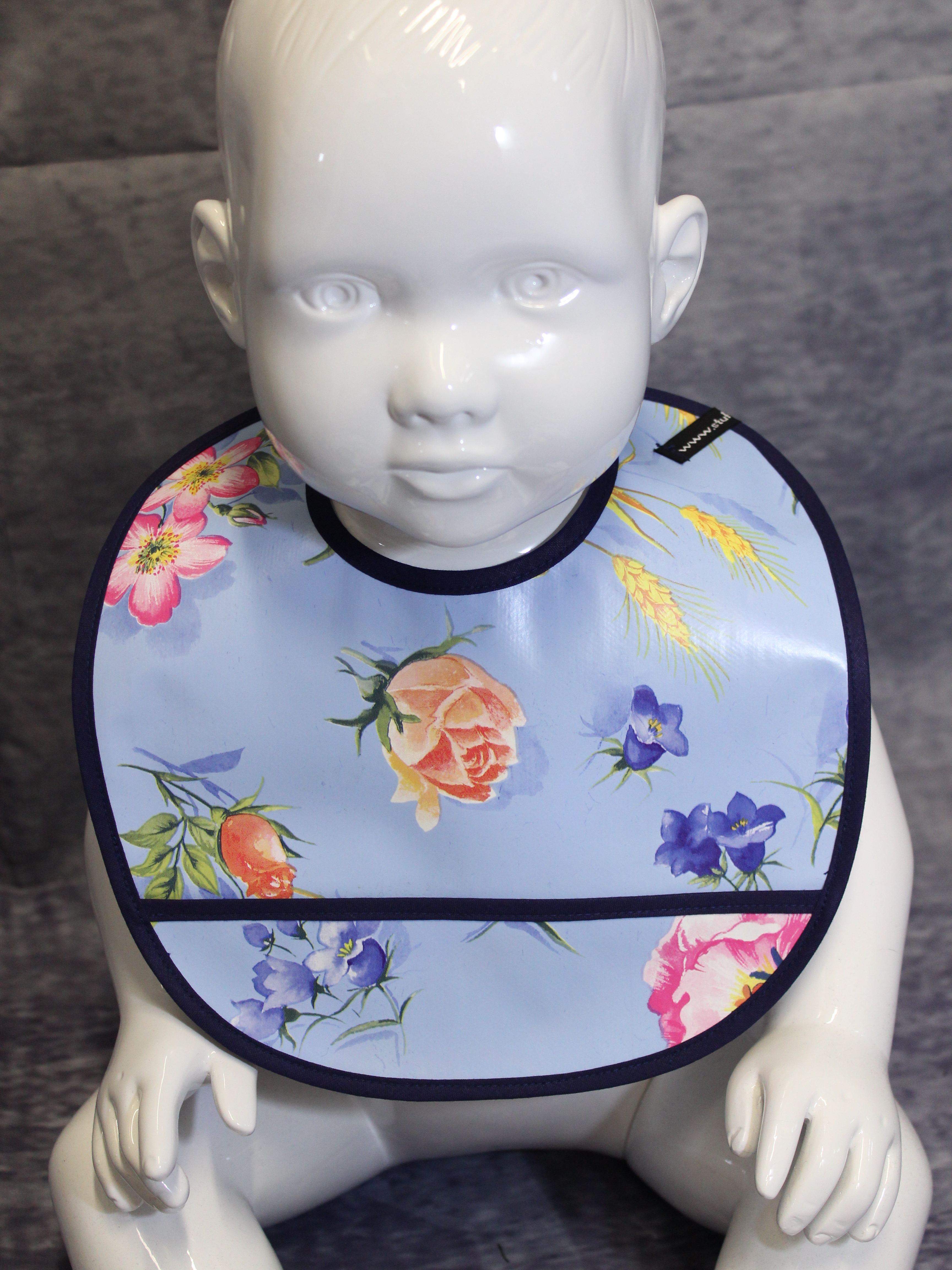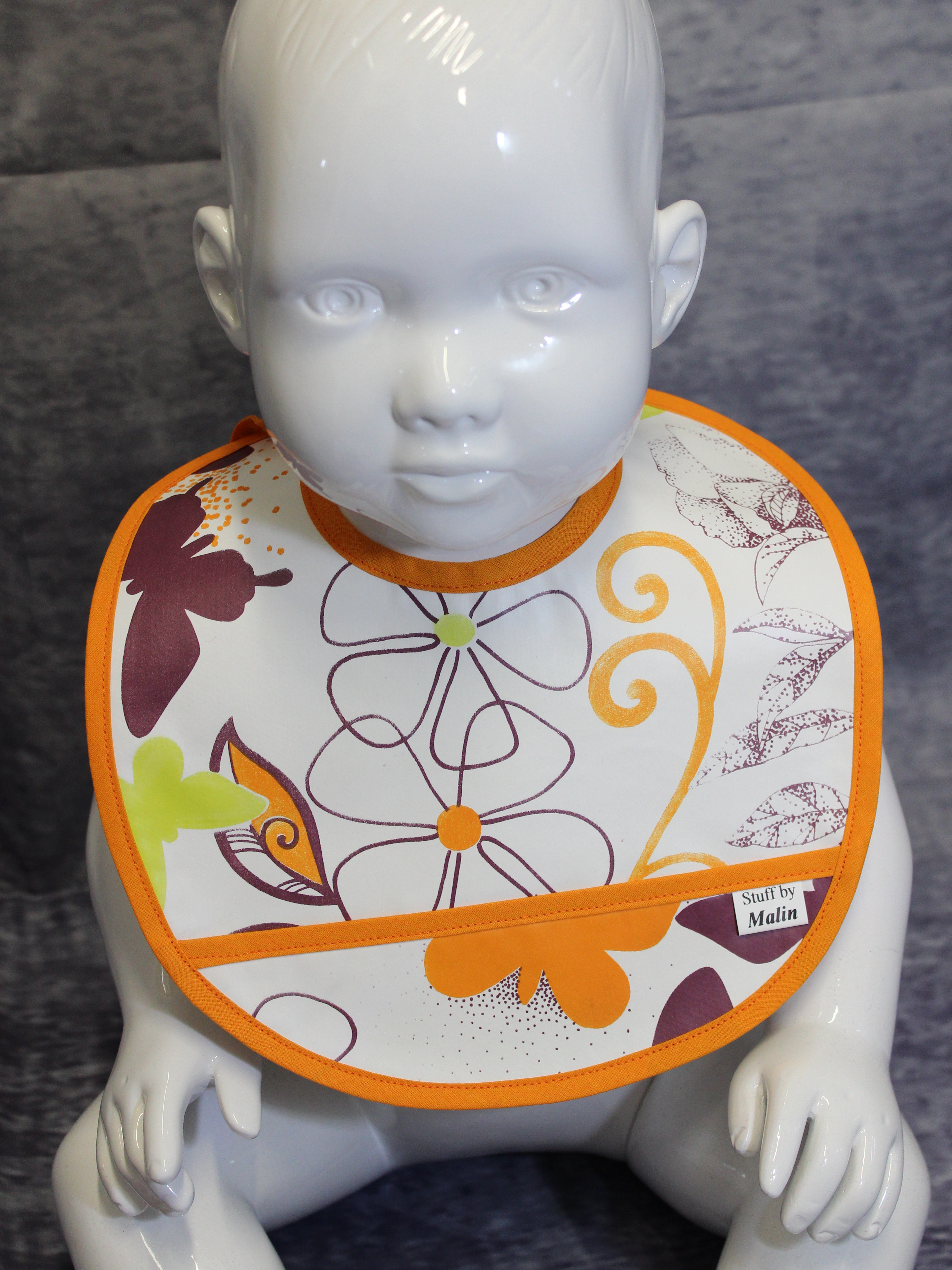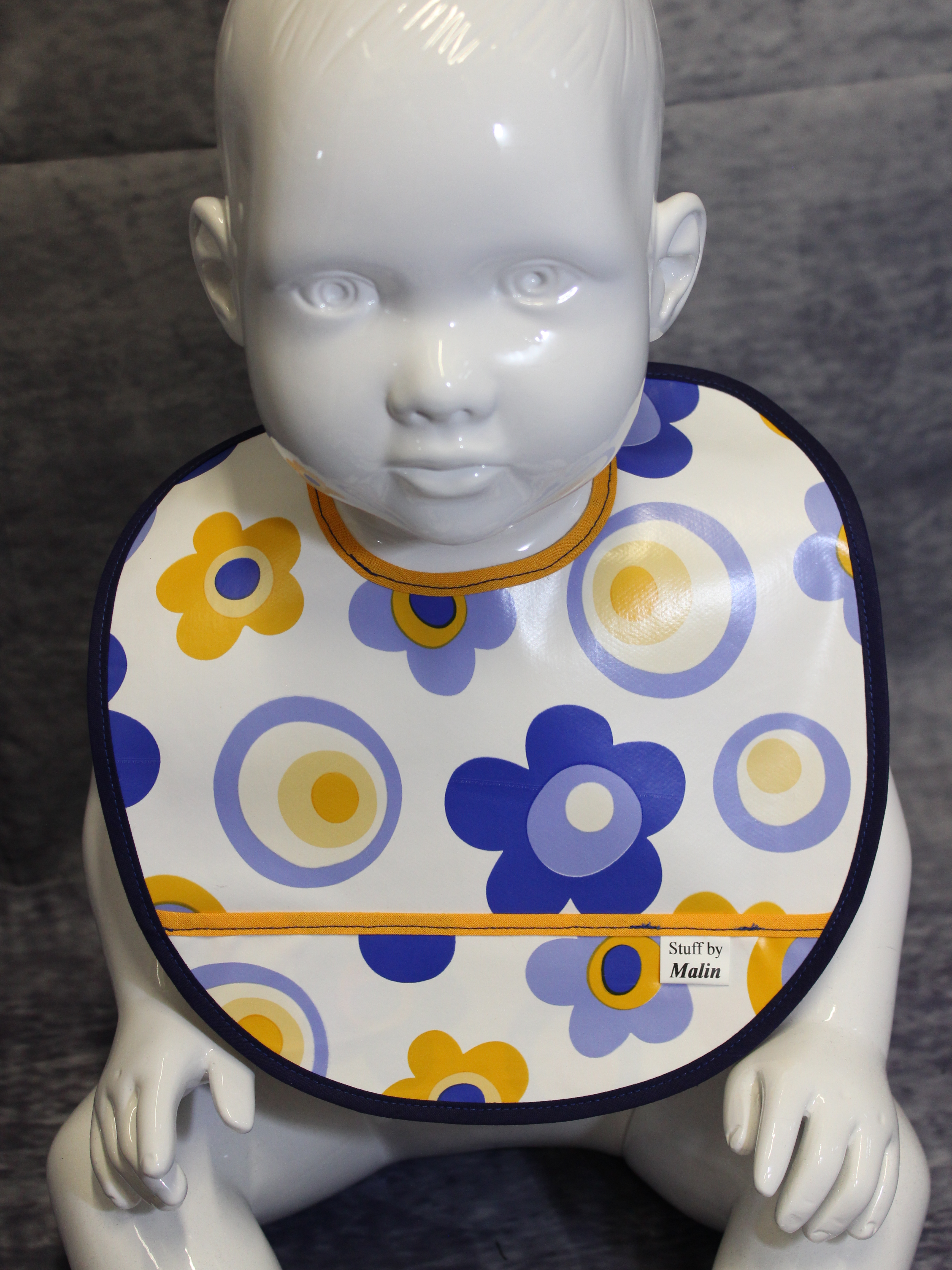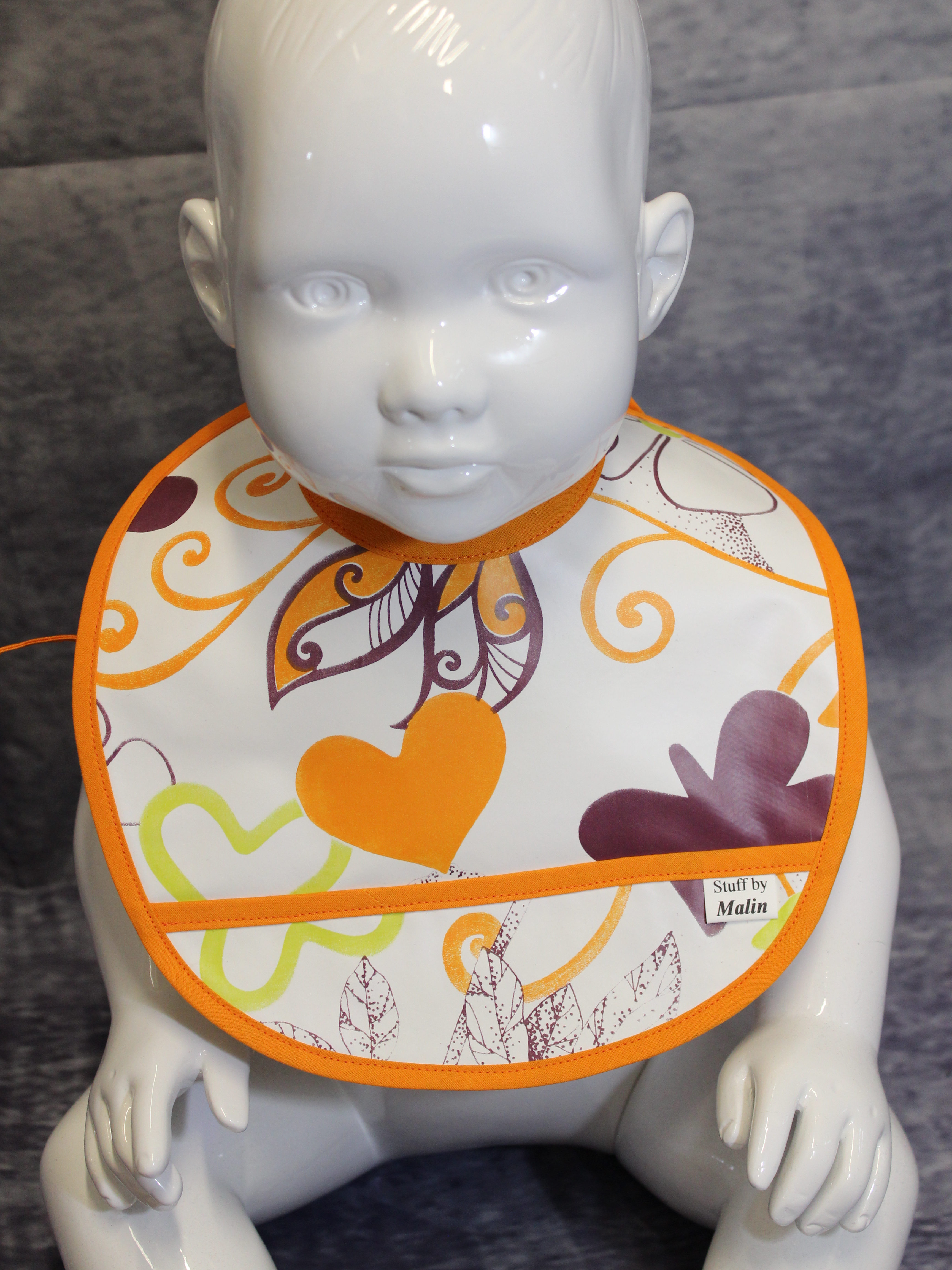 Gjorda av vaxduk eller vaxad bomull. Alla haklappar har ficka nedtill för att samla upp det spillda. Stängs med knytband. Kantband i bomull. Enkel att ha i skötväskan då den tar liten plats ihopvikt :)