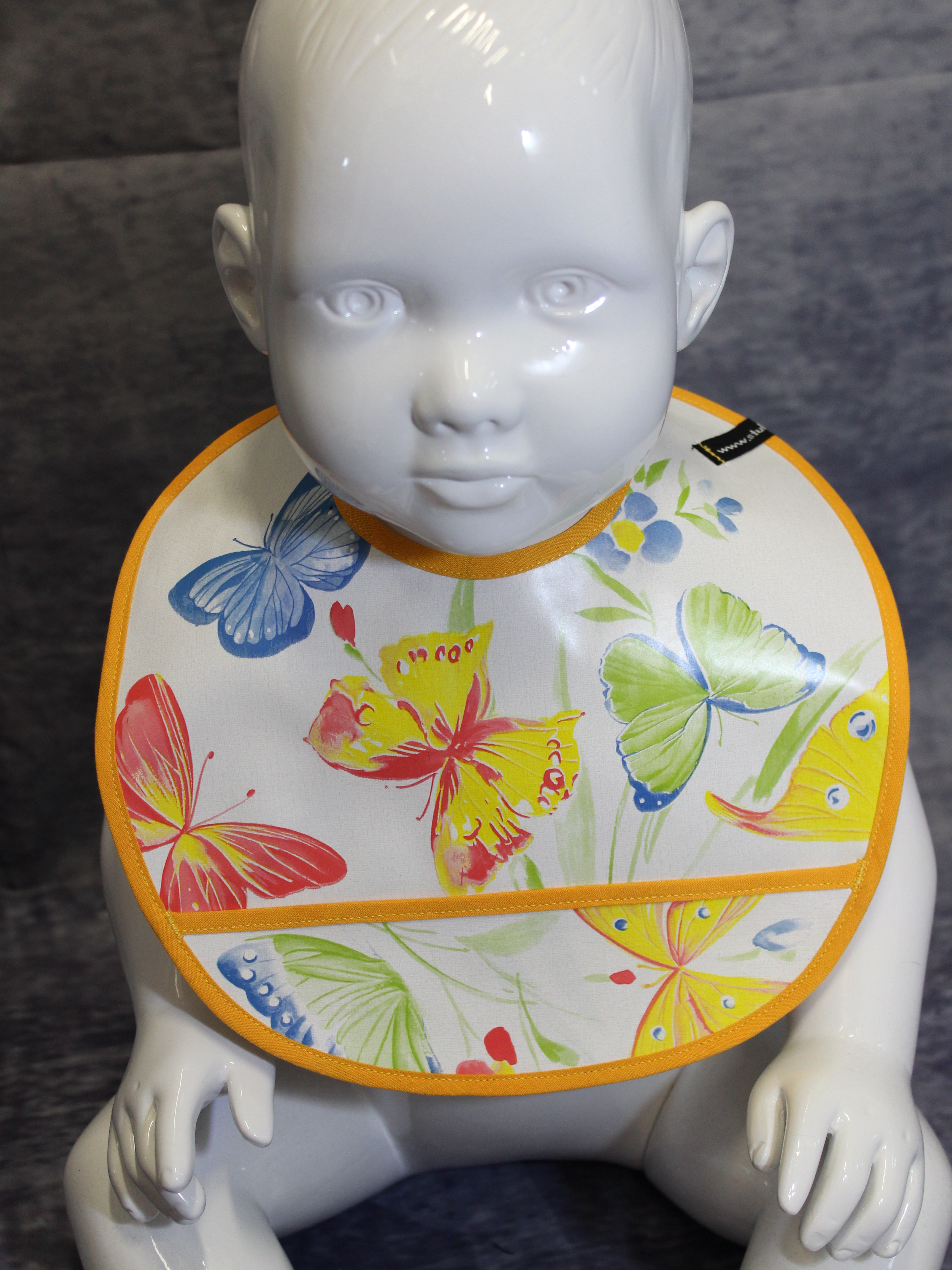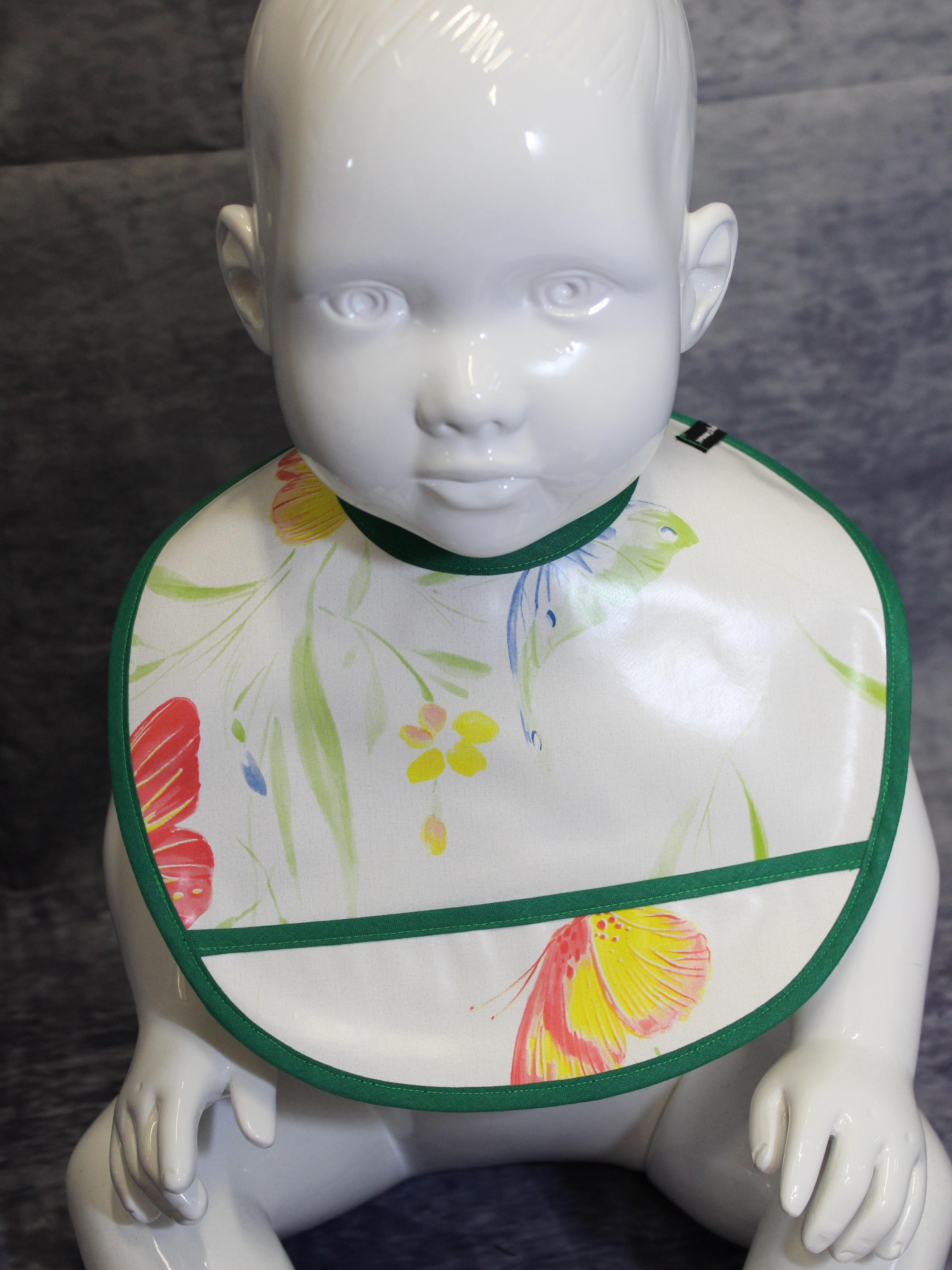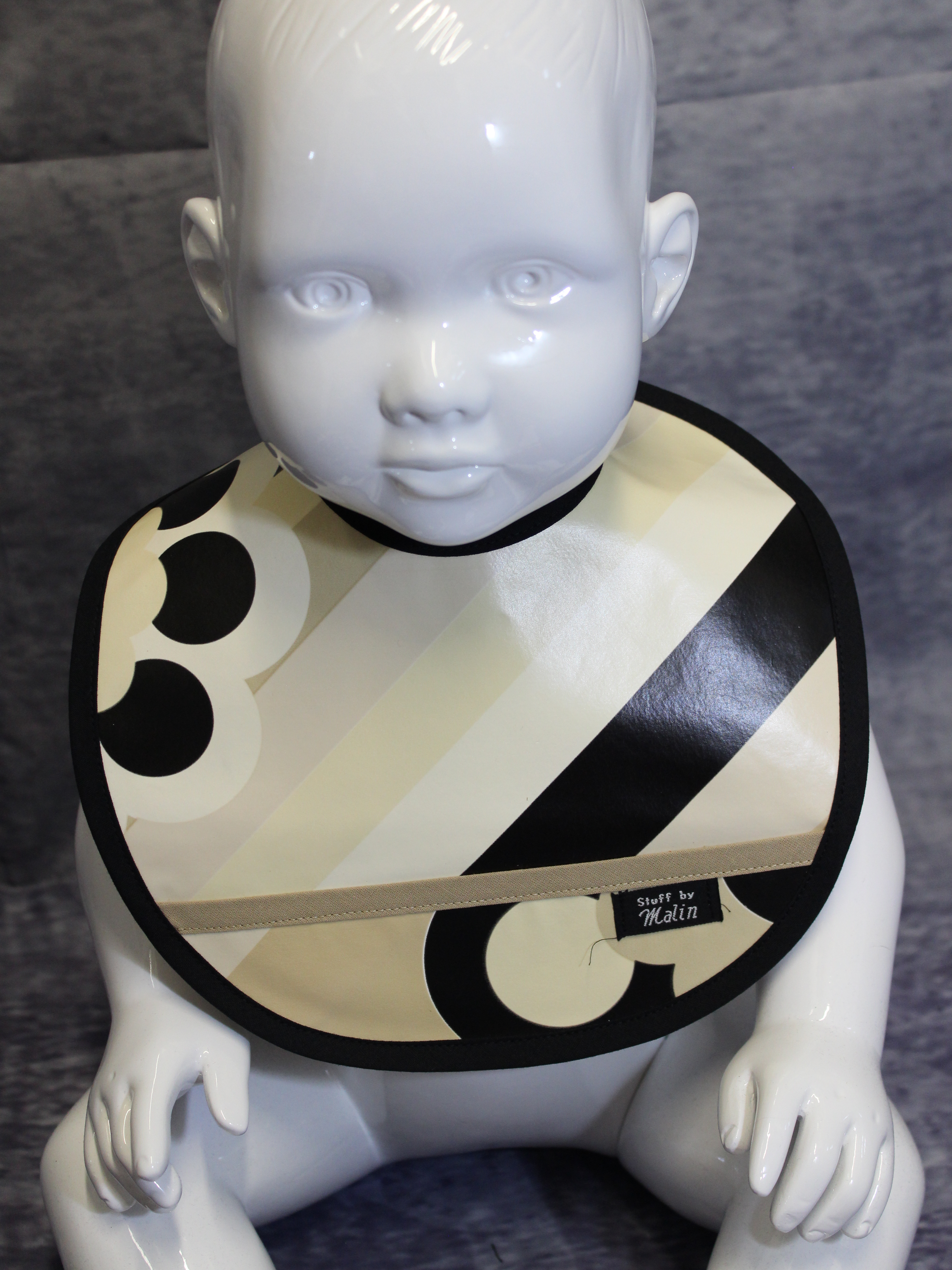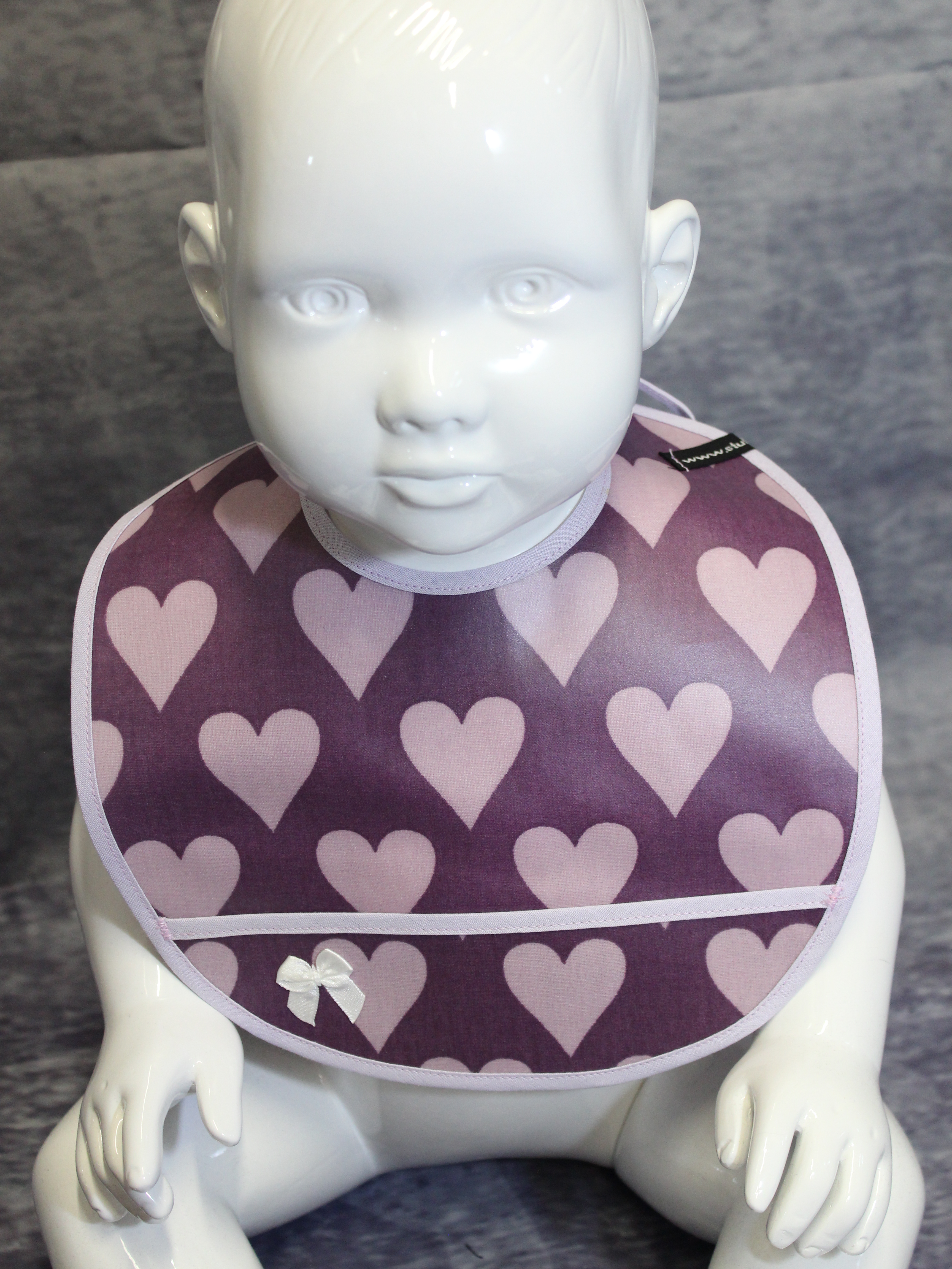 Gjorda av vaxduk eller vaxad bomull. Alla haklappar har ficka nedtill för att samla upp det spillda. Stängs med knytband. Kantband i bomull. Enkel att ha i skötväskan då den tar liten plats ihopvikt :)