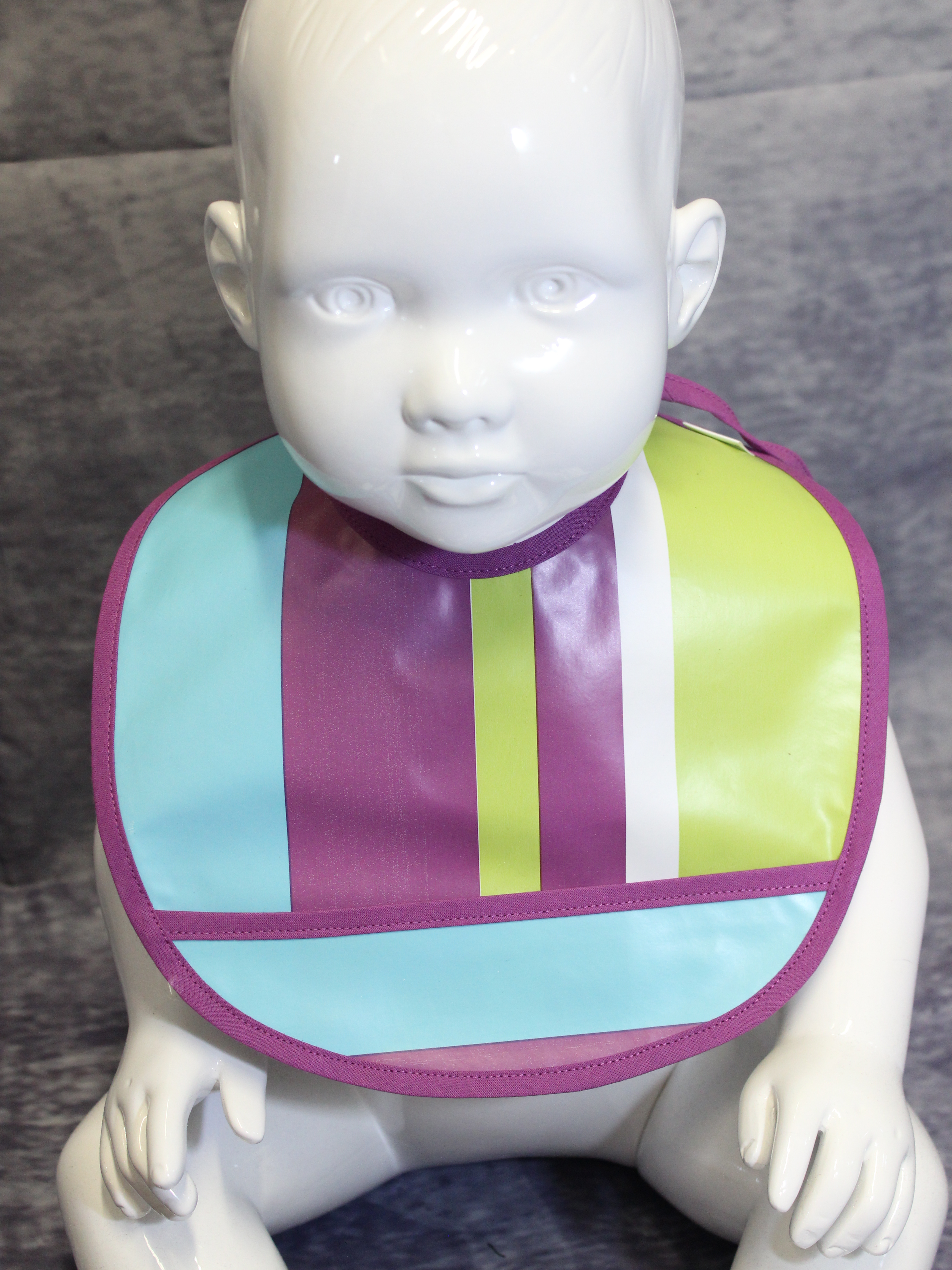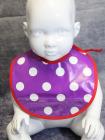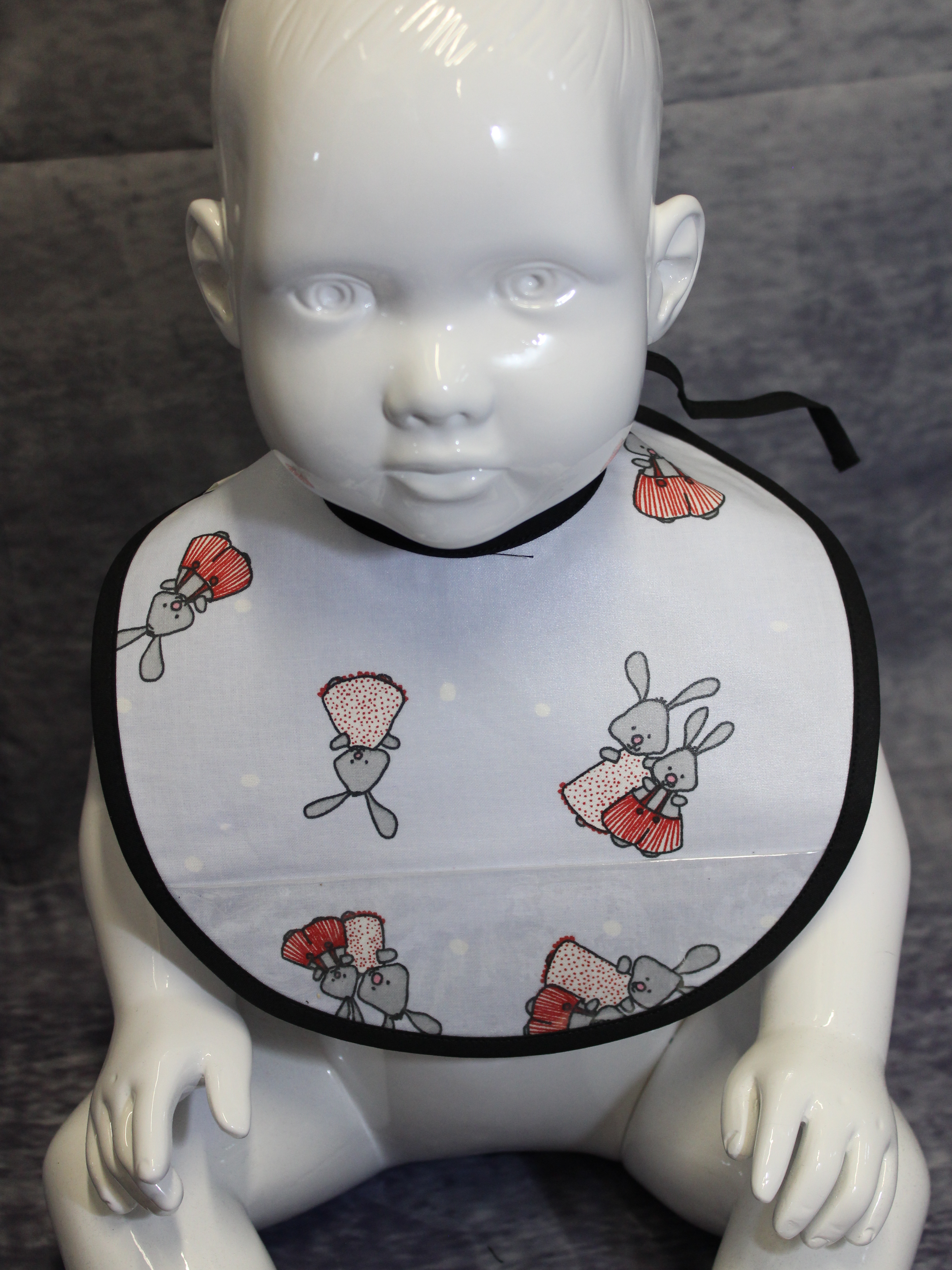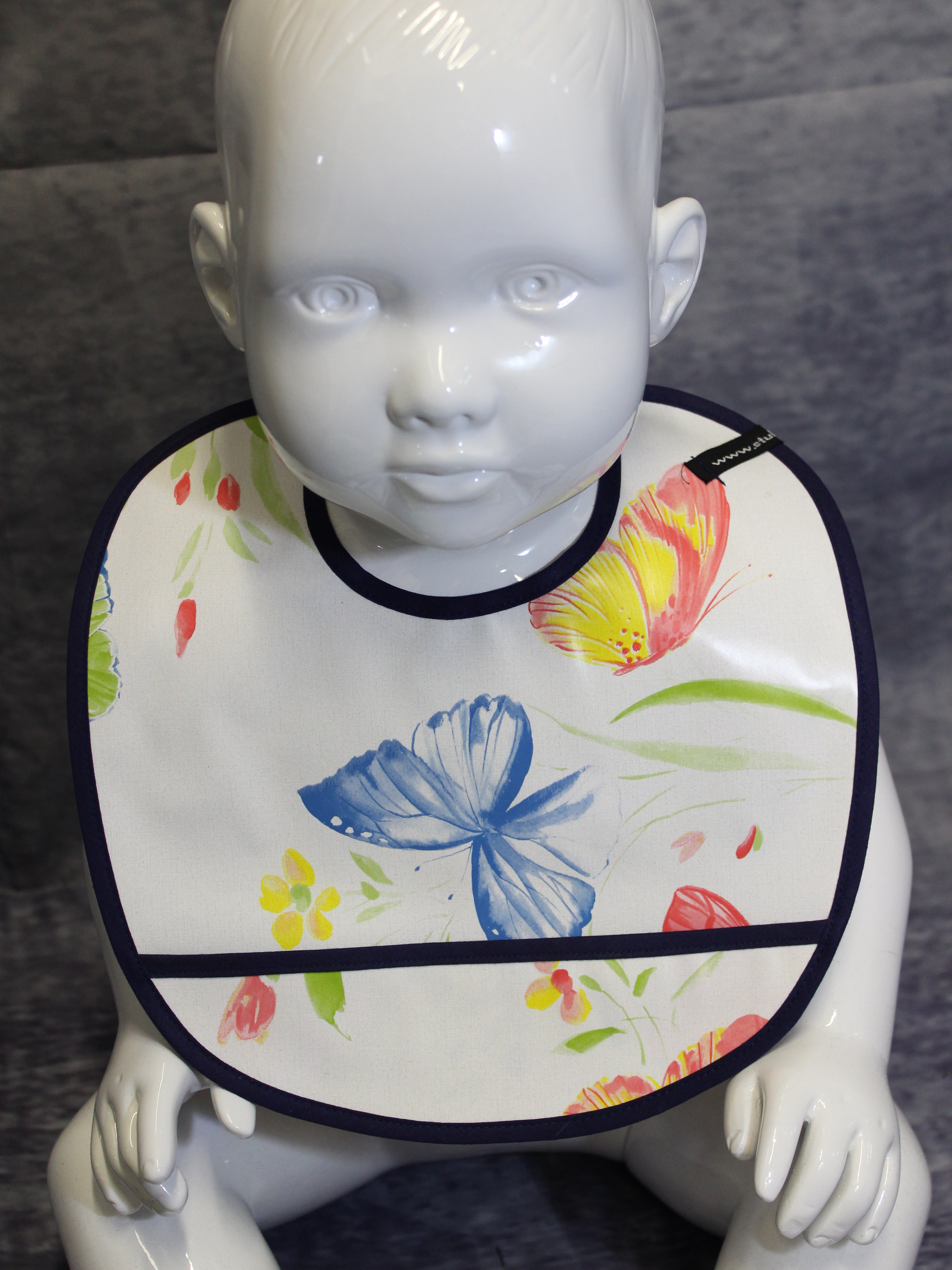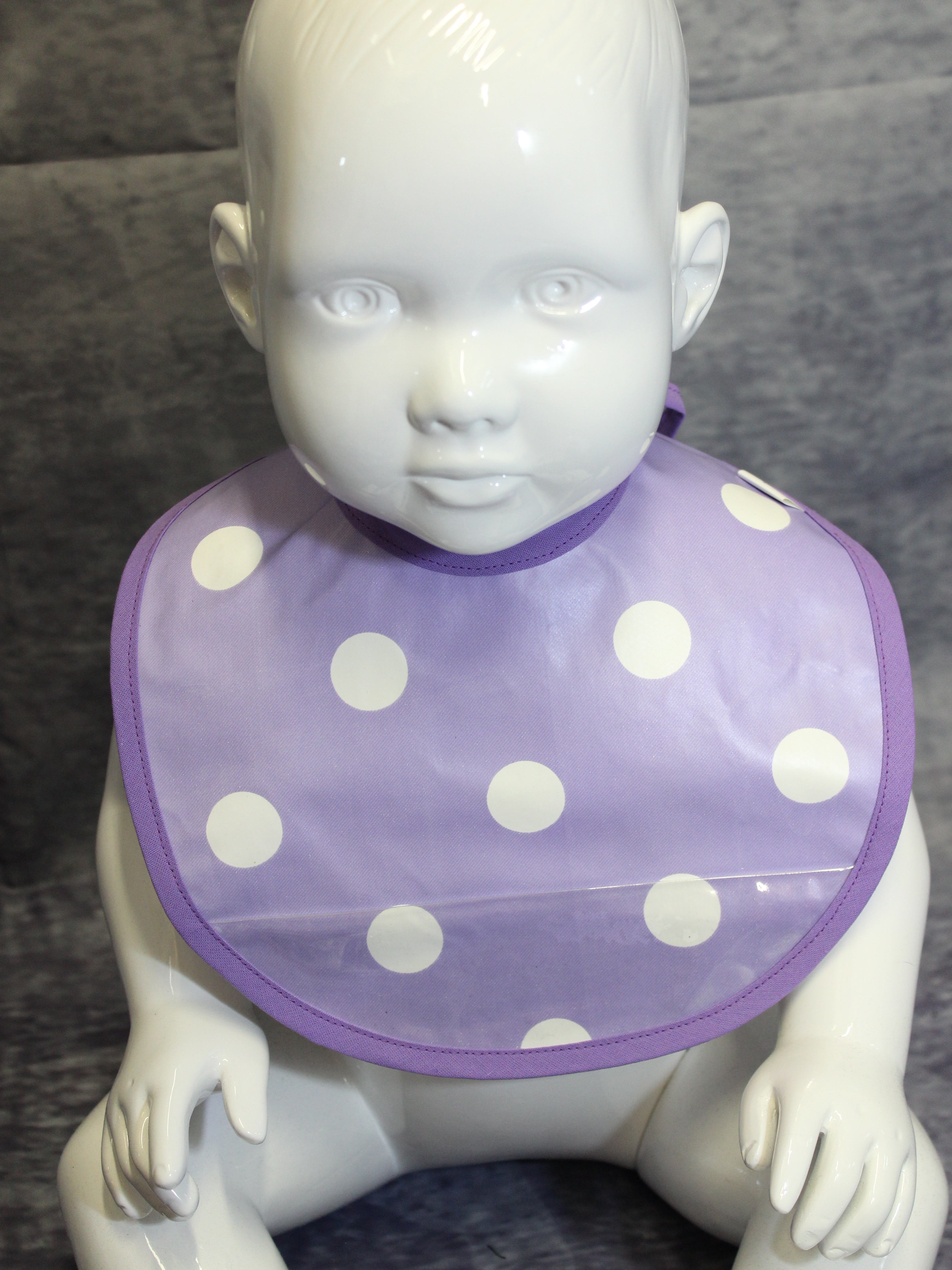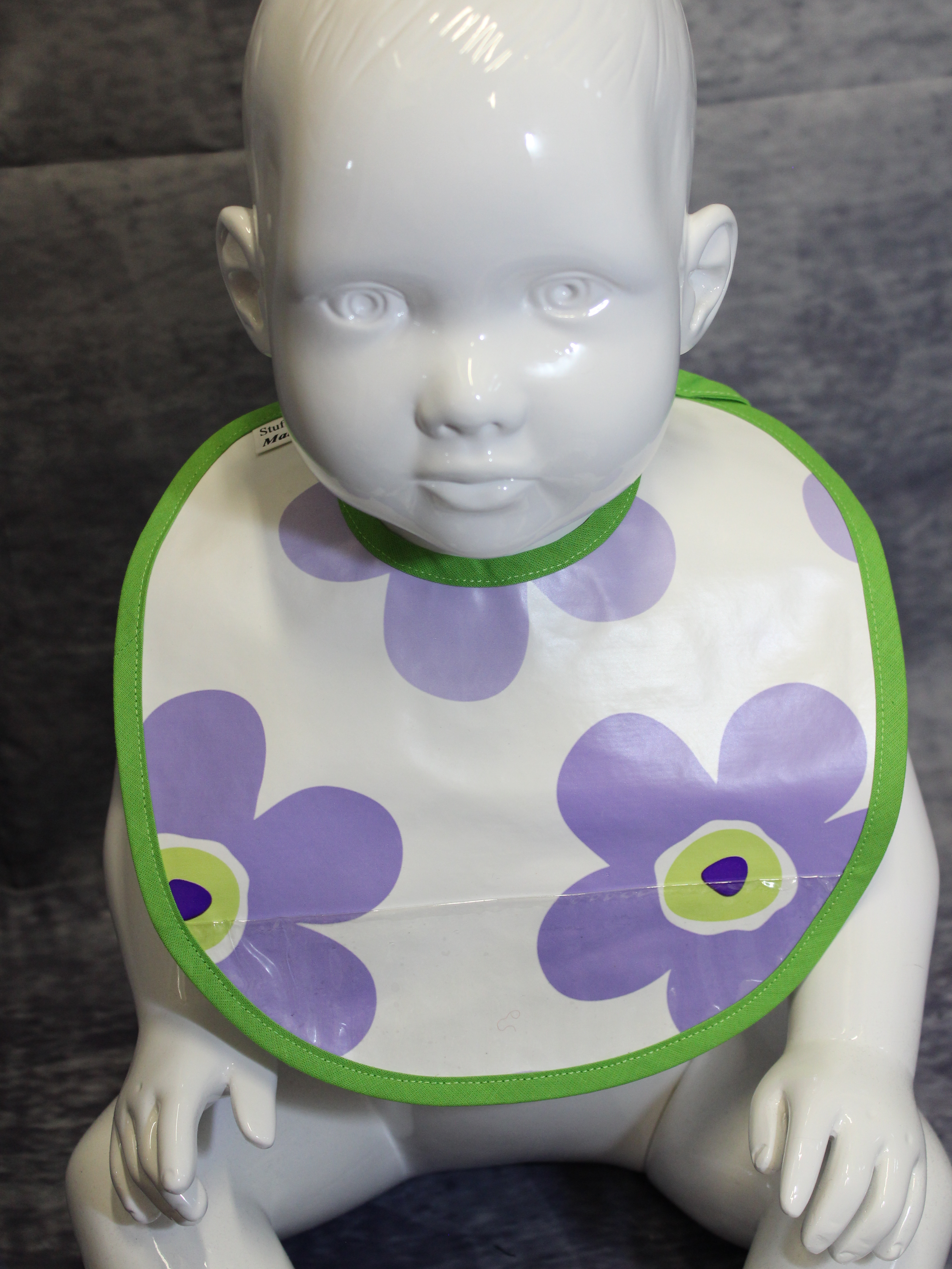 Gjorda av vaxduk eller vaxad bomull. Alla haklappar har ficka nedtill för att samla upp det spillda. Stängs med knytband. Kantband i bomull. Enkel att ha i skötväskan då den tar liten plats ihopvikt :)