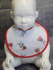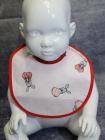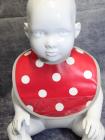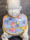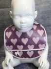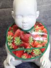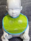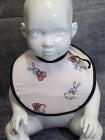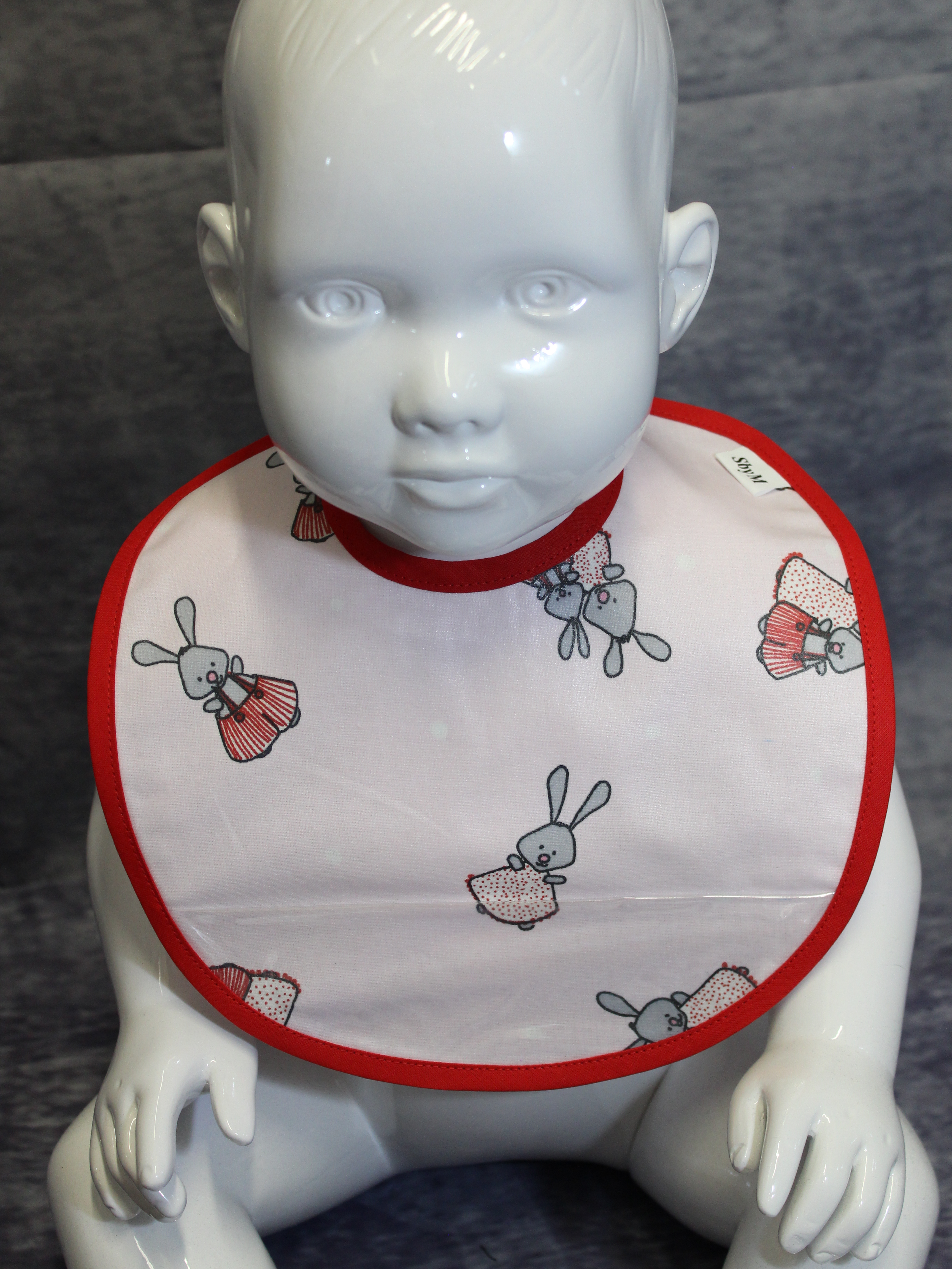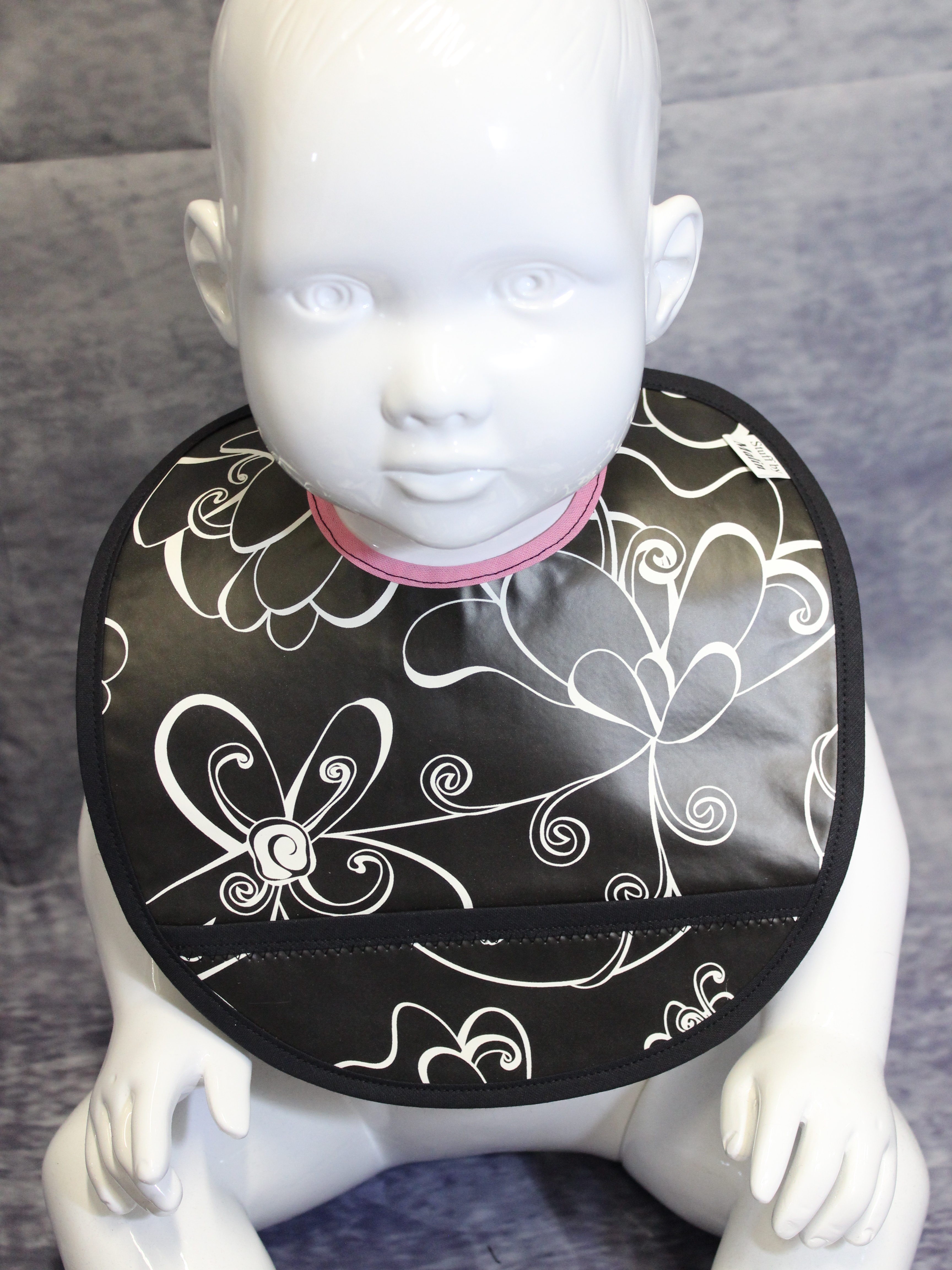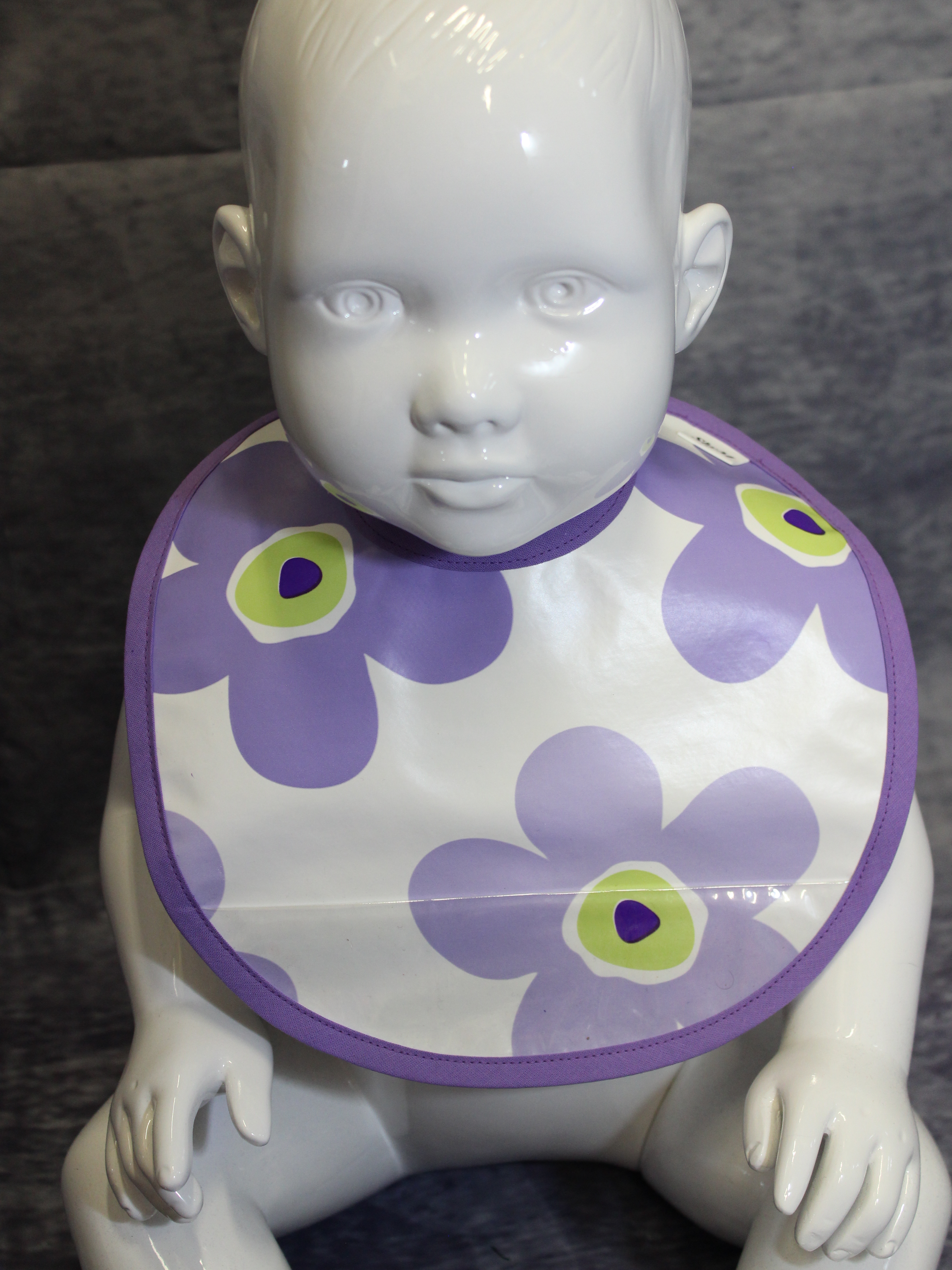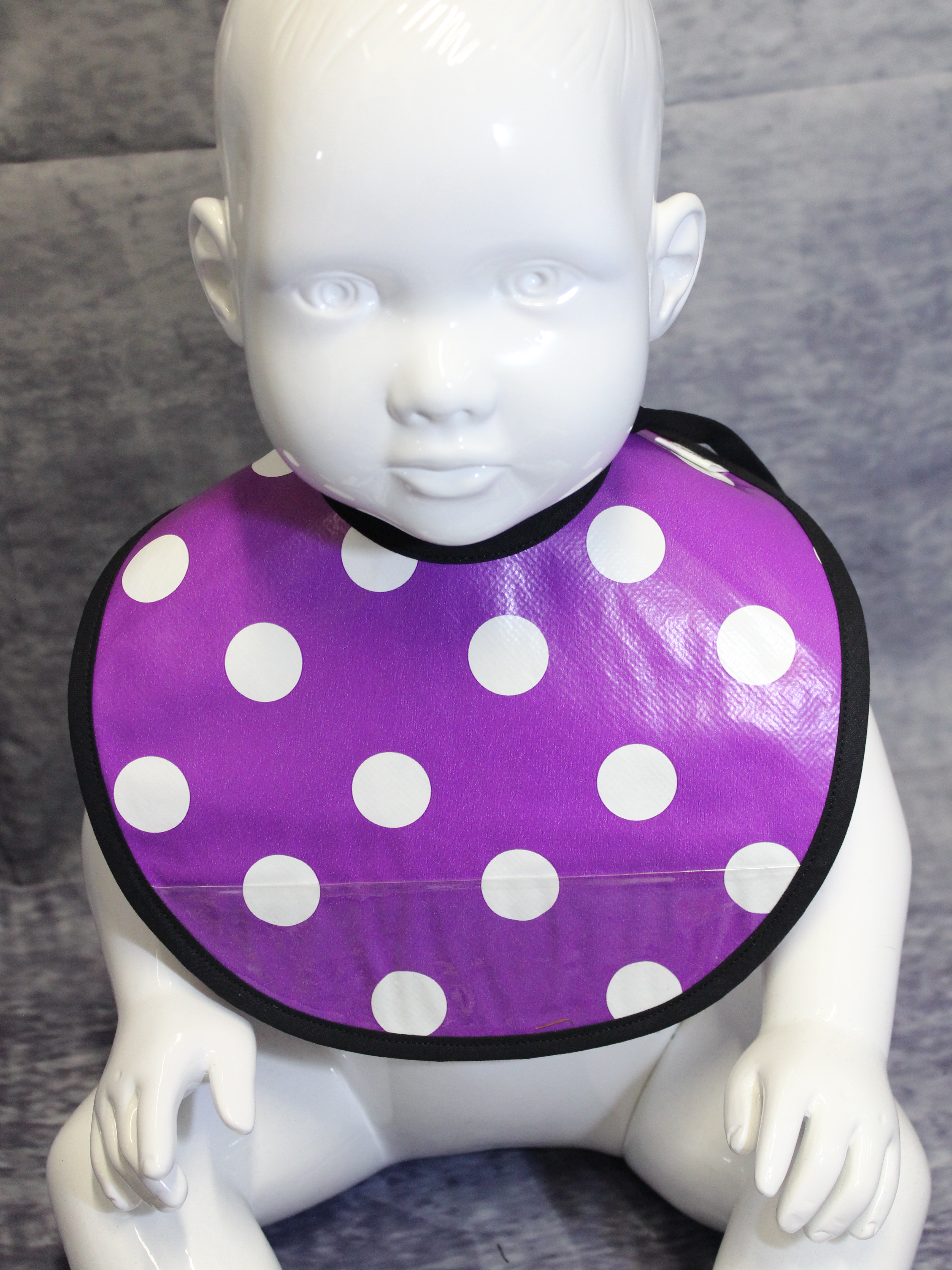 Gjorda av vaxduk eller vaxad bomull. Alla haklappar har ficka nedtill för att samla upp det spillda. Stängs med knytband. Kantband i bomull. Enkel att ha i skötväskan då den tar liten plats ihopvikt :)
