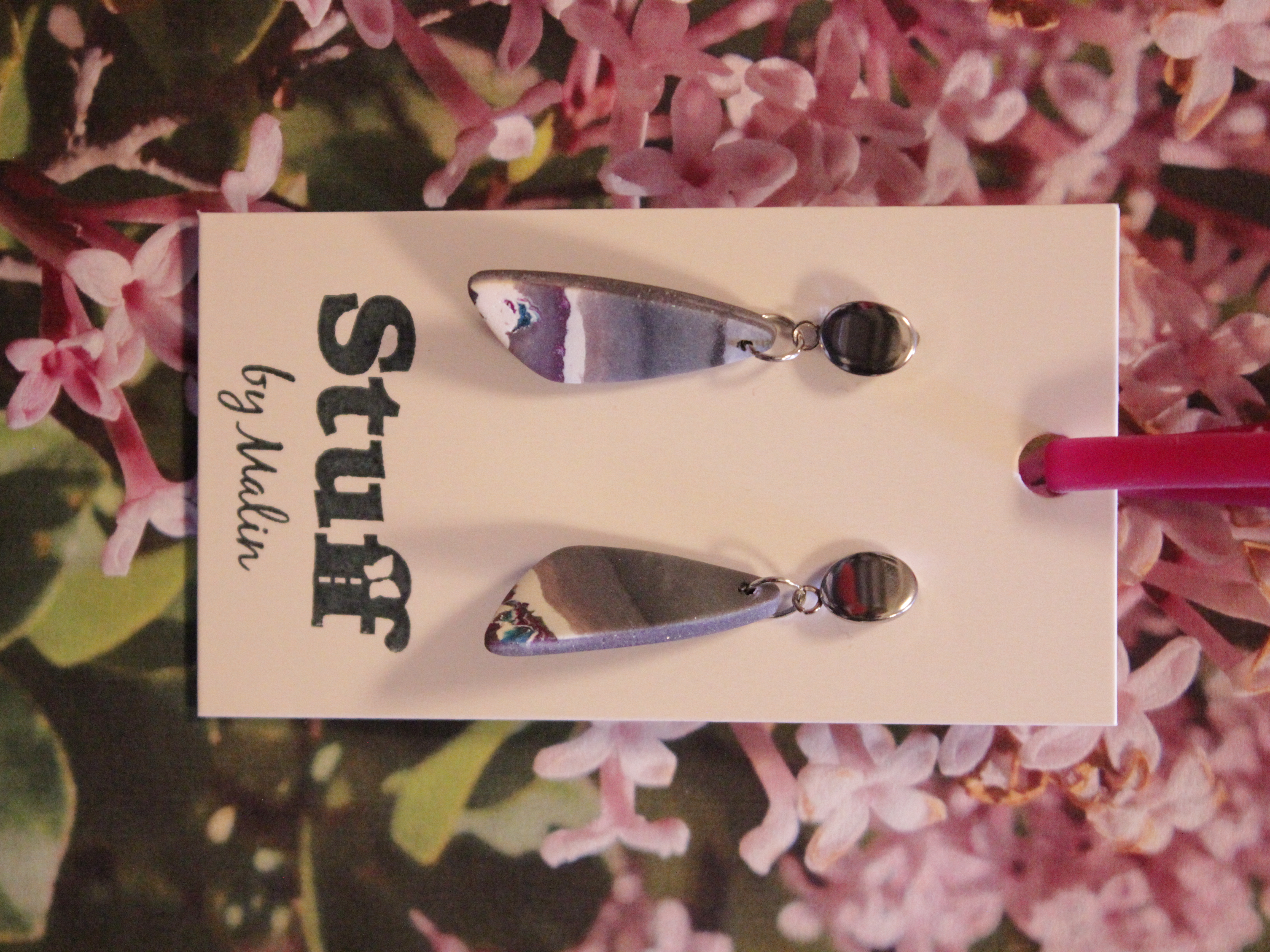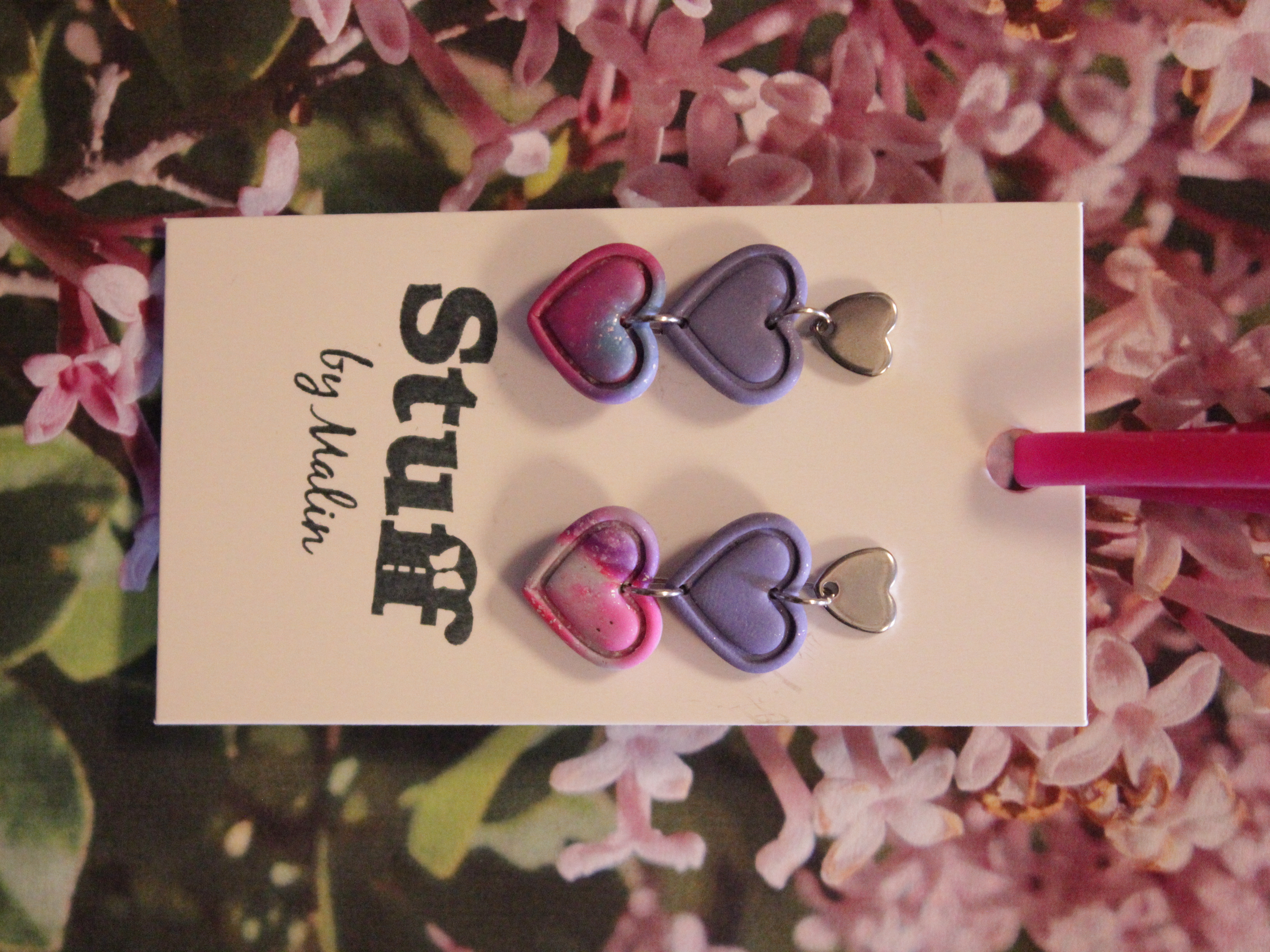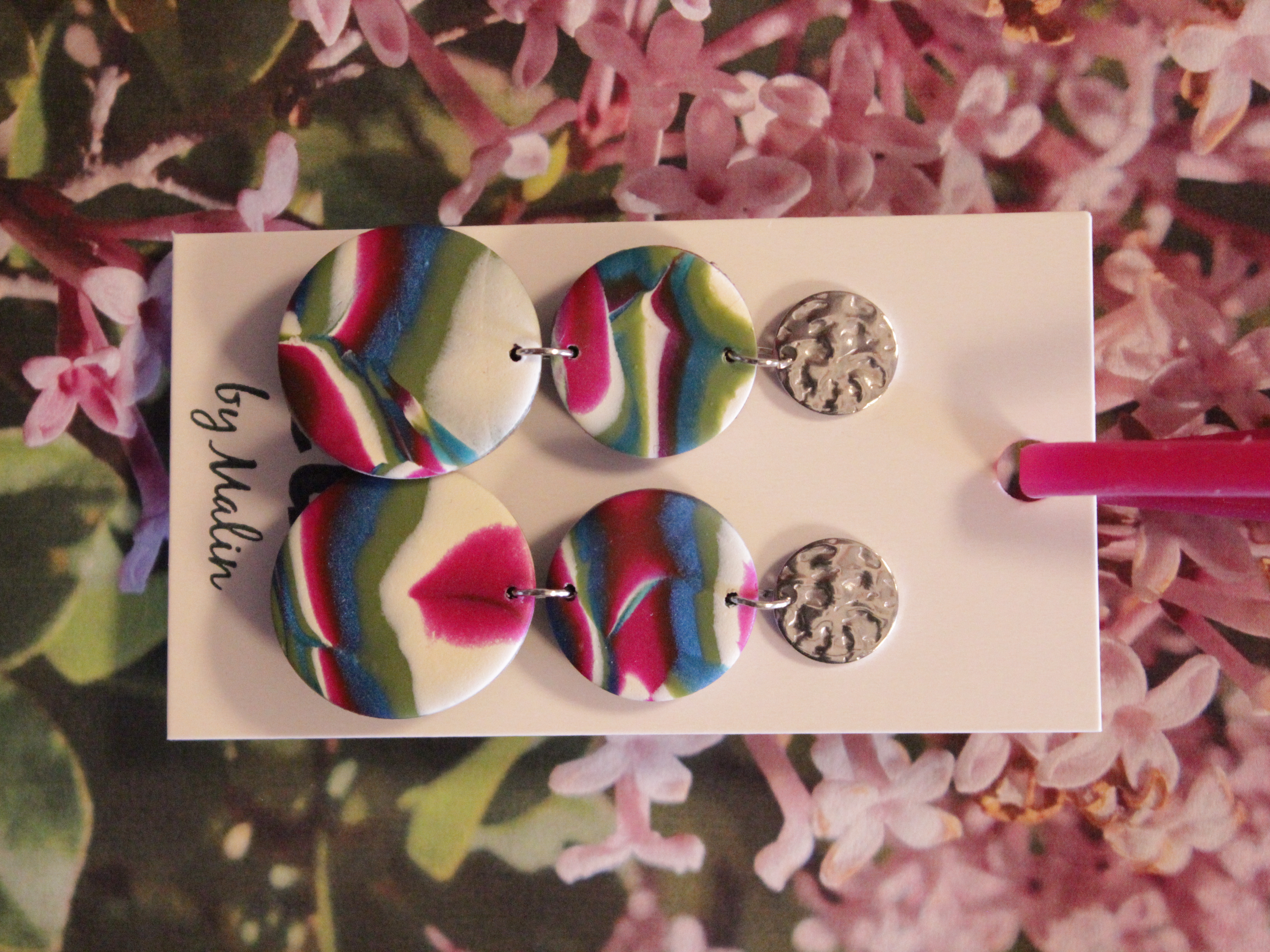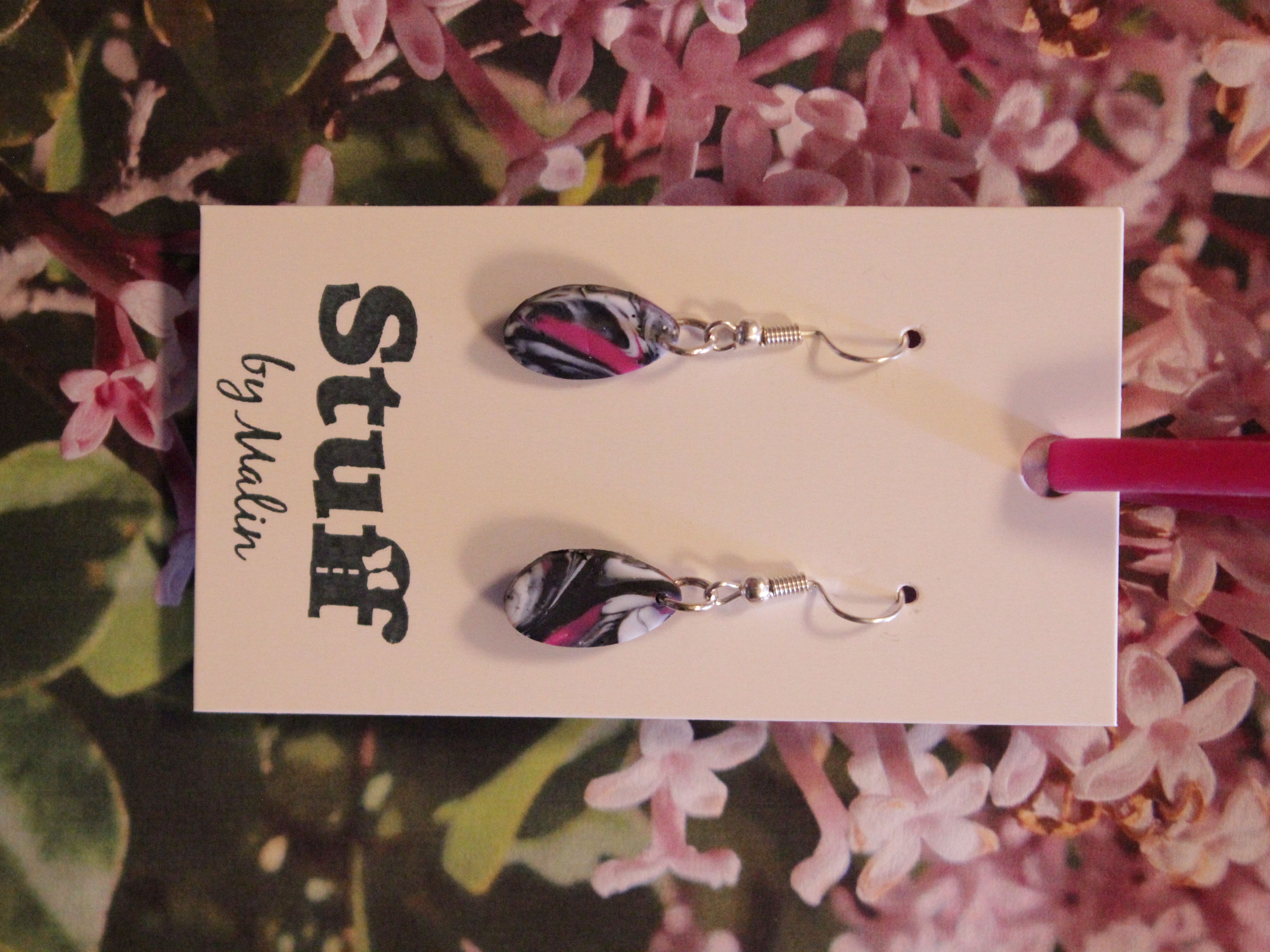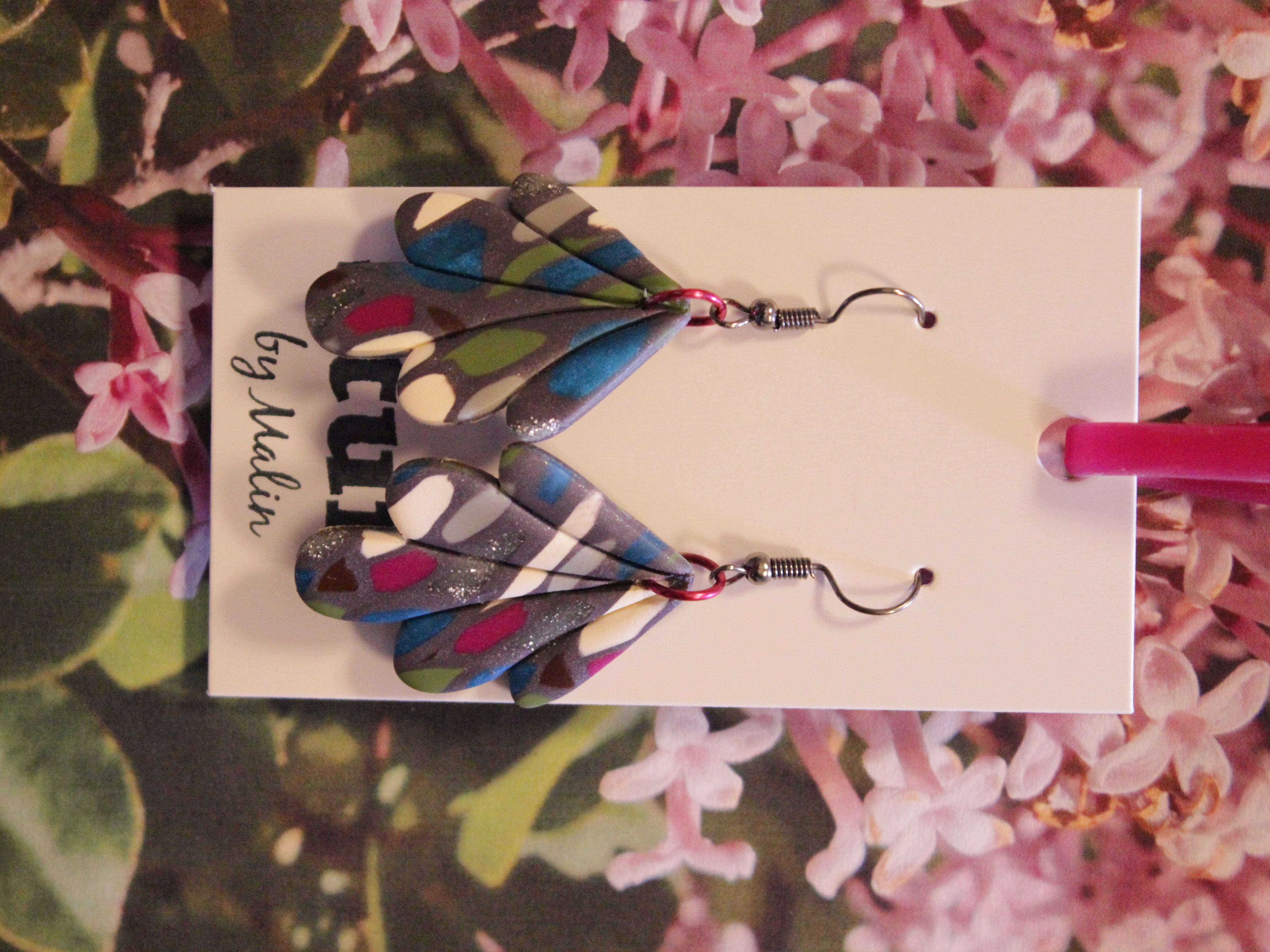 Örhängen tillverkade av polymerlera, pärlor och/eller metallberlocker av olika slag. Alla öronkrokar och stift är nickelfria. Smycken tillverkade av polymerlera är efter härdning i ugn mycket lätta och aningen flexibla.