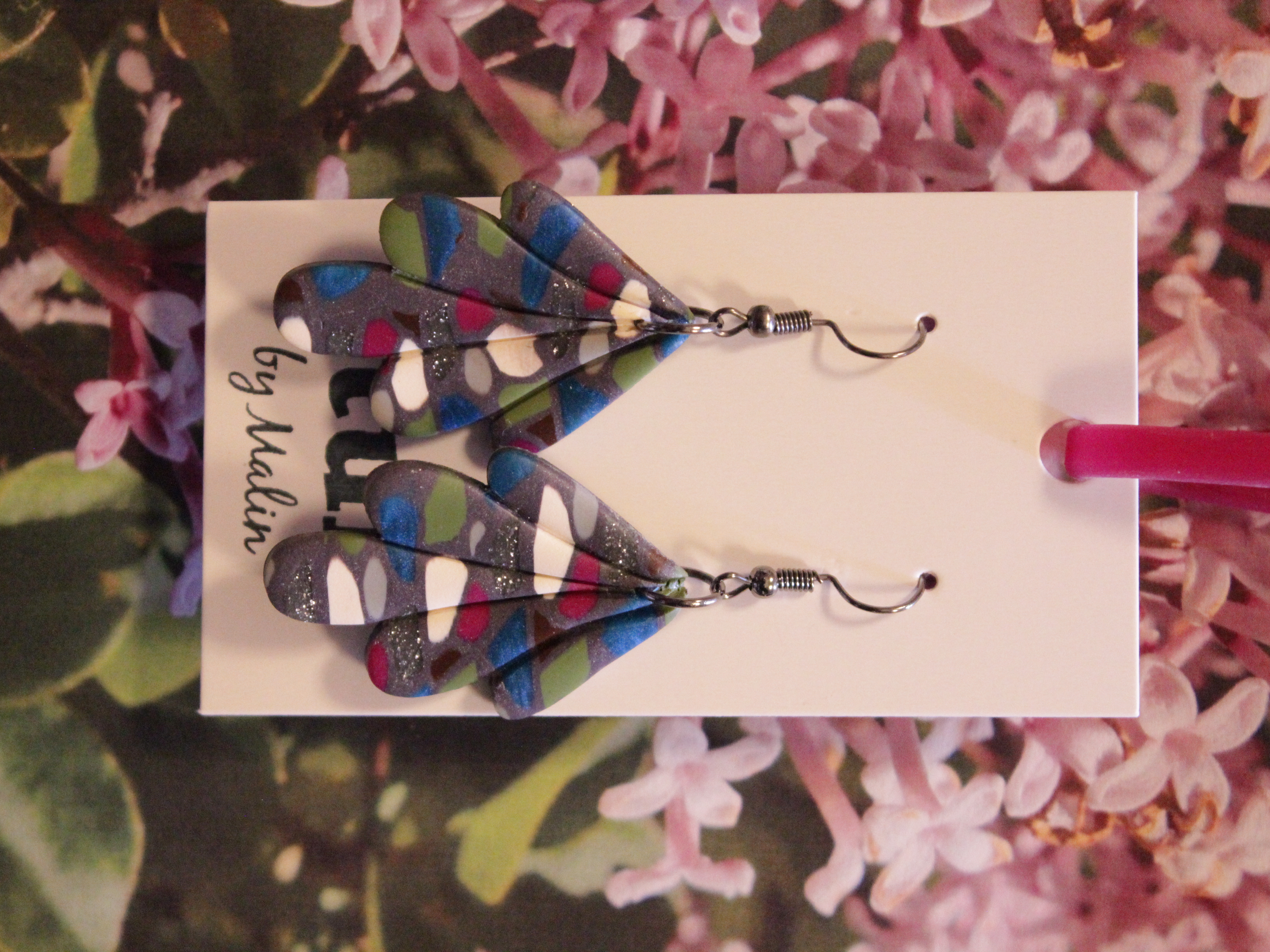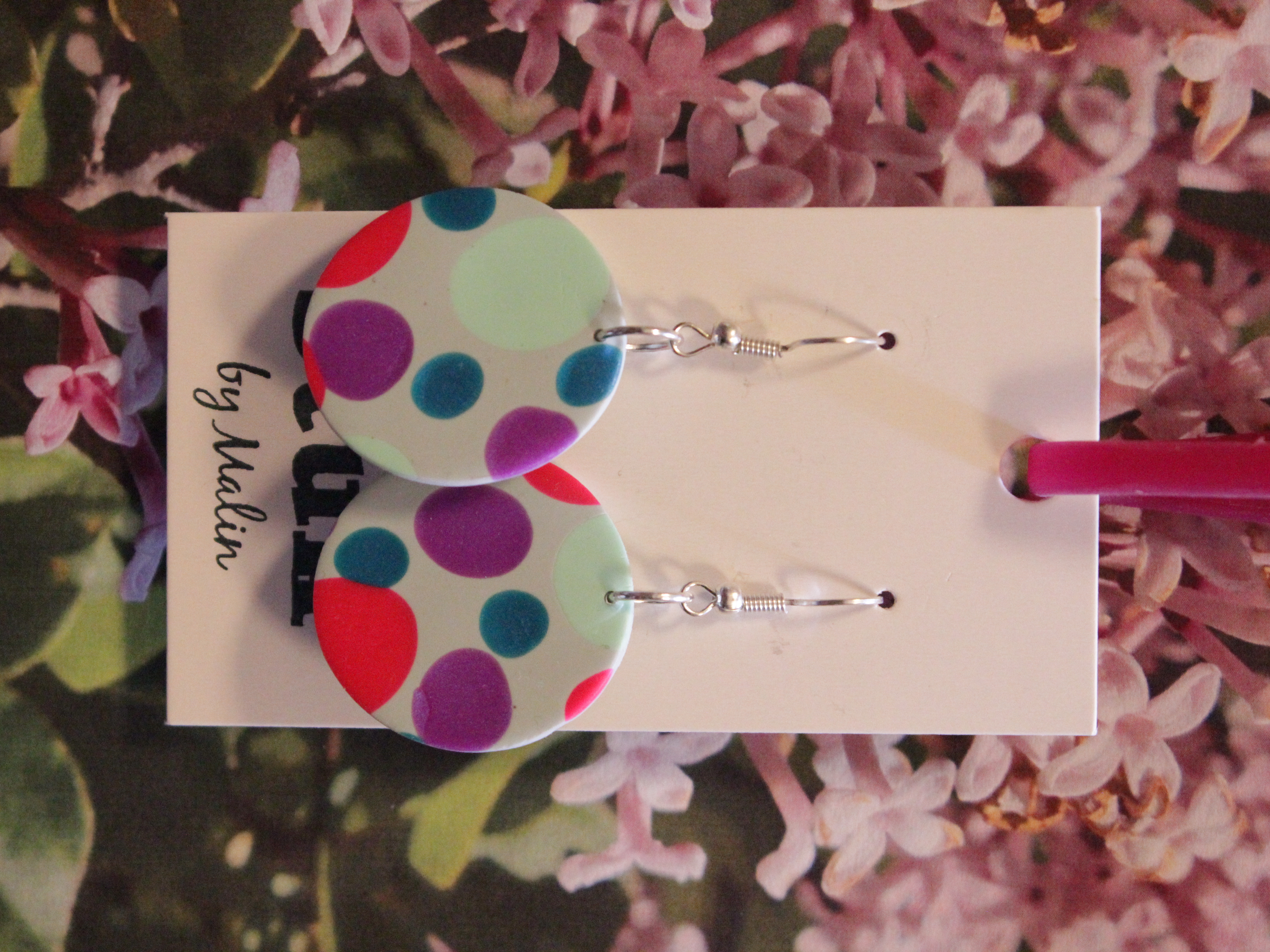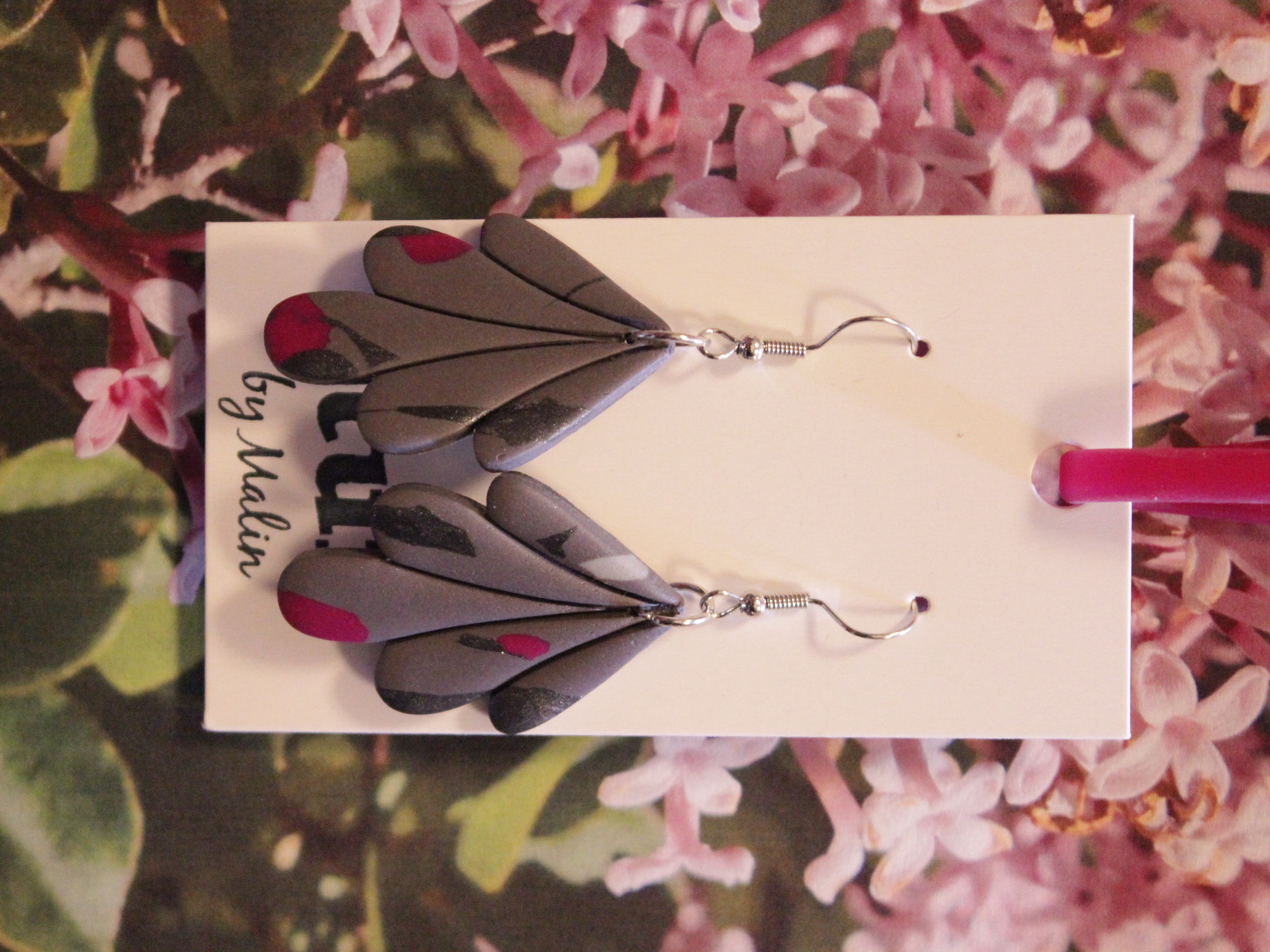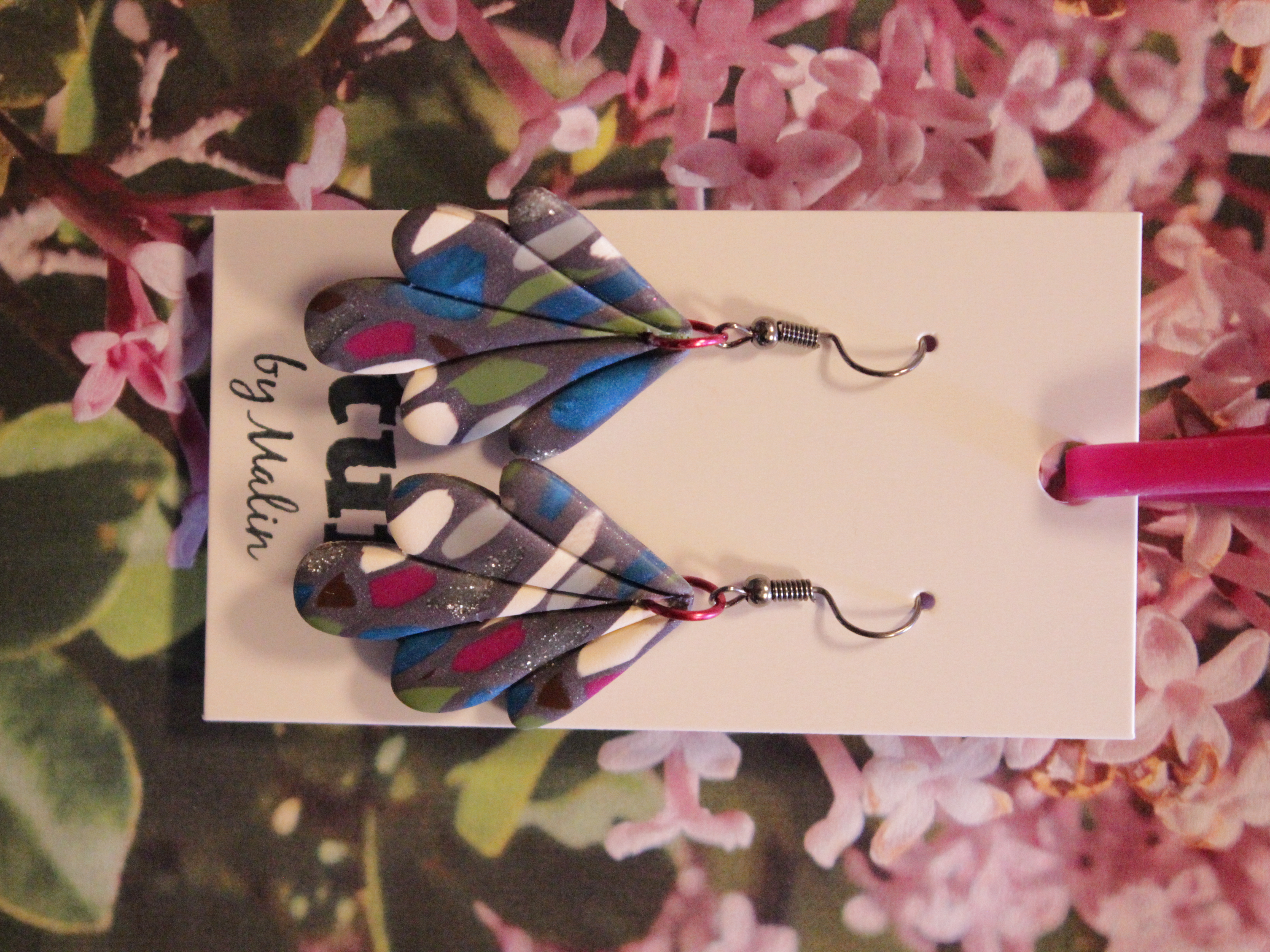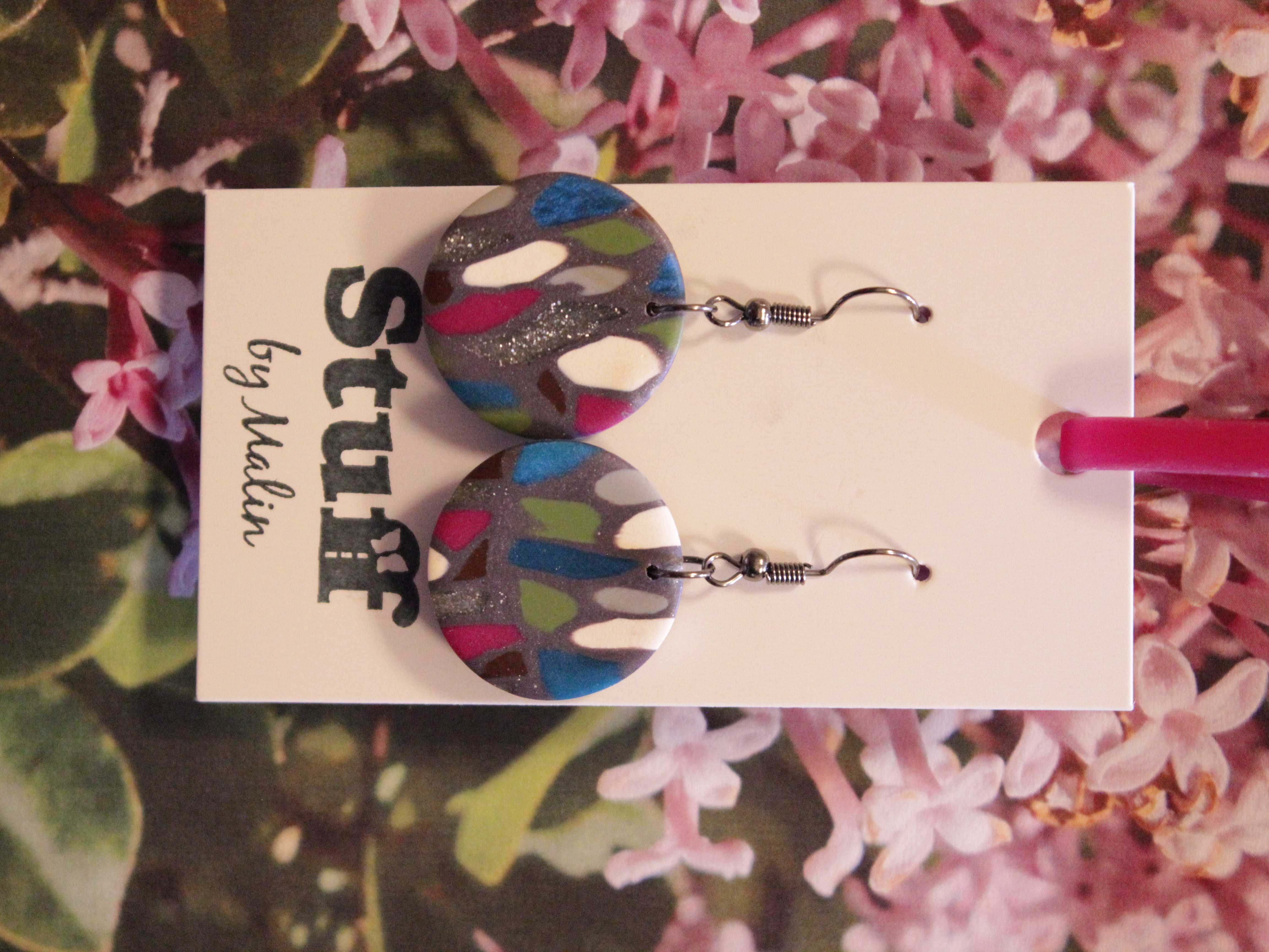 Örhängen tillverkade av polymerlera, pärlor och/eller metallberlocker av olika slag. Alla öronkrokar och stift är nickelfria. Smycken tillverkade av polymerlera är efter härdning i ugn mycket lätta och aningen flexibla.