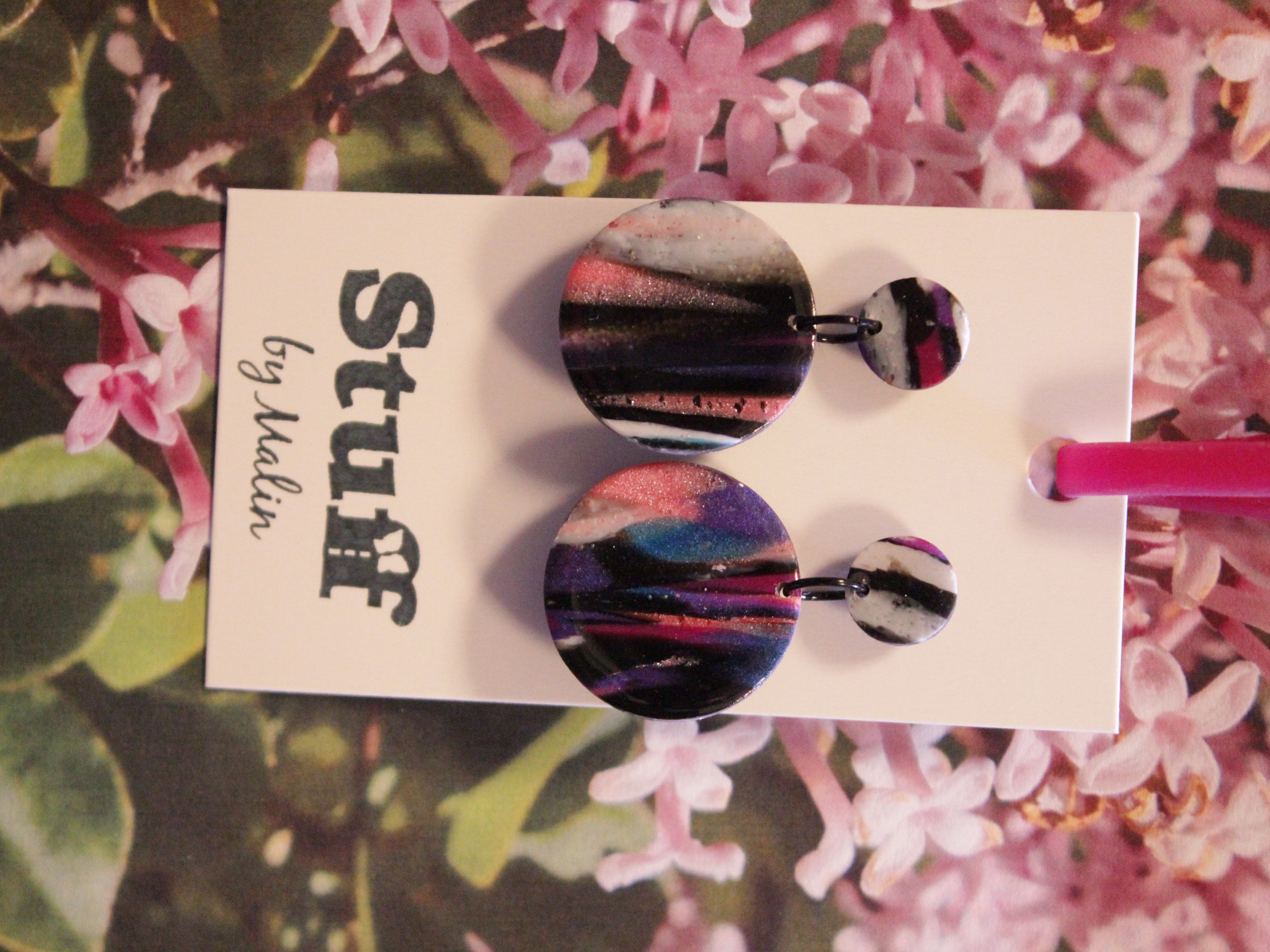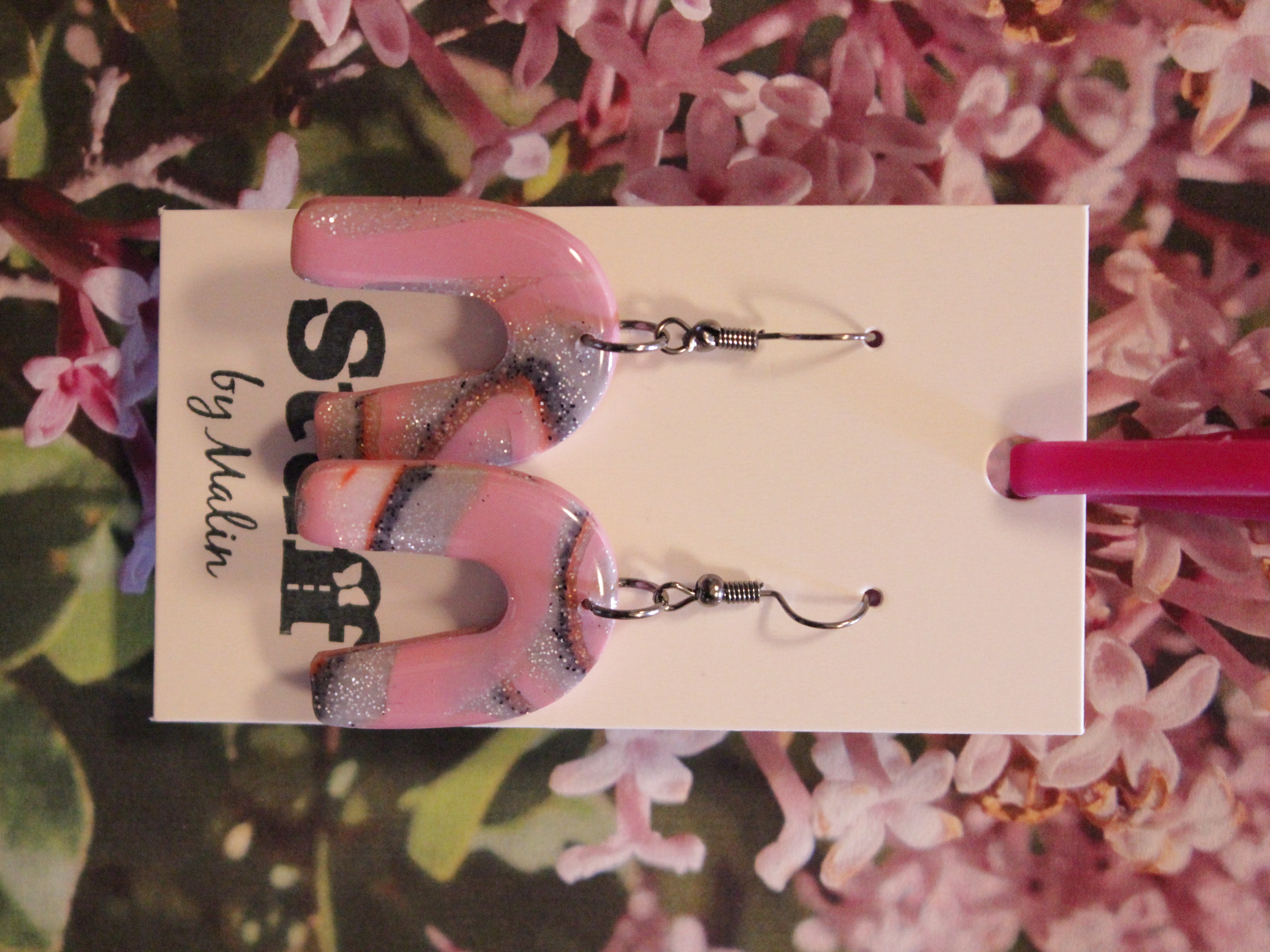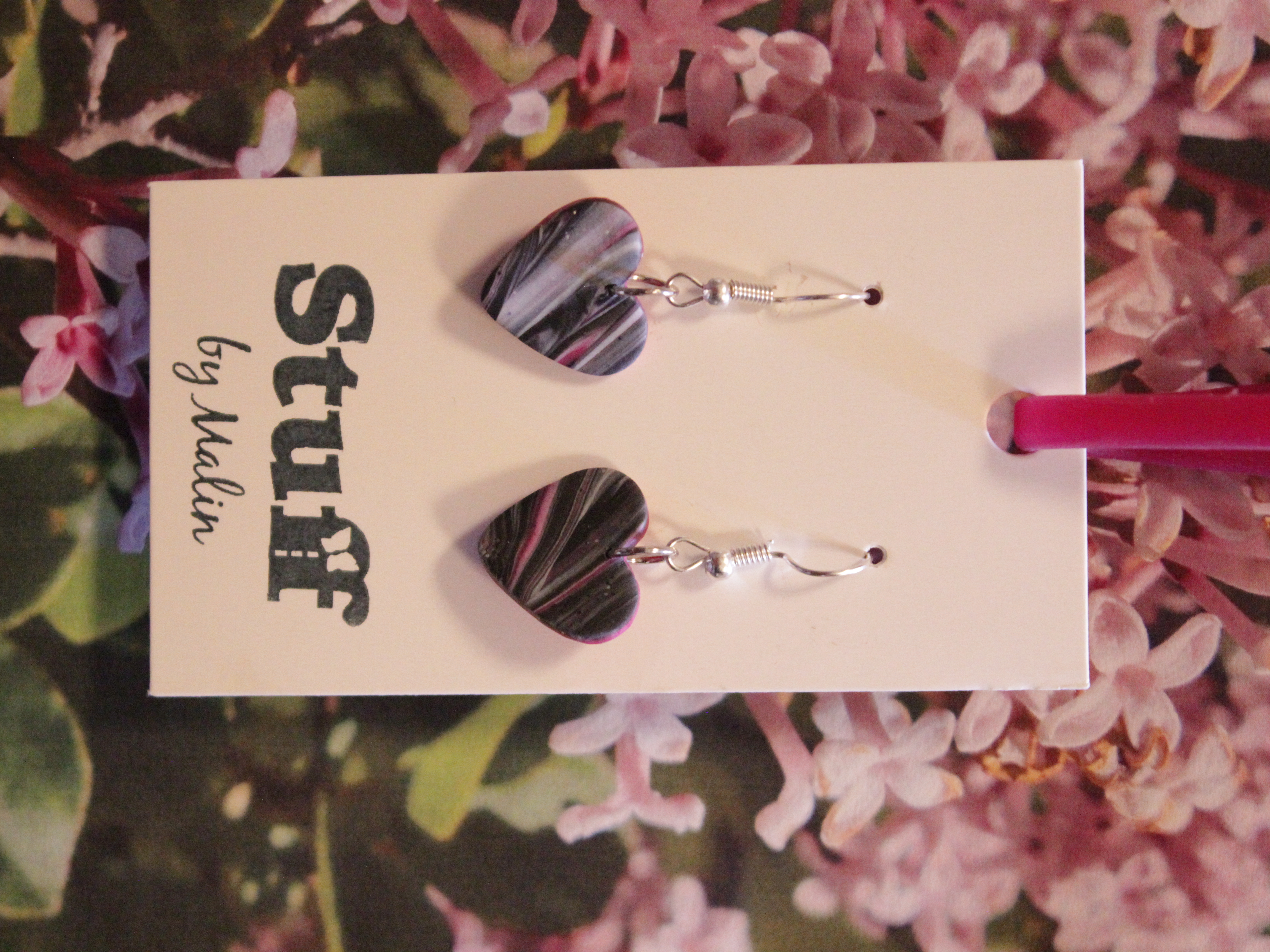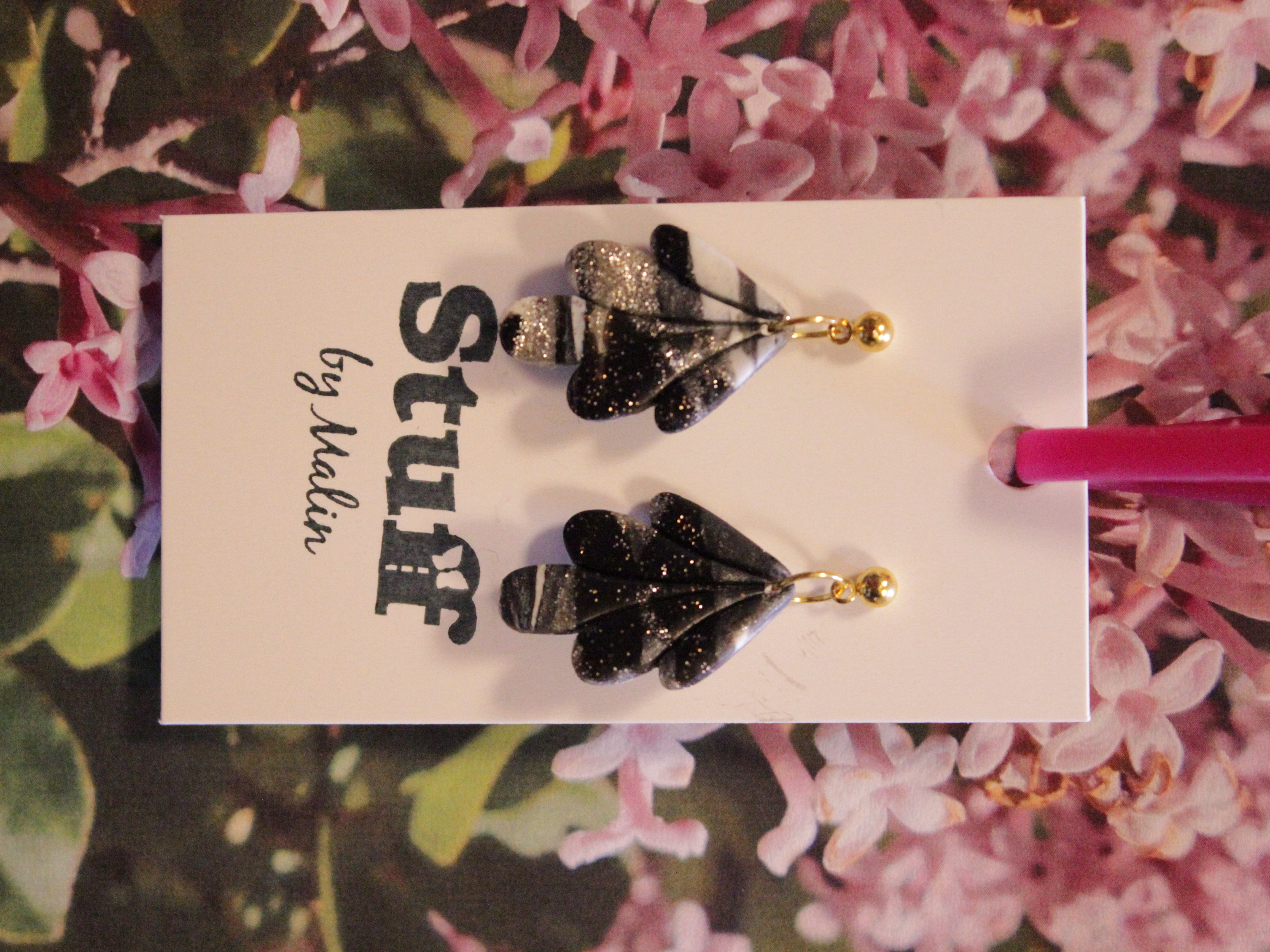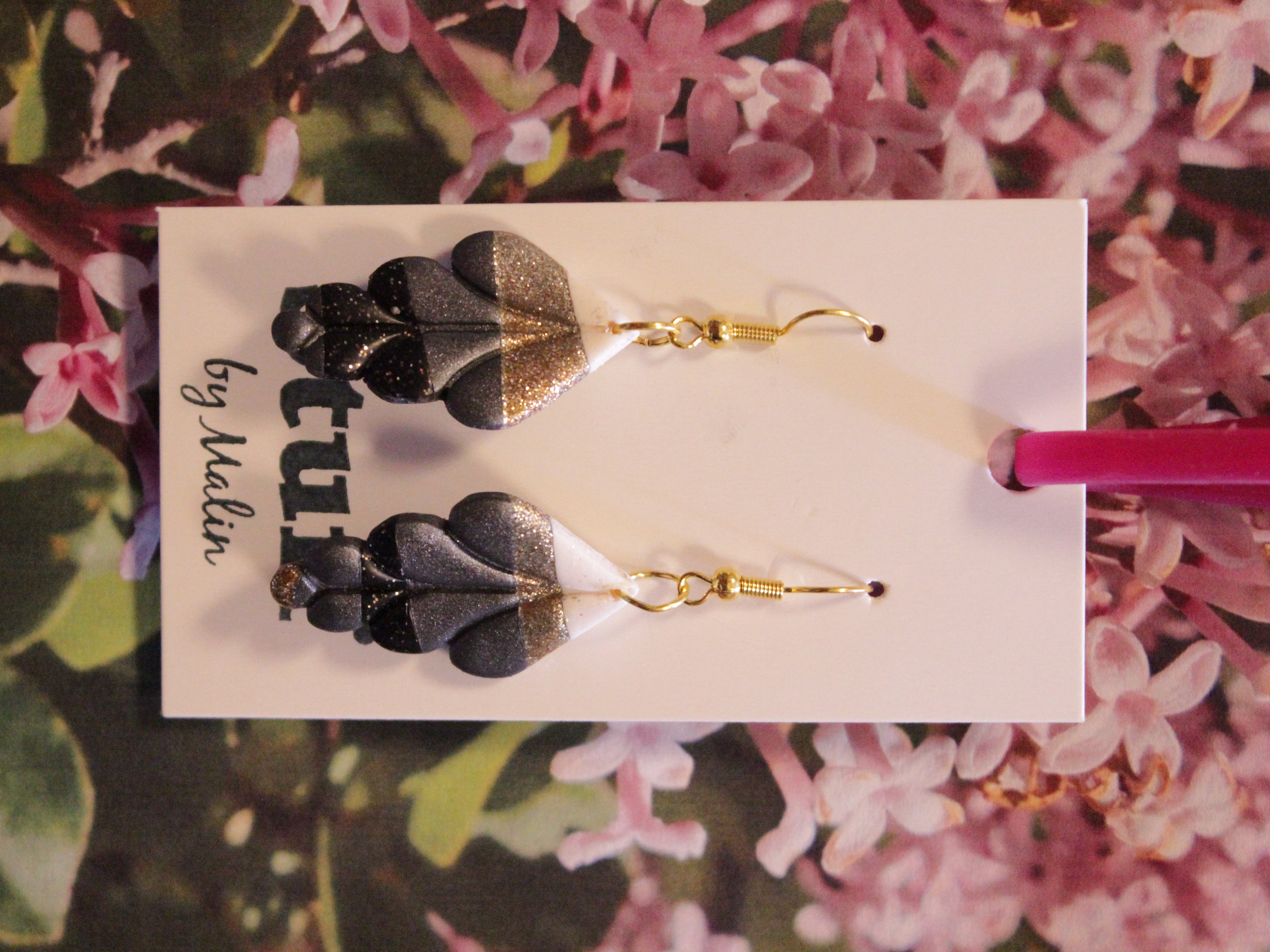 Örhängen tillverkade av polymerlera, pärlor och/eller metallberlocker av olika slag. Alla öronkrokar och stift är nickelfria. Smycken tillverkade av polymerlera är efter härdning i ugn mycket lätta och aningen flexibla.