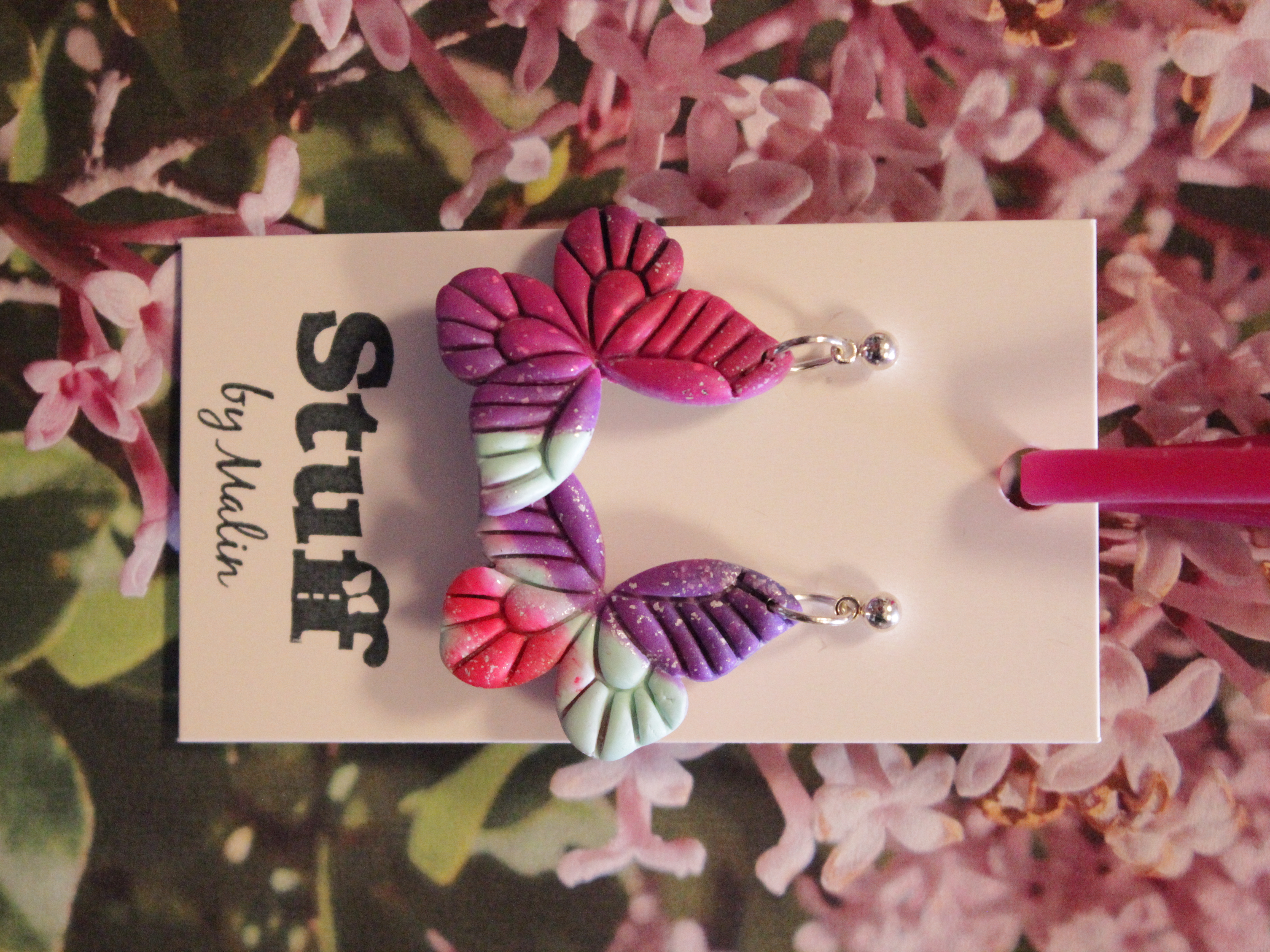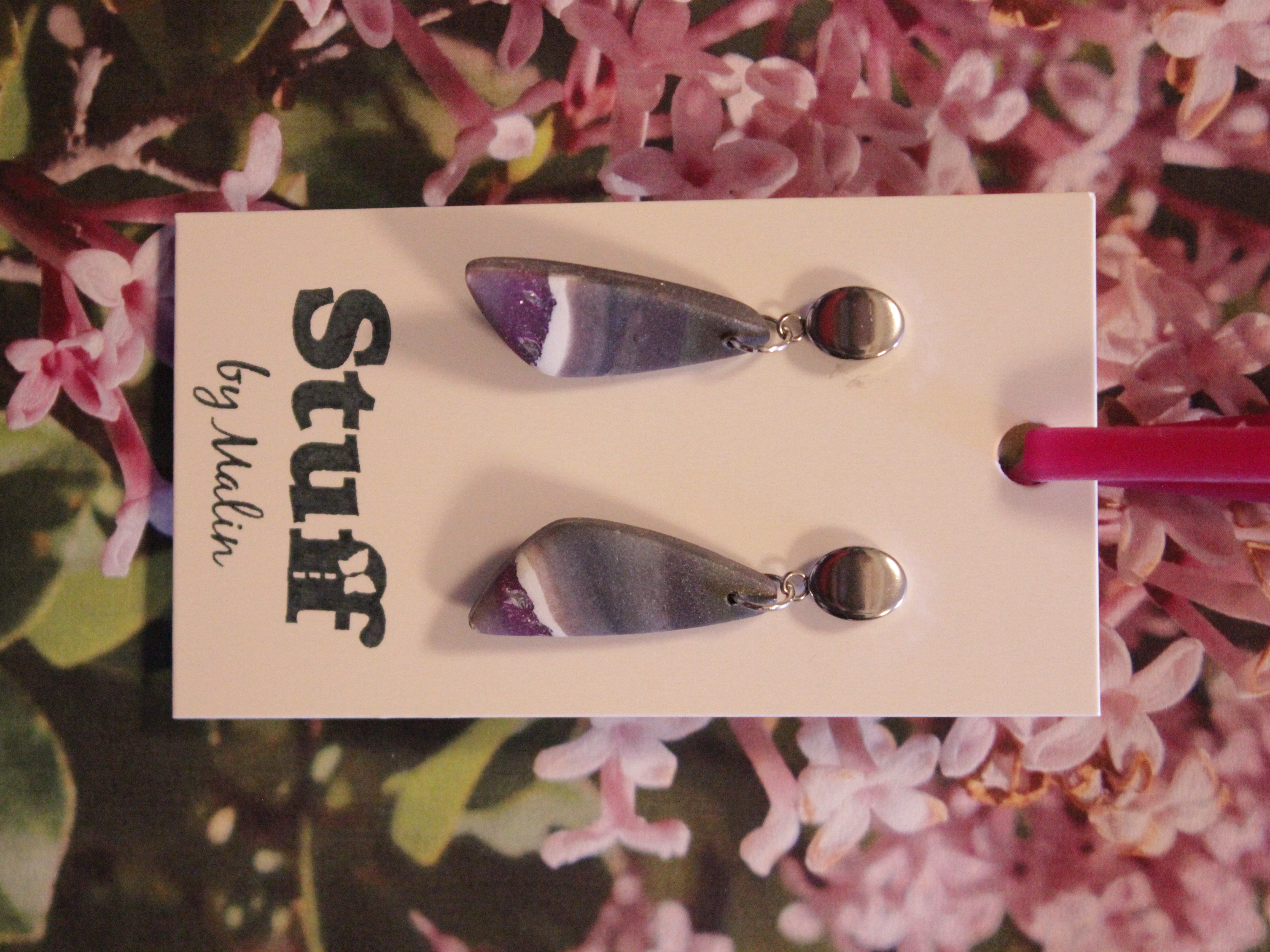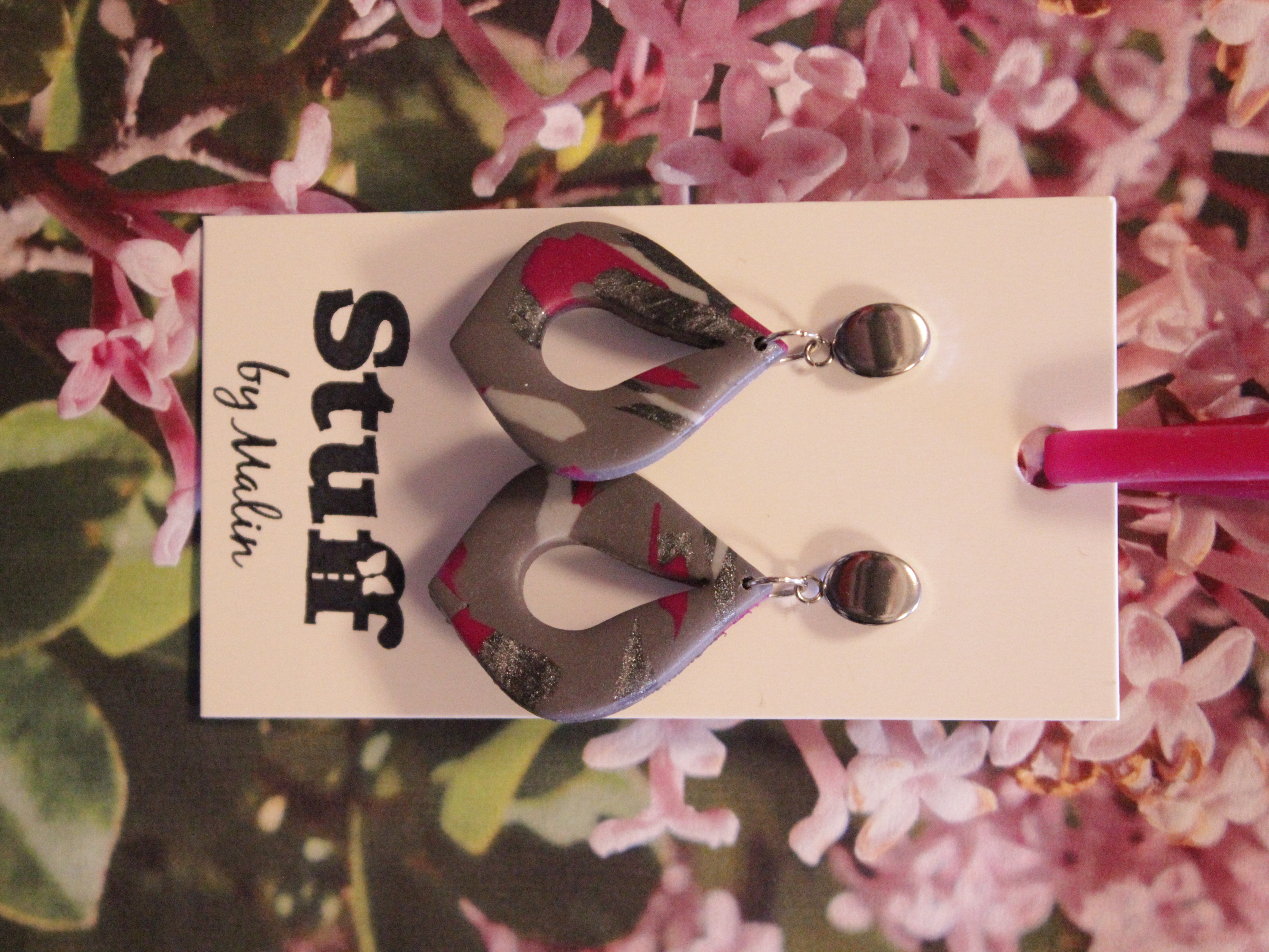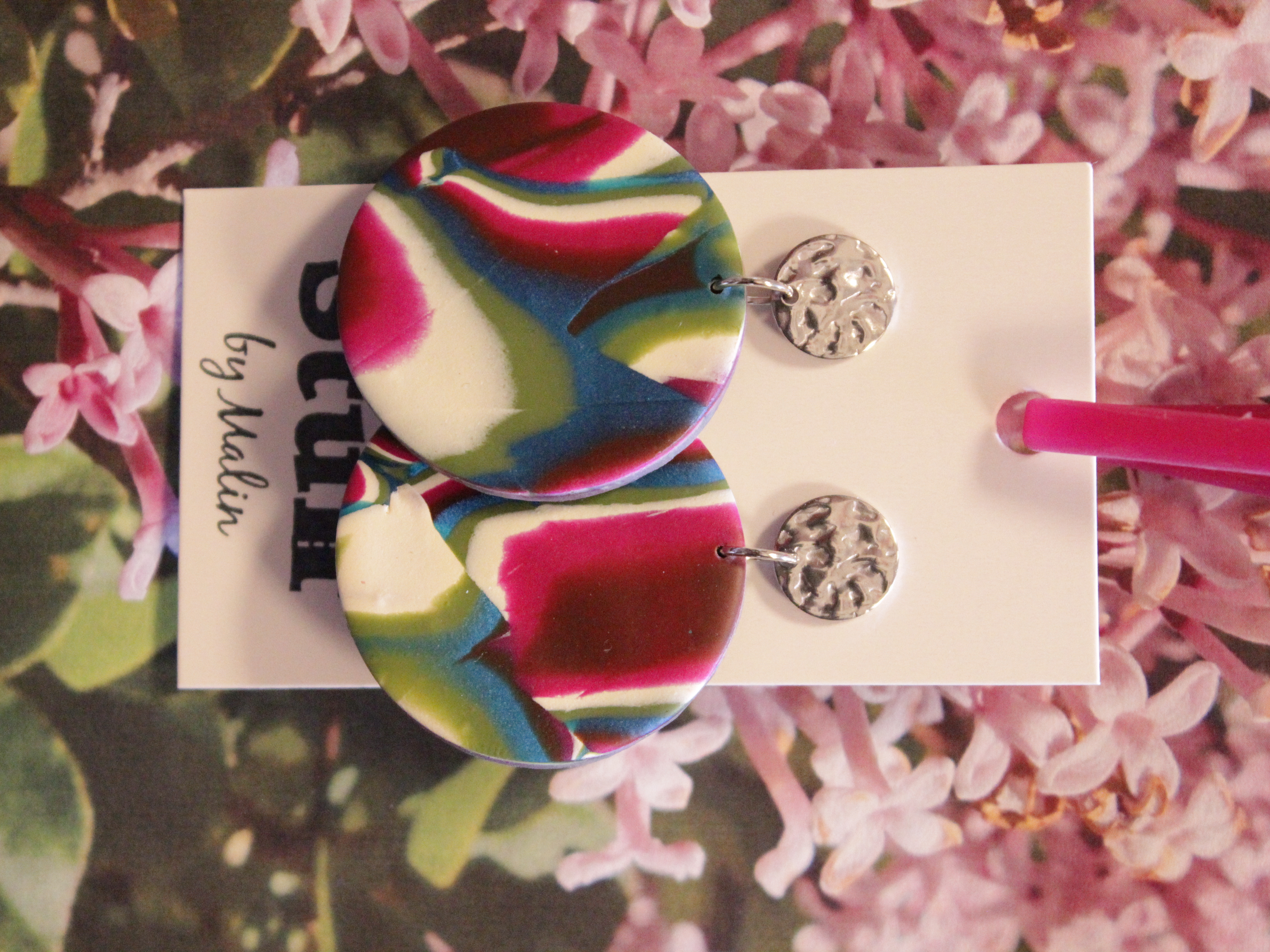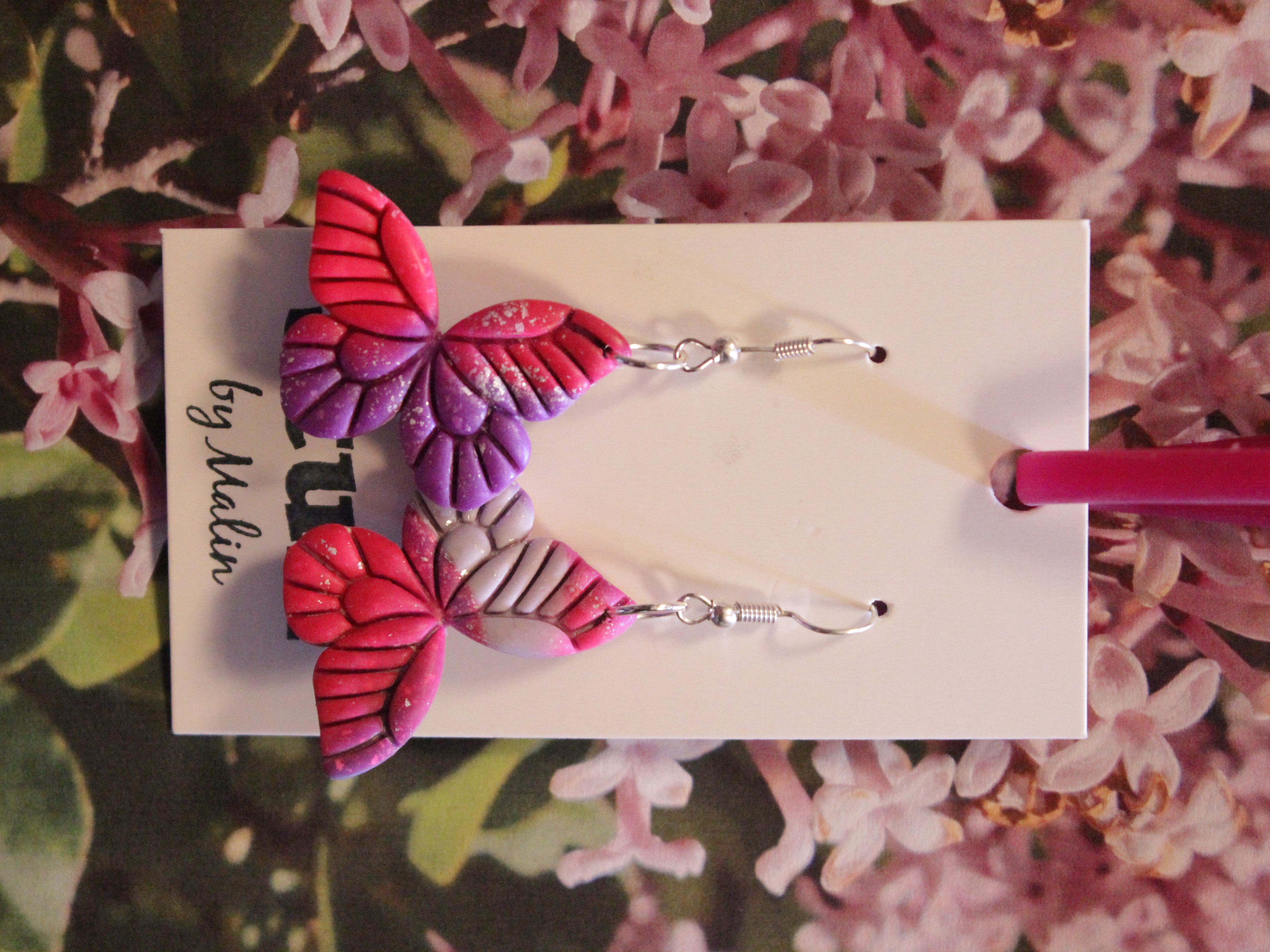 Örhängen tillverkade av polymerlera, pärlor och/eller metallberlocker av olika slag. Alla öronkrokar och stift är nickelfria. Smycken tillverkade av polymerlera är efter härdning i ugn mycket lätta och aningen flexibla.