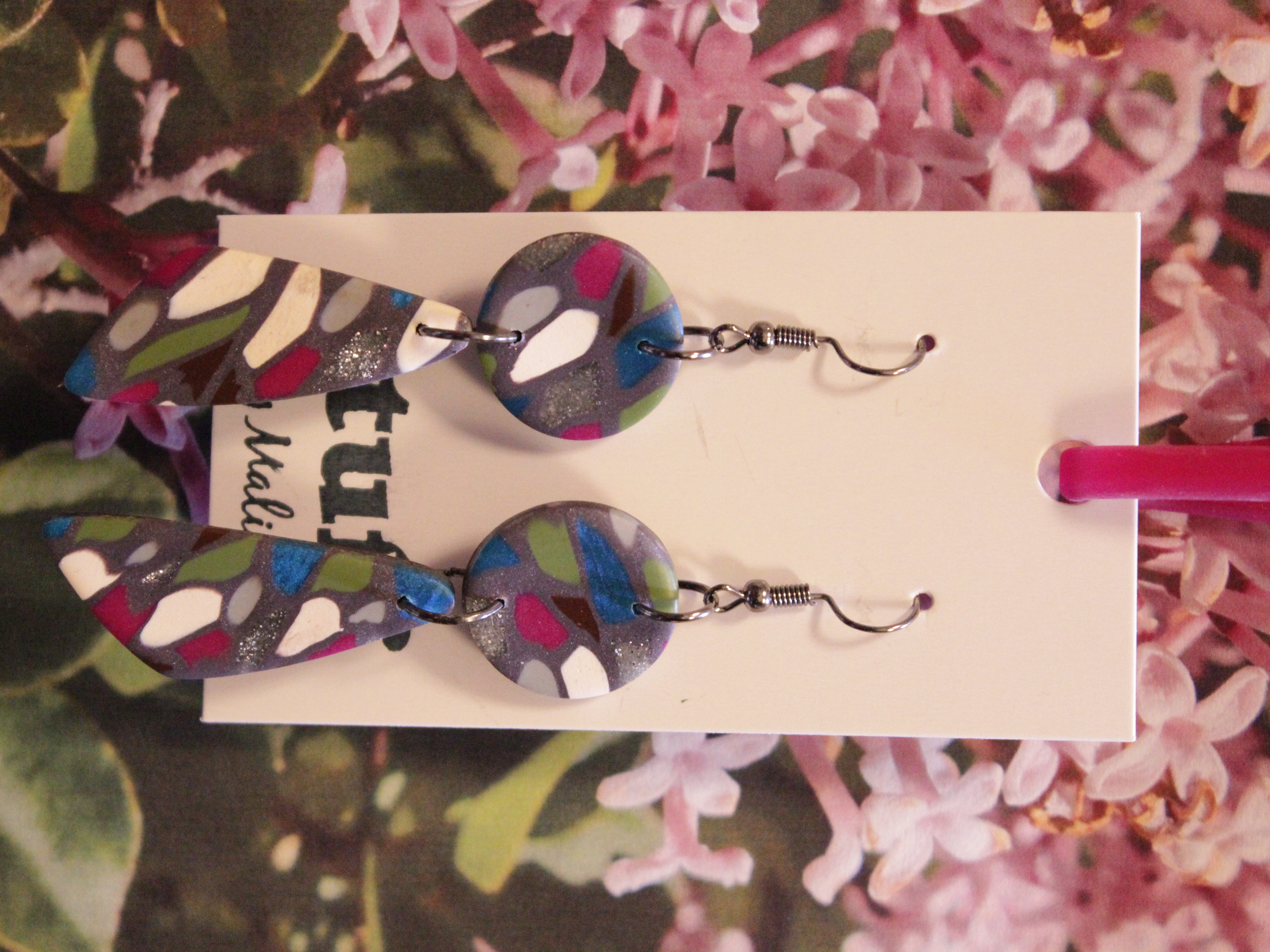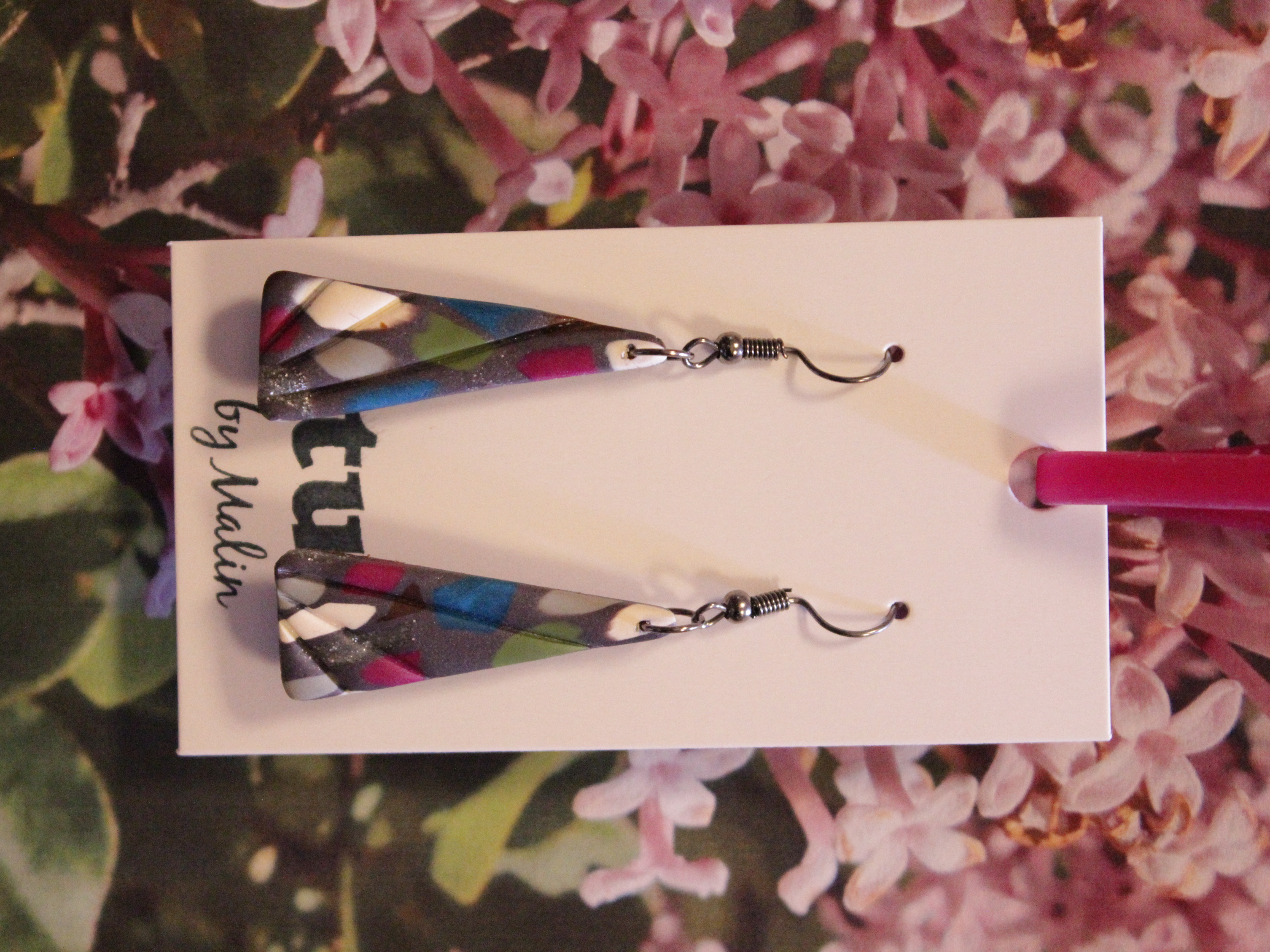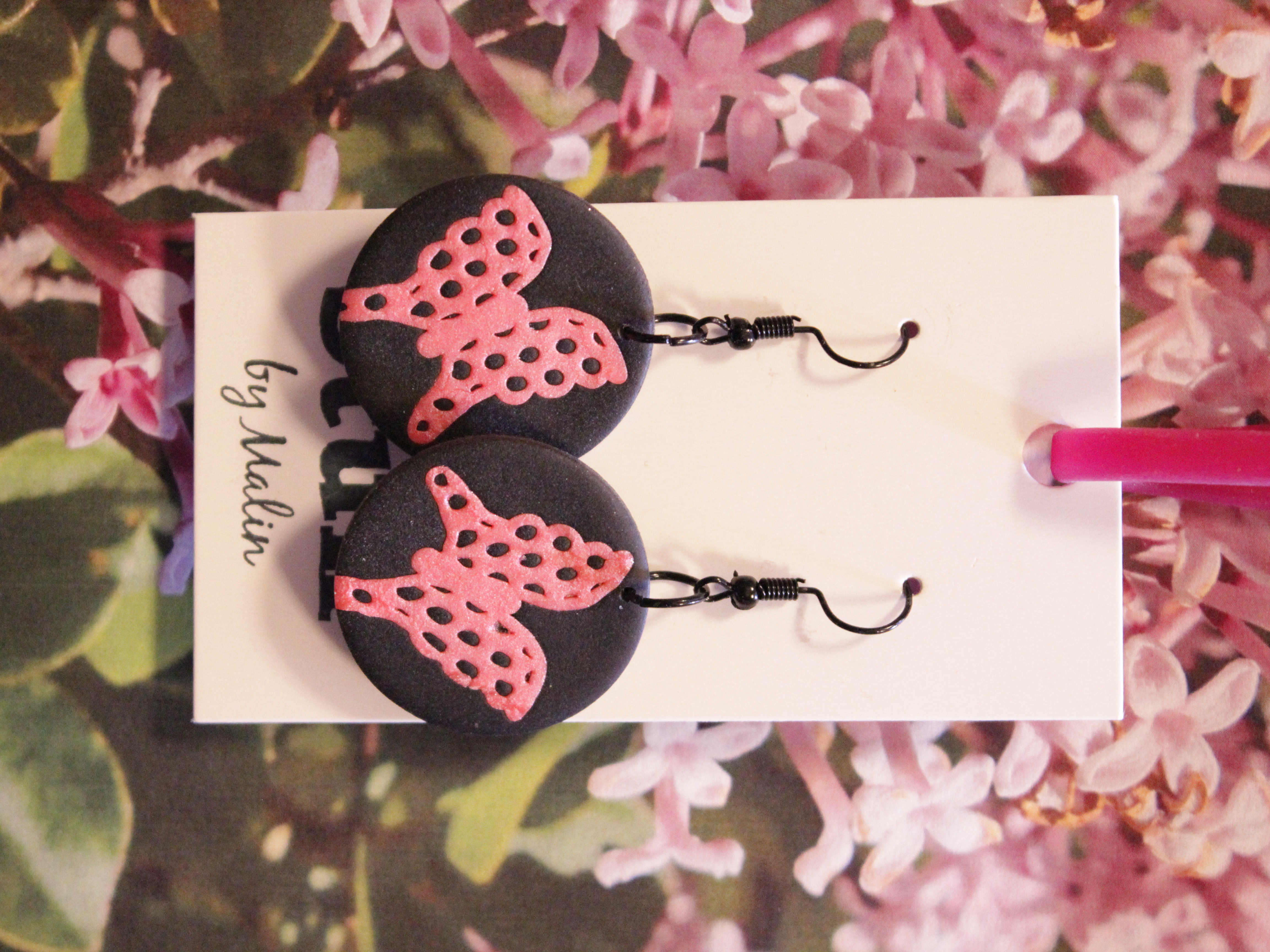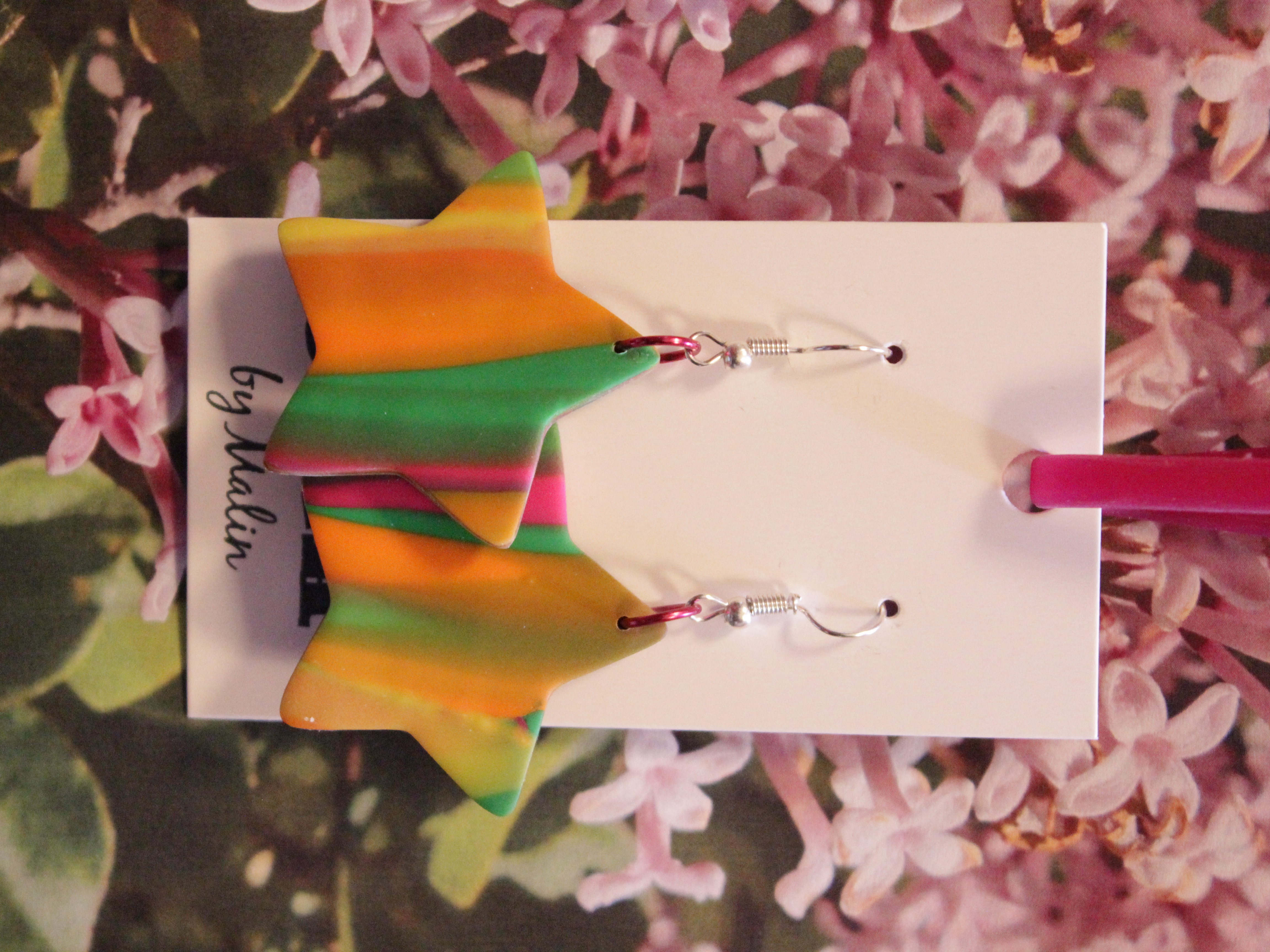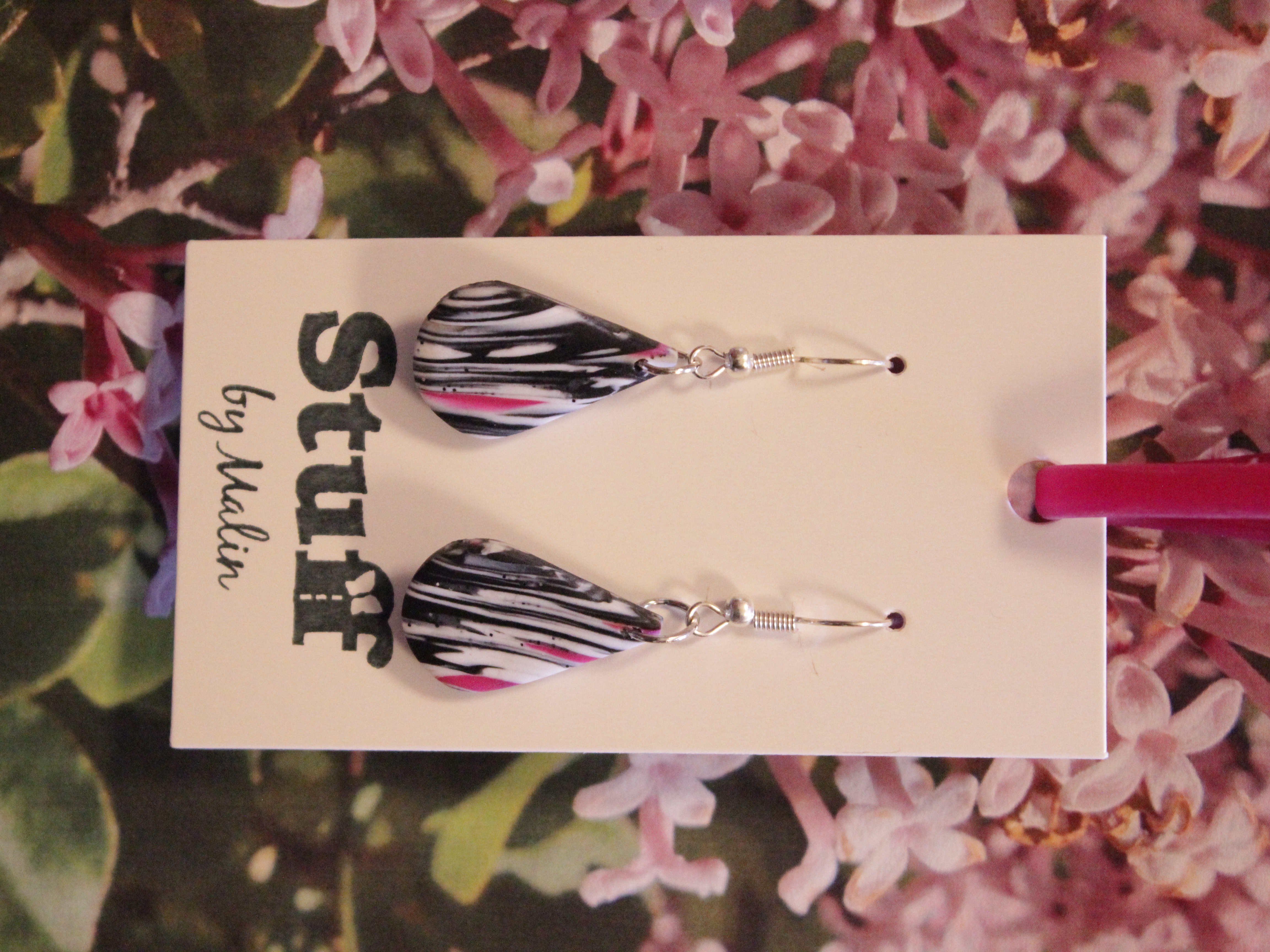 Örhängen tillverkade av polymerlera, pärlor och/eller metallberlocker av olika slag. Alla öronkrokar och stift är nickelfria. Smycken tillverkade av polymerlera är efter härdning i ugn mycket lätta och aningen flexibla.