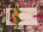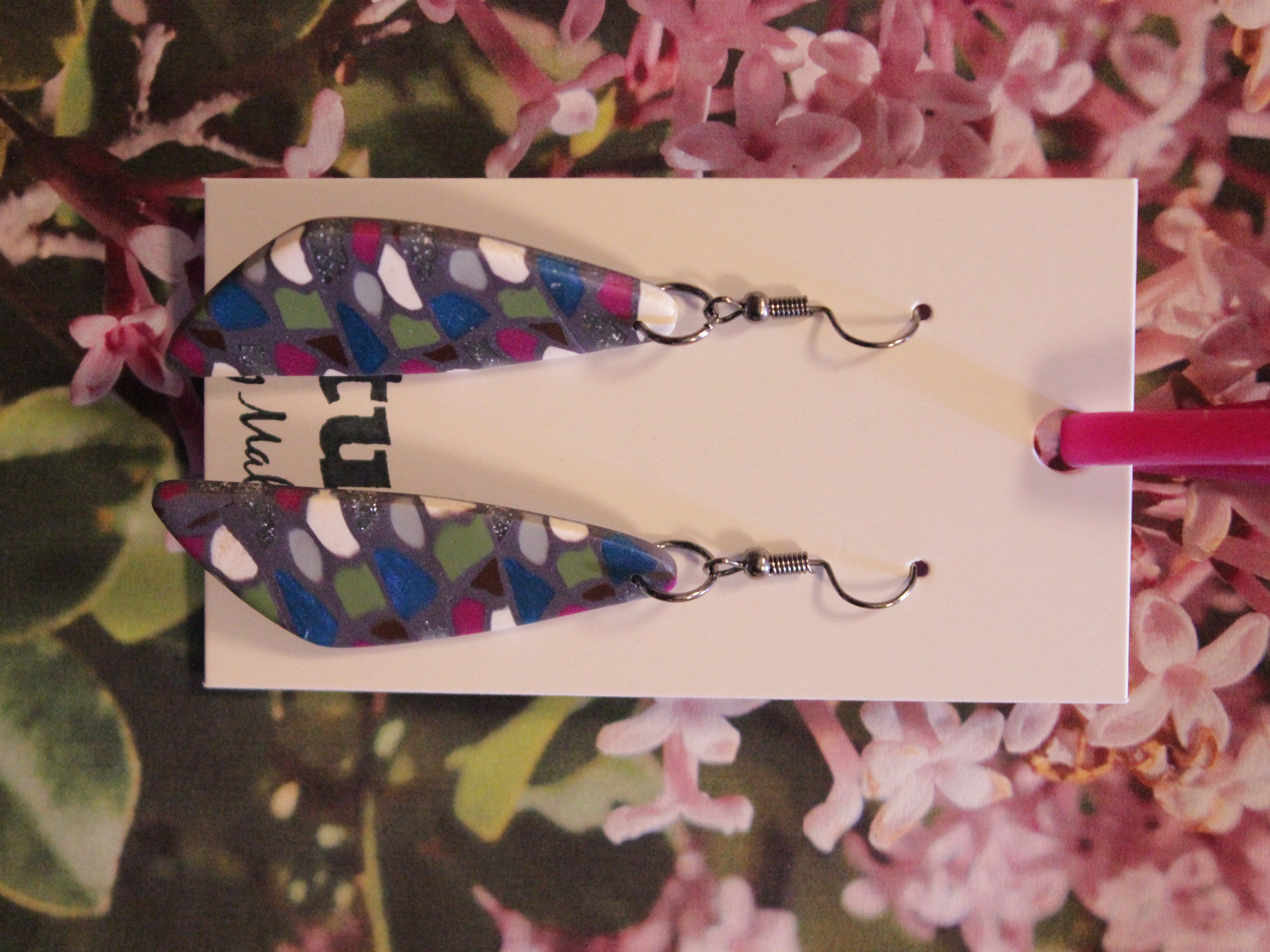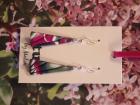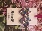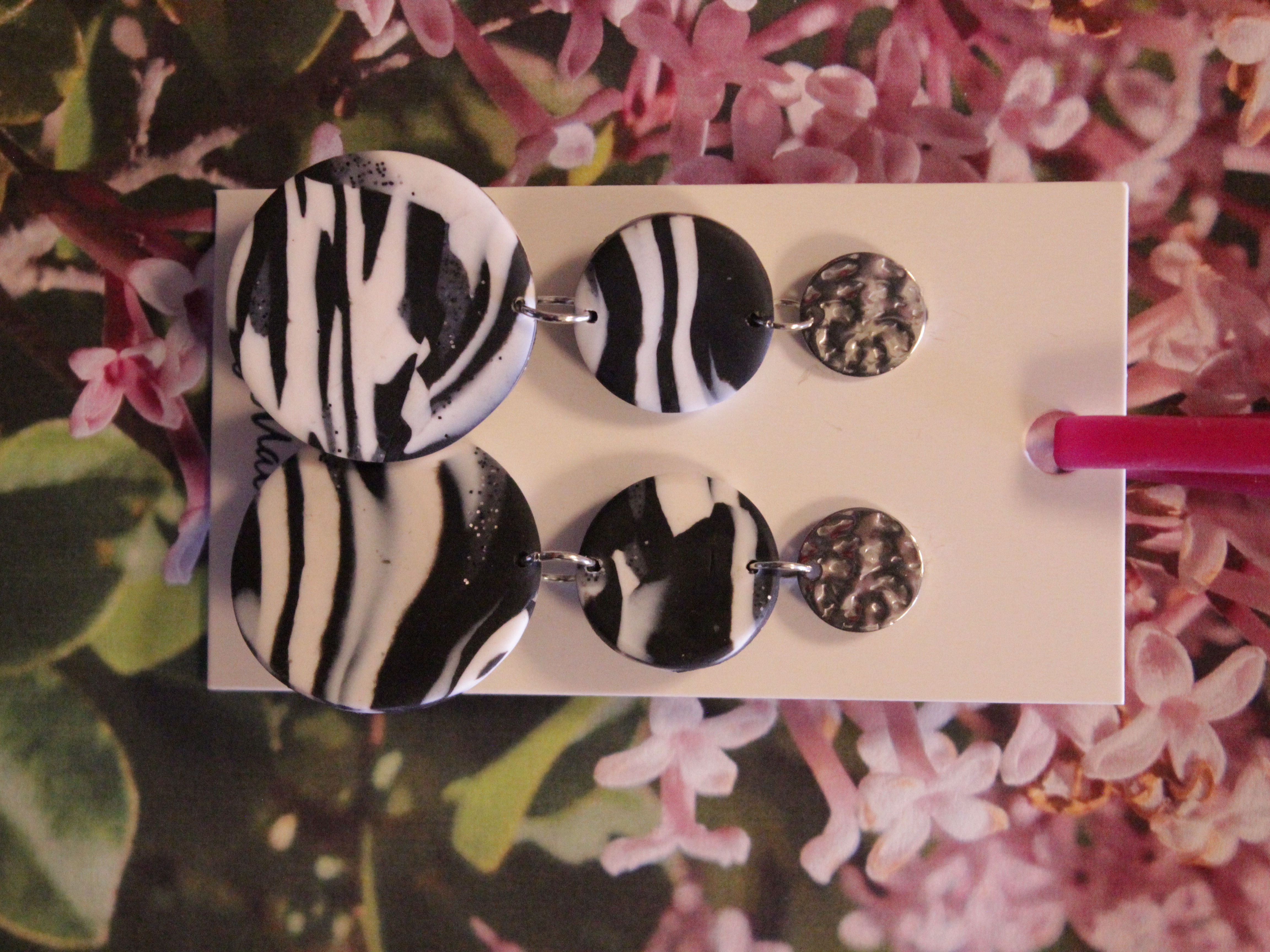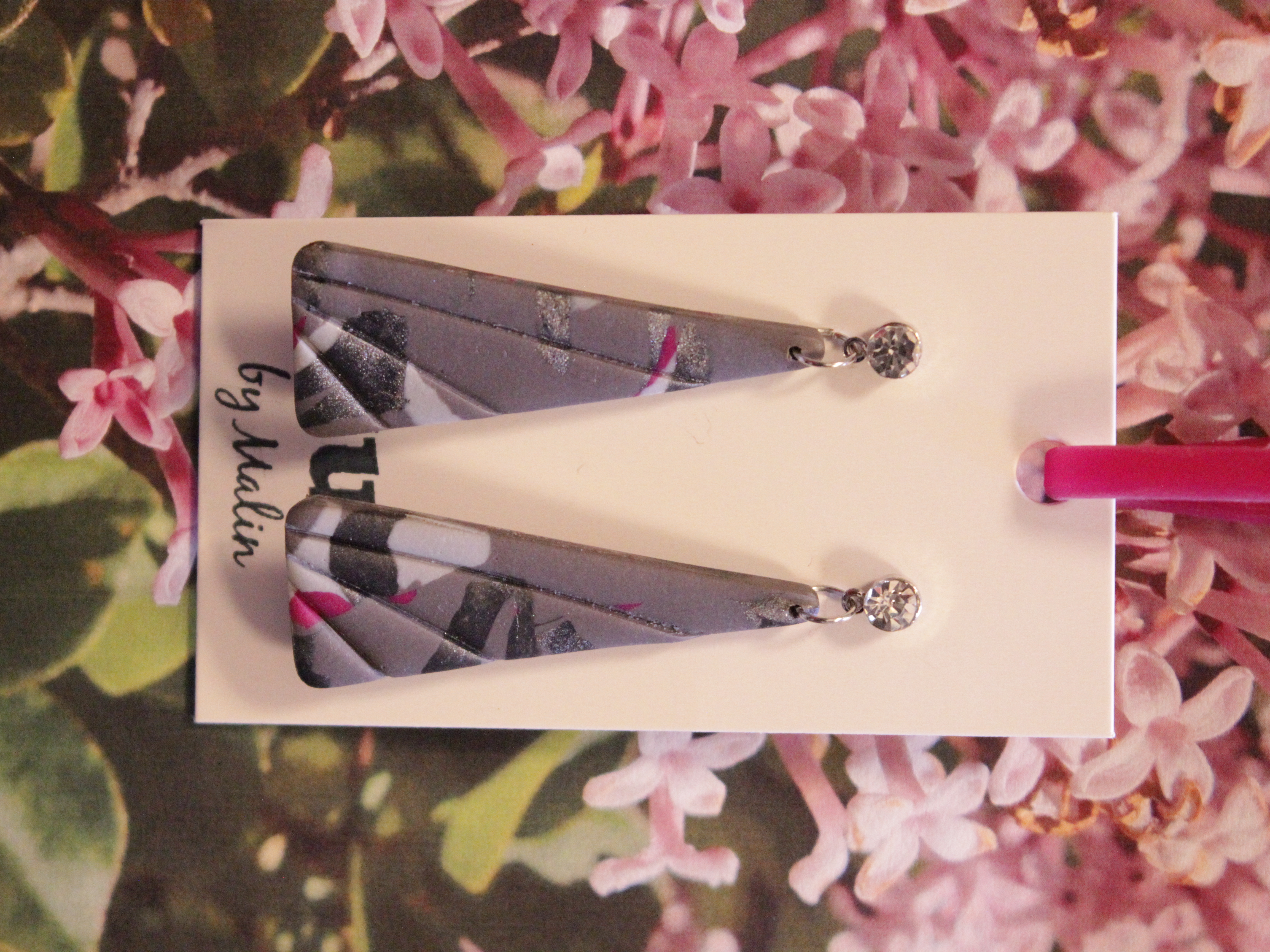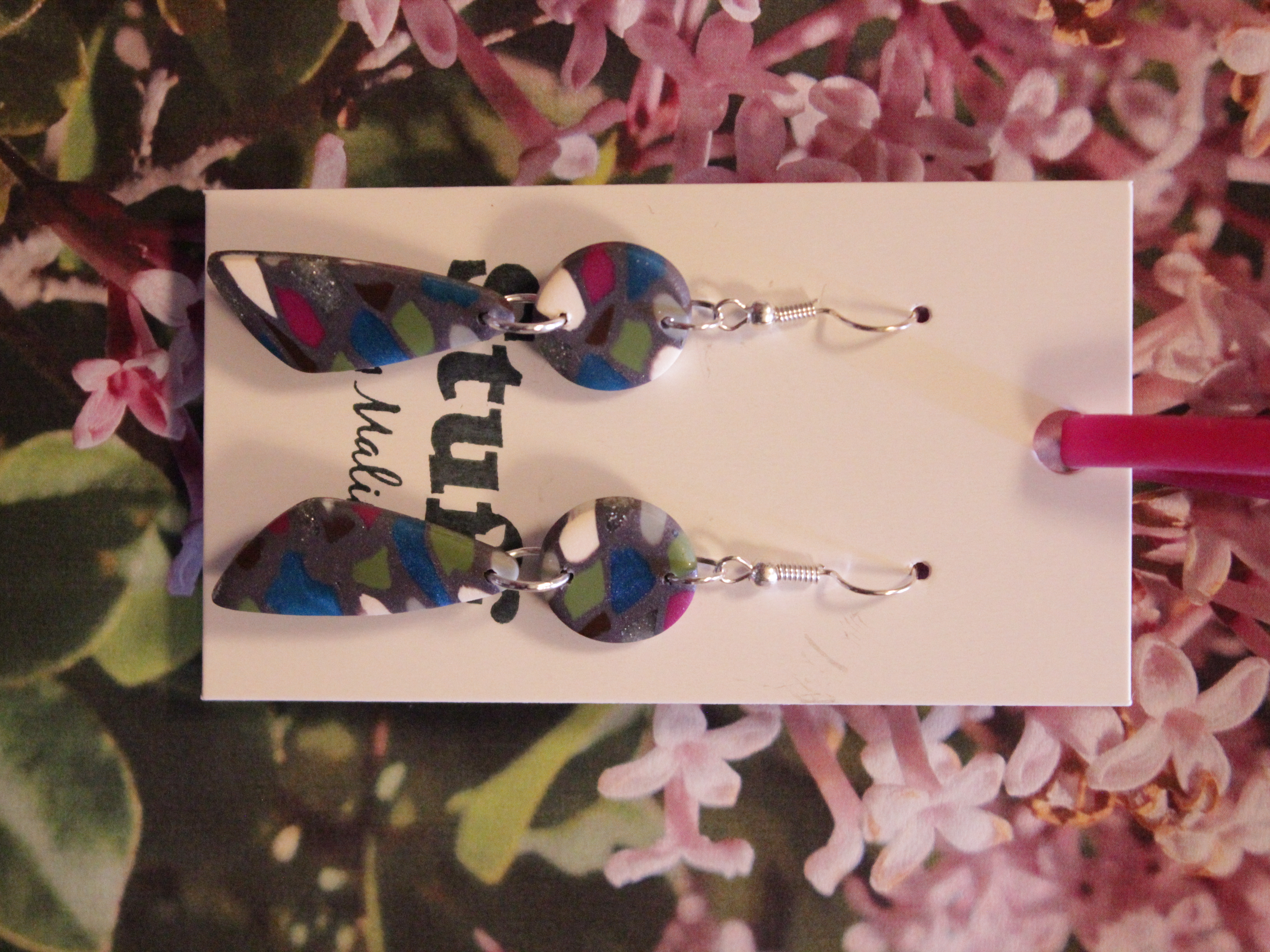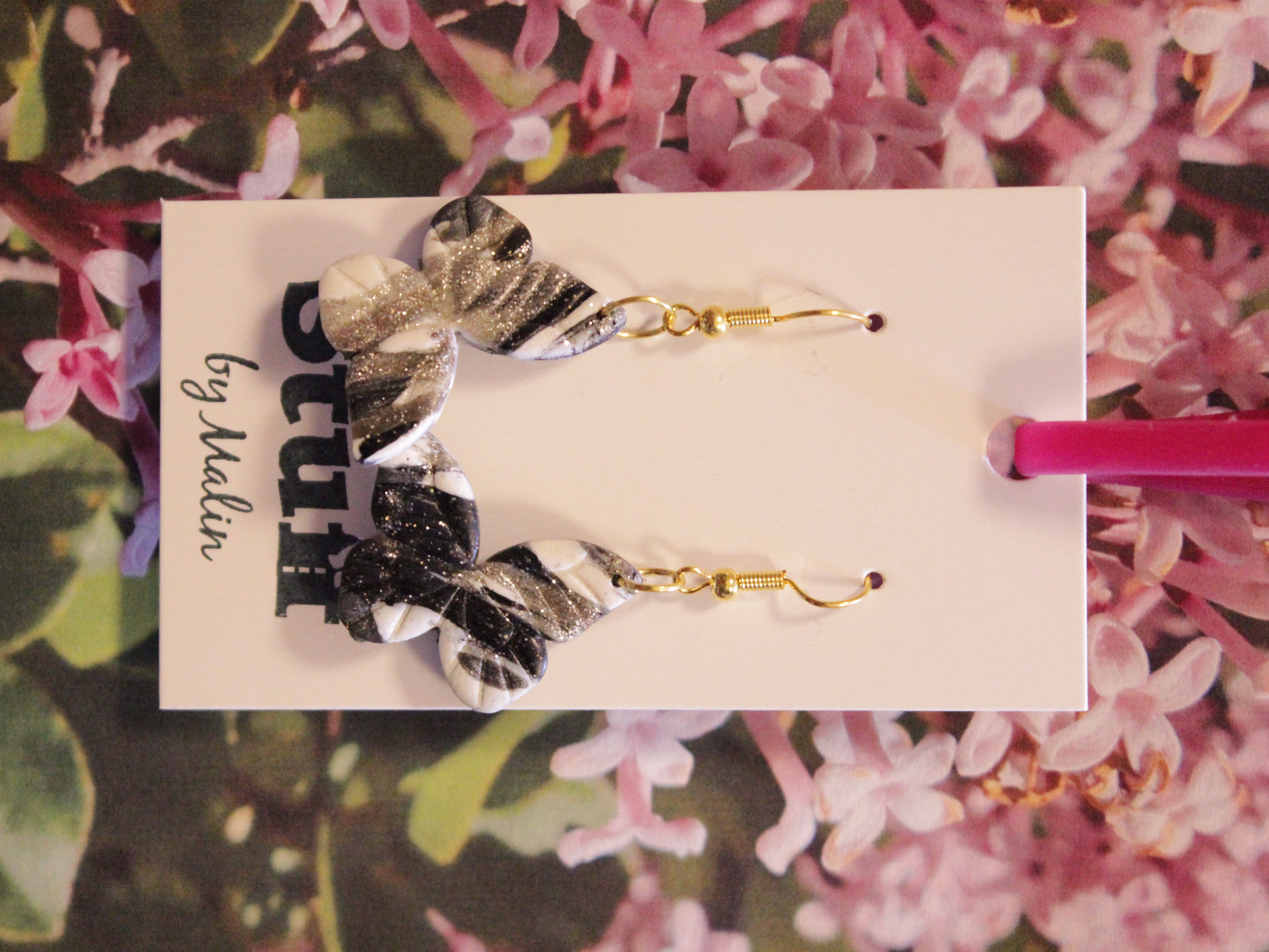 Örhängen tillverkade av polymerlera, pärlor och/eller metallberlocker av olika slag. Alla öronkrokar och stift är nickelfria. Smycken tillverkade av polymerlera är efter härdning i ugn mycket lätta och aningen flexibla.